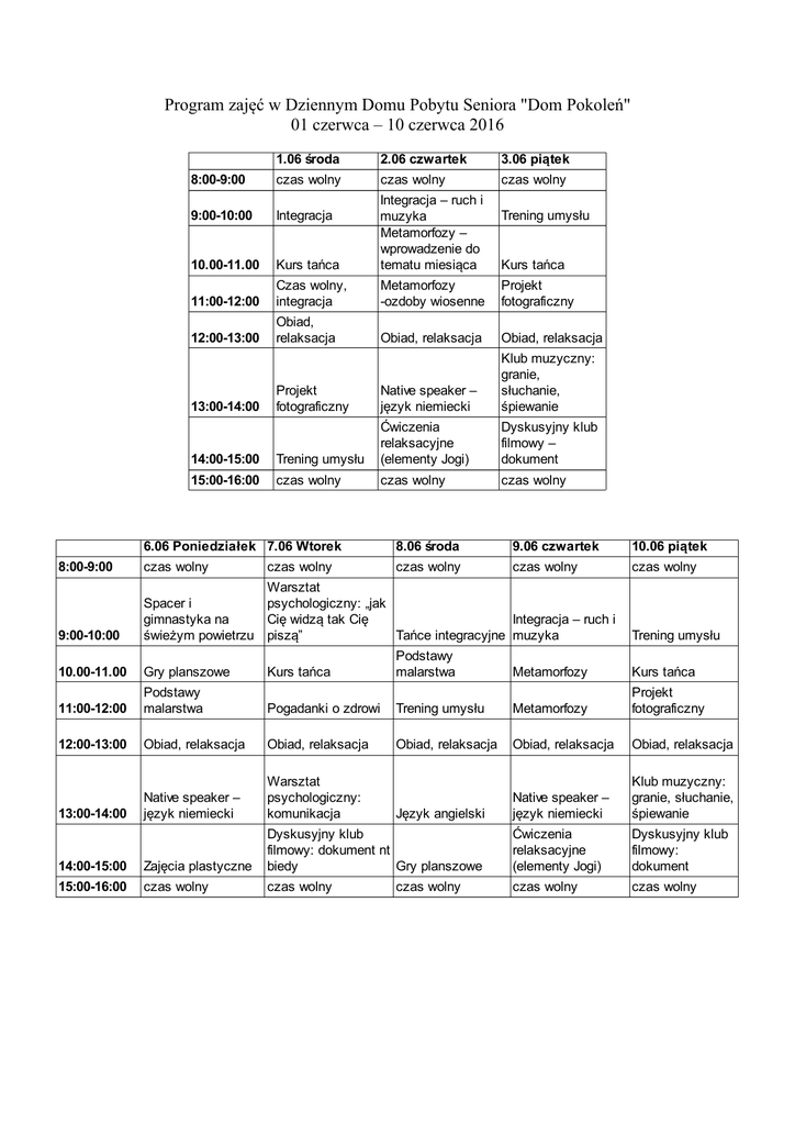 Program zajęć w Dziennym Domu Pobytu Seniora "Dom Pokoleń" 01 czerwca – 10 czerwca 2016 1.06 środa 2.06 czwartek 3.06 piątek 8:00-9:00 czas wolny czas wolny 9:00-10:00 Integracja 10.00-11.00 Kurs tańca czas wolny Integracja – ruch i muzyka Metamorfozy – wprowadzenie do tematu miesiąca 11:00-12:00 Czas wolny, integracja Metamorfozy -ozdoby wiosenne Projekt fotograficzny 12:00-13:00 Obiad, relaksacja Obiad, relaksacja Obiad, relaksacja Projekt fotograficzny Native speaker – język niemiecki Klub muzyczny: granie, słuchanie, śpiewanie 14:00-15:00 Trening umysłu Ćwiczenia relaksacyjne (elementy Jogi) Dyskusyjny klub filmowy – dokument 15:00-16:00 czas wolny czas wolny czas wolny 13:00-14:00 Trening umysłu Kurs tańca 6.06 Poniedziałek 7.06 Wtorek 8.06 środa 9.06 czwartek 10.06 piątek 8:00-9:00 czas wolny czas wolny czas wolny czas wolny 9:00-10:00 Warsztat Spacer i psychologiczny: „jak gimnastyka na Cię widzą tak Cię Integracja – ruch i świeżym powietrzu piszą” Tańce integracyjne muzyka 10.00-11.00 Gry planszowe Kurs tańca Podstawy malarstwa Metamorfozy Kurs tańca 11:00-12:00 Podstawy malarstwa Pogadanki o zdrowi Trening umysłu Metamorfozy Projekt fotograficzny 12:00-13:00 Obiad, relaksacja Obiad, relaksacja Obiad, relaksacja Obiad, relaksacja Obiad, relaksacja 13:00-14:00 Native speaker – język niemiecki Warsztat psychologiczny: komunikacja Język angielski Native speaker – język niemiecki Klub muzyczny: granie, słuchanie, śpiewanie 14:00-15:00 Zajęcia plastyczne Dyskusyjny klub filmowy: dokument nt biedy Gry planszowe Ćwiczenia relaksacyjne (elementy Jogi) Dyskusyjny klub filmowy: dokument 15:00-16:00 czas wolny czas wolny czas wolny czas wolny czas wolny czas wolny Trening umysłu