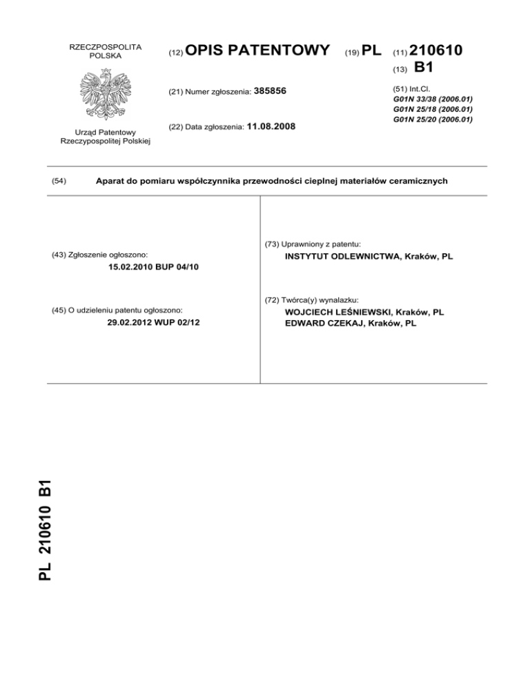 RZECZPOSPOLITA POLSKA (12) OPIS PATENTOWY (19) (21) Numer zgłoszenia: 385856 Urząd Patentowy Rzeczypospolitej Polskiej (54) (22) Data zgłoszenia: 11.08.2008 PL 210610 (13) B1 (11) (51) Int.Cl. G01N 33/38 (2006.01) G01N 25/18 (2006.01) G01N 25/20 (2006.01) Aparat do pomiaru współczynnika przewodności cieplnej materiałów ceramicznych (73) Uprawniony z patentu: (43) Zgłoszenie ogłoszono: INSTYTUT ODLEWNICTWA, Kraków, PL 15.02.2010 BUP 04/10 (72) Twórca(y) wynalazku: (45) O udzieleniu patentu ogłoszono: PL 210610 B1 29.02.2012 WUP 02/12 WOJCIECH LEŚNIEWSKI, Kraków, PL EDWARD CZEKAJ, Kraków, PL 2 PL 210 610 B1 Opis wynalazku Przedmiotem wynalazku jest aparat do pomiaru współczynnika przewodności cieplnej materiałów ceramicznych, zwłaszcza materiałów stosowanych na formy ceramiczne w odlewnictwie metali. Pomiar współczynnika przewodności cieplnej wykonuje się na aparatach Poensgena. Aparat dwupłytowy Poensgena zbudowany jest z jednego grzejnika elektrycznego zewnętrznego w kształcie ramy i znajdującego się w nim grzejnika wewnętrznego oraz chłodnic wodnych. Dwie próbki badanego materiału w formie płyt o wymiarach 500 x 500 mm i grubości 20-40 mm umieszcza się po obu stronach grzejnika elektrycznego. Do próbek przylegają chłodnice wodne. Ciepło wytworzone przez grzejnik przewodzone jest przez badany materiał i oddawane wodzie. Pomiaru temperatury dokonuje się za pomocą termoelementów umieszczonych na powierzchniach obu grzejników i na powierzchniach chłodnic. Próbki badanego materiału muszą być doszlifowane do powierzchni chłodnic i grzejników i posiadają tę samą grubość. Doszlifowanie próbek ma na celu stworzenie dobrego styku ich powierzchni z powierzchniami wymienników ciepła, bowiem istnienie warstewek powietrza powoduje fałszywe określenie współczynnika. Aparat ten stosowany jest do pomiaru współczynnika przewodności cieplnej ciał twardych, sypkich i włóknistych o małych wartościach tego współczynnika. Aparat jednopłytowy Poensgena zbudowany jest z dwóch grzejników, zewnętrznego w kształcie pierścienia i wewnętrznego oraz chłodnicy. Aparat wyposażony jest w pomocniczy grzejnik i pomocniczą płytę z materiału izolacyjnego zabezpieczającą przed stratami ciepła. Aparat służy do pomiaru współczynnika przewodności cieplnej materiałów sypkich. Pomiar współczynnika przewodności cieplnej wykonuje się także za pomocą aparatu rurowego, który zbudowany jest z rury pomiarowej z zainstalowanym wewnątrz grzejnikiem. Badany materiał umieszcza się na rurze. Temperaturę mierzy się termoelementami rozmieszczonymi na powierzchni rury i na powierzchni warstwy badanego materiału. Aparatami rurowymi dokonuje się pomiaru współczynnika przewodności cieplnej mas izolacyjnych, łupin, bandaży, sznurów i materiałów sypkich. Znany jest także aparat kulowy zbudowany z dwóch współśrodkowych kul. W kuli wewnętrznej umieszczony jest grzejnik. Badany materiał umieszcza się w przestrzeni zawartej pomiędzy dwoma kulistymi powierzchniami. Temperaturę powierzchni kul określa się za pomocą termoelementów rozmieszczonych w kilku punktach na powierzchni zewnętrznej kuli mniejszej i na powierzchni wewnętrznej kuli większej. Aparat stosowany jest do pomiaru współczynnika przewodności cieplnej materiałów sypkich. Znanymi aparatami dokonuje się pomiarów w zakresie temperatur nieznacznie wyższych od temperatury otoczenia. Znanymi aparatami nie można dokonywać pomiarów współczynnika przewodności cieplnej materiałów ceramicznych stosowanych w technice odlewniczej metali. Materiały te posiadają z reguły budowę warstwową o różnej grubości i powierzchni o różnym stopniu chropowatości. Wymagane przygotowanie próbek przez szlifowanie powoduje zmianę właściwości powierzchni a tym samym zmianę współczynnika przewodności cieplnej. Aparat do pomiaru współczynnika przewodności cieplnej materiałów ceramicznych według wynalazku charakteryzuje się tym, że w cylindrycznej obudowie usytuowana jest komora grzewcza z grzejnikiem rozmieszczonym na jej wysokości. W komorze grzewczej zainstalowany jest wentylator zapewniający równomierny rozkład temperatur oraz termoelement. Termoelement zainstalowany jest w taki sposób, że jego końcówka pomiarowa przylega do dolnej powierzchni badanej próbki. Komora grzewcza zamykana jest od góry ruchomym pierścieniem uszczelniającym, którego wewnętrzna powierzchnia posiada korzystnie wysoki współczynnik odbicia promieniowania termicznego. Pod komorą grzewczą w podstawie aparatu usytuowany jest układ sterujący oraz silnik napędzający wentylator. Na osi silnika, pomiędzy komorą grzewczą a podstawą, zamocowany jest wirujący radiator. Nad komorą grzewczą zainstalowany jest pirometr przeznaczony do pomiaru temperatury górnej powierzchni badanej próbki. W aparacie według wynalazku bada się próbki, które są przygotowywane w tych samych warunkach i na tych samych stanowiskach, na jakich wykonywane są stosowane w przemyśle odlewniczym materiały, przeznaczone zwłaszcza na ceramiczne formy odlewnicze. Wykonana w ten sposób próbka nadaje się bezpośrednio do pomiaru współczynnika przewodności cieplnej, a więc nie występują zafałszowania wyników pomiarów wynikające ze zmian powierzchni materiału próbki podczas szlifowania. Budowa aparatu według wynalazku odwzorowuje dokładnie warunki stygnięcia ciekłego metalu wlanego do ceramicznej formy odlewniczej. Pomiaru współczynnika przewodności cieplnej dokonuje się w zakresie temperatur technologicznych występujących w przemyśle odlewniczym. Aparat charakteryzuje się małą bezwładnością cieplną, co pozwala na bardzo szybki pomiar współczynnika przewodności cieplnej. PL 210 610 B1 3 Aparat do pomiaru współczynnika przewodności cieplnej materiałów ceramicznych według wynalazku w przykładzie wykonania przedstawiony jest na rysunku w p