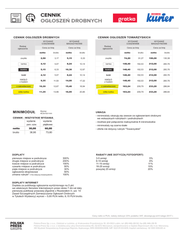 CENNIK OGŁOSZEŃ DROBNYCH CENNIK OGŁOSZEŃ DROBNYCH Rodzaj ogłoszenia CENNIK OGŁOSZEŃ TOWARZYSKICH WYDANIE CODZIENNE WYDANIE MAGAZYNOWE Cena za linię Cena za linię netto brutto netto brutto zwykłe 2,58 3,17 5,15 6,33 ramka 4,12 5,07 8,24 kontra 5,15 6,33 bold 4,12 HASŁO z hasłem Rodzaj ogłoszenia WYDANIE CODZIENNE WYDANIE MAGAZYNOWE Cena za linię Cena za linię netto brutto netto brutto zwykłe 74,20 91,27 106,00 130,38 10,14 ramka 148,40 182,53 212,00 260,76 10,30 12,67 kontra 148,40 182,53 212,00 260,76 5,07 8,24 10,14 bold 148,40 182,53 212,00 260,76 9,35 11,50 14,00 17,22 HASŁO z hasłem 148,40 182,53 212,00 260,76 z zakreślaczem 10,30 12,67 15,40 18,94 z zakreślaczem 163,24 200,79 233,20 286,84 żółta kartka 11,35 13,96 16,95 20,85 żółta kartka 163,24 200,79 233,20 286,84 MINIMODUŁ Wymiar 40,5x19,4 mm CENNIK - WSZYSTKIE WYDANIA wydanie wydanie pon.-czw. piątkowe netto30,0060,00 brutto 36,90 UWAGA - minimoduły ukazują się zawsze za ogłoszeniami drobnymi we wskazanych rubrykach i podrubrykach - możliwe jest połączenie maksymalnie 8 minimodułów - minimoduły są czarno-białe - oferta nie dotyczy rubryki "Towarzyskie" 73,80 DOPŁATY RABATY (NIE DOTYCZĄ FOTOOFERT) pierwsze miejsce w podrubryce 300% drugie miejsce w podrubryce 200% trzecie miejsce w podrubryce 100% czwarte miejsce w podrubryce 50% piąte miejsce w podrubryce 30% ogłoszenie ekspresowe 50% zmiana rubryki* (*nie dotyczy towarzyskich)100% 3-5 emisji 6-10 emisji 11-15 emisji 16-25 emisji powyżej 25 emisji 5% 8% 11% 15% 20% DOPŁATY INTERNET Dopłata za publikację ogłoszenia wyróżnionego na 5 pkt we właściwym Serwisie Internetowym przez okres 7 dni od daty pierwszej publikacji prasowej (Zgodnie z Rozdziałem II, ust. 14 Zasad Szczególnych Zamieszczania Ogłoszeń Drobnych w Tytułach Wydawcy) wynosi – 5,00 PLN netto, 6,15 PLN brutto. Ceny netto w PLN, należy doliczyć 23% podatku VAT, obowiązują od 6 lutego 2017 r. Polska Press Sp. z o.o., Oddział w Lublinie, ul. Krakowskie Przedmieście 10, 20-002 Lublin, tel: (81) 446-28-50, fax (81) 446-28-19 Polska Press Sp. z o.o. z siedzibą przy ulicy Domaniewskiej 45, 02-672 Warszawa, zarejestrowana w Sądzie Rejonowym dla m.st. Warszawy, XIII Wydział Gospodarczy Krajowego Rejestru Sądowego, KRS 0000002408, NIP: 522-01-03-609, Kapitał zakładowy: 42 000 000,00 zł.