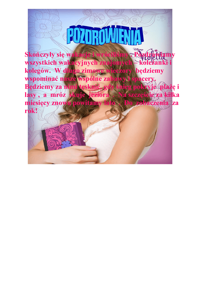 Skończyły się wakacje i wróciliśmy . Pozdrawiamy wszystkich wakacyjnych znajomych – koleżanki i kolegów. W długo zimowe wieczory będziemy wspominać nasze wspólne zabawy i spacery. Będziemy za nimi tęsknić, gdy śnieg pokryje plażę i lasy , a mróz skuje jeziora . Na szczęście za kilka miesięcy znowu powitamy lato . Do zobaczenia za rok!