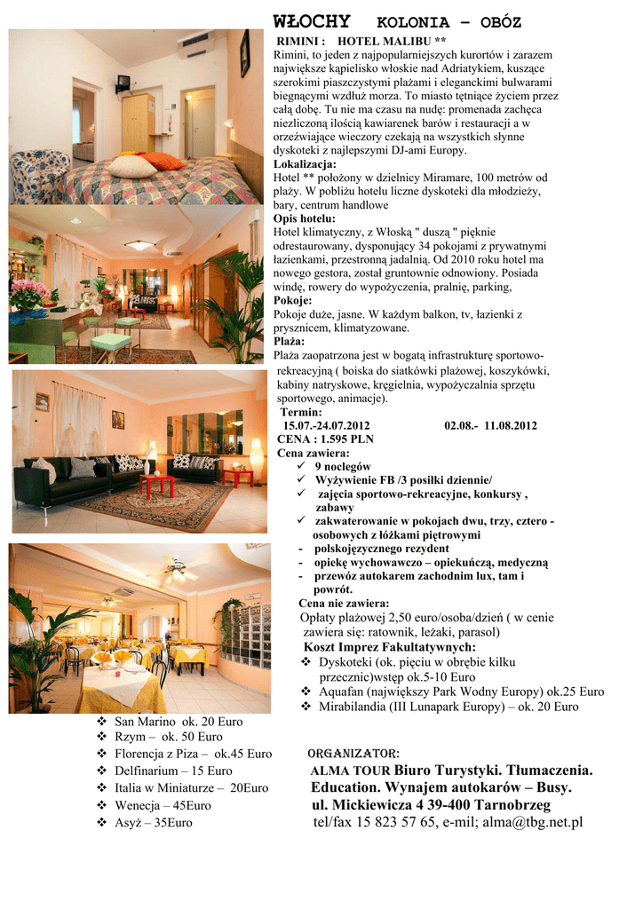 WàOCHY KOLONIA – OBÓZ RIMINI : HOTEL MALIBU ** Rimini, to jeden z najpopularniejszych kurortów i zarazem najwiĊksze kąpielisko wáoskie nad Adriatykiem, kuszące szerokimi piaszczystymi plaĪami i eleganckimi bulwarami biegnącymi wzdáuĪ morza. To miasto tĊtniące Īyciem przez caáą dobĊ. Tu nie ma czasu na nudĊ: promenada zachĊca niezliczoną iloĞcią kawiarenek barów i restauracji a w orzeĨwiające wieczory czekają na wszystkich sáynne dyskoteki z najlepszymi DJ-ami Europy. Lokalizacja: Hotel ** poáoĪony w dzielnicy Miramare, 100 metrów od plaĪy. W pobliĪu hotelu liczne dyskoteki dla máodzieĪy, bary, centrum handlowe Opis hotelu: Hotel klimatyczny, z Wáoską " duszą " piĊknie odrestaurowany, dysponujący 34 pokojami z prywatnymi áazienkami, przestronną jadalnią. Od 2010 roku hotel ma nowego gestora, zostaá gruntownie odnowiony. Posiada windĊ, rowery do wypoĪyczenia, pralniĊ, parking, Pokoje: Pokoje duĪe, jasne. W kaĪdym balkon, tv, áazienki z prysznicem, klimatyzowane. PlaĪa: PlaĪa zaopatrzona jest w bogatą infrastrukturĊ sportoworekreacyjną ( boiska do siatkówki plaĪowej, koszykówki, kabiny natryskowe, krĊgielnia, wypoĪyczalnia sprzĊtu sportowego, animacje). Termin: 15.07.-24.07.2012 02.08.- 11.08.2012 CENA : 1.595 PLN Cena zawiera: 9 9 noclegów 9 WyĪywienie FB /3 posiáki dziennie/ 9 zajĊcia sportowo-rekreacyjne, konkursy , zabawy 9 zakwaterowanie w pokojach dwu, trzy, cztero osobowych z áóĪkami piĊtrowymi - polskojĊzycznego rezydent - opiekĊ wychowawczo – opiekuĔczą, medyczną - przewóz autokarem zachodnim lux, tam i powrót. Cena nie zawiera: San Marino ok. 20 Euro Rzym – ok. 50 Euro Florencja z Piza – ok.45 Euro Delfinarium – 15 Euro Italia w Miniaturze – 20Euro Wenecja – 45Euro AsyĪ – 35Euro Opáaty plaĪowej 2,50 euro/osoba/dzieĔ ( w cenie zawiera siĊ: ratownik, leĪaki, parasol) Koszt Imprez Fakultatywnych: Dyskoteki (ok. piĊciu w obrĊbie kilku przecznic)wstĊp ok.5-10 Euro Aquafan (najwiĊkszy Park Wodny Europy) ok.25 Euro Mirabilandia (III Lunapark Europy) – ok. 20 Euro ORGANIZATOR: ALMA TOUR Biuro Turystyki. Táumaczenia. Education. Wynajem autokarów – Busy. ul. Mickiewicza 4 39-400 Tarnobrzeg tel/fax 15 823 57 65, e-mil; [email protected]