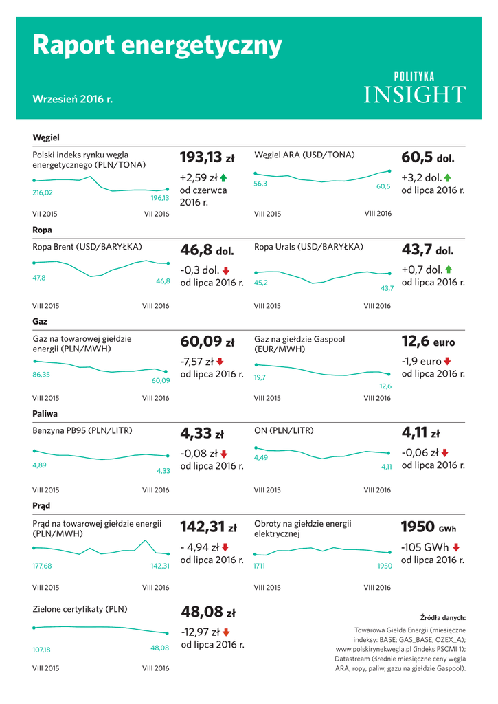 Raport energetyczny Wrzesień 2016 r. Węgiel 193,13 zł Polski indeks rynku węgla energetycznego (PLN/TONA) 216,02 +2,59 zł 196,13 VII 2015 od czerwca 2016 r. 56,3 60,5 +3,2 dol. od lipca 2016 r. VIII 2016 VIII 2015 VII 2016 60,5 dol. Węgiel ARA (USD/TONA) Ropa 46,8 dol. Ropa Brent (USD/BARYŁKA) 47,8 VIII 2015 46,8 43,7 dol. Ropa Urals (USD/BARYŁKA) +0,7 dol. -0,3 dol. od lipca 2016 r. 45,2 43,7 VIII 2015 VIII 2016 od lipca 2016 r. VIII 2016 Gaz Gaz na towarowej giełdzie energii (PLN/MWH) 60,09 zł 86,35 od lipca 2016 r. VIII 2015 -7,57 zł 60,09 -1,9 euro od lipca 2016 r. 19,7 12,6 VIII 2015 VIII 2016 12,6 euro Gaz na giełdzie Gaspool (EUR/MWH) VIII 2016 Paliwa 4,33 zł Benzyna PB95 (PLN/LITR) 4,89 VIII 2015 -0,08 zł 4,33 od lipca 2016 r. 4,11 zł ON (PLN/LITR) -0,06 zł 4,49 4,11 VIII 2015 VIII 2016 od lipca 2016 r. VIII 2016 Prąd Prąd na towarowej giełdzie energii (PLN/MWH) 142,31 zł 1950 gwh Obroty na giełdzie energii elektrycznej -105 GWh - 4,94 zł 177,68 VIII 2015 142,31 od lipca 2016 r. VIII 2015 VIII 2016 48,08 zł Zielone certyfikaty (PLN) -12,97 zł 107,18 VIII 2015 48,08 VIII 2016 1711 od lipca 2016 r. 1950 od lipca 2016 r. VIII 2016 Źródła danych: Towarowa Giełda Energii (miesięczne indeksy: BASE; GAS_BASE; OZEX_A); www.polskirynekwegla.pl (indeks PSCMI 1); Datastream (średnie miesięczne ceny węgla ARA, ropy, paliw, gazu na giełdzie Gaspool). Miesiąc w energetyce POSTĘP KLUCZOWYCH INWESTYCJI: Elektrownia Opole (PGE): 23 sierpnia na budowę trafił generator dla bloku energetycznego nr 5. Ostrołęka Kozienice Opole 09.08 2016 10.08 2016 15.08 2016 Engie szuka chętnych na elektrownię Połaniec. Enea, czeski EPH, Sunningwell oraz inwestorzy z Chin starają się o elektrownię. Cena oscyluje wokół miliarda złotych”– informuje „Puls Biznesu”. Firmy mają ponad miesiąc na analizę sytuacji spółki, na początku września powinny złożyć wiążące oferty. Harmonogram transakcji zakłada sprzedaż elektrowni do końca roku. Zbudowany w 1979 r. obiekt jest piątym co do wielkości producentem energii elektrycznej w Polsce (ma 1800 MW mocy bloków energetycznych, czyli 5,5 proc. krajowej mocy). Jest też największym dostawcą prądu w województwach świętokrzyskim i rzeszowskim. Brak rynku mocy może wywołać blackouty. Łączny koszt niedostarczonej energii może do 2030 r sięgnąć 37,6 mld zł. Na tyle eksperci Polskiego Komitetu Energii Elektrycznej (PKEE), zrzeszającego największe spółki sektora, wycenili społeczno-gospodarcze konsekwencje tzw. blackoutów. Blackouty pojawiły się już rok temu, kiedy fala upałów sprawiła, że PSE wprowadził ograniczenia w dostawach prądu. Zdaniem PKEE konieczne jest wprowadzenie rynku mocy, który wygeneruje impuls do budowy nowych elektrowni. Konsorcjum Nord Stream II wycofało wniosek z UOKiK. Urząd zgłosił wcześniej zastrzeżenia wobec powołania spółki celowej do budowy drugiej nitki gazociągu. Oznacza to, że konsorcjum, w które zaangażować miały się m.in. Shell i Engie, nie będzie mogło powstać. Wycofanie wniosku może oznaczać, że Nord Stream II zbuduje sam Gazprom, co nie wymaga powołania nowego podmiotu. Możliwe jest też, że struktura inwestorska projektu nie ulegnie zmianie, a udziałowcy joint venture pominą polski urząd. Polityka Insight – Raport Energetyczny Wrzesień 2016 Elektrownia Kozienice (Enea): 22 sierpnia konsorcjum Polimex-Mostostal oraz Mitsubishi Hitachi Power Systems zaproponowało aktualizację harmonogramu budowy bloku i przesunięcie terminu zakończenia prac na 19 grudnia 2017 r. – blisko pięć miesięcy po pierwotnym terminie. Elektrownia Ostrołęką (Energa): Energa poinformowała, że budowa nowego bloku na węgiel o mocy 1 GW może rozpocząć się najwcześniej w 2018 r. Oddanie jej do użytku nastąpi w 2023 r. 19.08 2016 Zielone certyfikaty najtańsze w historii. Jeszcze w kwietniu cena certyfikatów, które otrzymują producenci energii z OZE, wynosiła ponad 100 zł, a 19 sierpnia spadła do 39,62 zł. To głównie efekt działań MinEner, które od 2017 r. chce ograniczyć obowiązek zakupu certyfikatów przez firmy handlujące energią. Ma to spowodować obniżkę rachunków za energię. Pomimo apeli ze strony firm i organizacji branżowych rząd nie zamierza interweniować na rynku. Zaostrzy to kryzys w branży OZE i doprowadzi do bankructw mniejszych producentów. 24.08 2016 Rząd może zablokować sprzedaż aktywów EDF i Engie. 24 sierpnia weszło w życie rozporządzenie z aktualną listą firm chronionych zgodnie z ustawą o kontroli niektórych inwestycji. Do KGHM i Grupy Azoty dopisano Orlen, Tauron, EDF, Engie Energia i PKP Energetykę. Inwestorzy, którzy chcą kupić aktywa spółek z listy, muszą o tym poinformować MinSkar. Resort może zablokować transakcję, jeśli uzna, że zagraża ona bezpieczeństwu państwa. Decyzja o dopisaniu EDF i Engie może uniemożliwić tym firmom zbycie aktywów w Polsce. 24.08 2016 TF Silesia zainwestuje w KHW. Jak poinformowało MinEner, fundusz będzie trzecim – obok Enei i Węglokoksu – podmiotem finansowo zaangażowanym w restrukturyzację Katowickiego Holdingu Węglowego (KHW). Inwestorzy do nowej spółki wniosą łącznie ok. 700 mln zł, z czego 350 mln zainwestuje Enea, 200 mln – TF Silesia i 150 mln – Węglokoks. Według resortu środki będą inwestowane jedynie w perspektywiczne kopalnie. Wsparcie finansowe będzie wiązało się z reorganizacją KHW, który docelowo ma przekształcić się w Polski Holding Węglowy. 2 29.08 2016 JSW porozumiała się z obligatariuszami. Spółka zawarła porozumienie z państwowymi podmiotami: PKO BP, BGK, PZU i PZU Życie, którym winna jest łącznie ok. 1,3 mld zł. Umowa zakłada obniżenie kwoty zadłużenia koncernu i wydłużenie okresu spłaty o pięć lat – do 2025 r. W zamian JSW ma sukcesywnie obniżać koszty funkcjonowania, docelowo o 1,6 mld zł. Według naszych informacji duży wpływ na osiągnięci