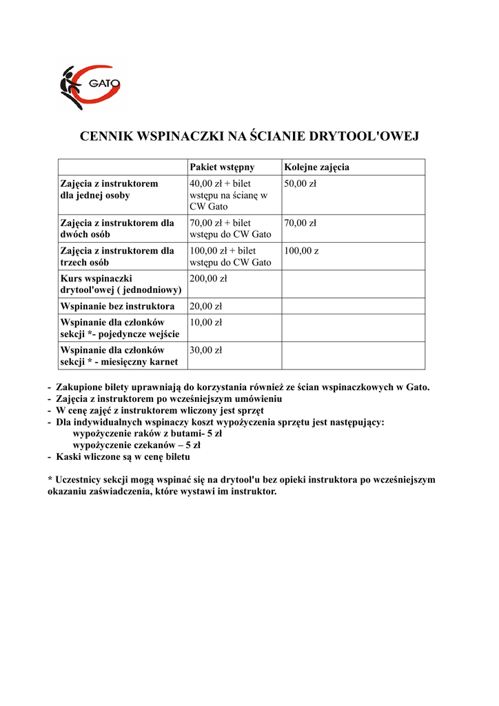 CENNIK WSPINACZKI NA ŚCIANIE DRYTOOL'OWEJ Pakiet wstępny Kolejne zajęcia Zajęcia z instruktorem dla jednej osoby 40,00 zł + bilet wstępu na ścianę w CW Gato 50,00 zł Zajęcia z instruktorem dla dwóch osób 70,00 zł + bilet wstępu do CW Gato 70,00 zł Zajęcia z instruktorem dla trzech osób 100,00 zł + bilet wstępu do CW Gato 100,00 z Kurs wspinaczki 200,00 zł drytool'owej ( jednodniowy) Wspinanie bez instruktora 20,00 zł Wspinanie dla członków sekcji *- pojedyncze wejście 10,00 zł Wspinanie dla członków sekcji * - miesięczny karnet 30,00 zł - Zakupione bilety uprawniają do korzystania również ze ścian wspinaczkowych w Gato. Zajęcia z instruktorem po wcześniejszym umówieniu W cenę zajęć z instruktorem wliczony jest sprzęt Dla indywidualnych wspinaczy koszt wypożyczenia sprzętu jest następujący: wypożyczenie raków z butami- 5 zł wypożyczenie czekanów – 5 zł - Kaski wliczone są w cenę biletu * Uczestnicy sekcji mogą wspinać się na drytool'u bez opieki instruktora po wcześniejszym okazaniu zaświadczenia, które wystawi im instruktor.