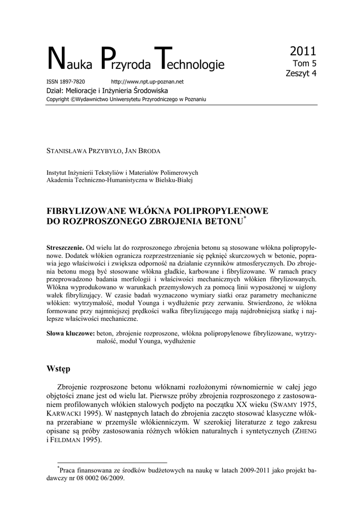 Nauka Przyroda Technologie ISSN 1897-7820 http://www.npt.up-poznan.net 2011 Tom 5 Zeszyt 4 Dział: Melioracje i Inżynieria Środowiska Copyright ©Wydawnictwo Uniwersytetu Przyrodniczego w Poznaniu STANISŁAWA PRZYBYŁO, JAN BRODA Instytut Inżynierii Tekstyliów i Materiałów Polimerowych Akademia Techniczno-Humanistyczna w Bielsku-Białej FIBRYLIZOWANE WŁÓKNA POLIPROPYLENOWE DO ROZPROSZONEGO ZBROJENIA BETONU* Streszczenie. Od wielu lat do rozproszonego zbrojenia betonu są stosowane włókna polipropylenowe. Dodatek włókien ogranicza rozprzestrzenianie się pęknięć skurczowych w betonie, poprawia jego właściwości i zwiększa odporność na działanie czynników atmosferycznych. Do zbrojenia betonu mogą być stosowane włókna gładkie, karbowane i fibrylizowane. W ramach pracy przeprowadzono badania morfologii i właściwości mechanicznych włókien fibrylizowanych. Włókna wyprodukowano w warunkach przemysłowych za pomocą linii wyposażonej w uiglony wałek fibrylizujący. W czasie badań wyznaczono wymiary siatki oraz parametry mechaniczne włókien: wytrzymałość, moduł Younga i wydłużenie przy zerwaniu. Stwierdzono, że włókna formowane przy najmniejszej prędkości wałka fibrylizującego mają najdrobniejszą siatkę i najlepsze właściwości mechaniczne. Słowa kluczowe: beton, zbrojenie rozproszone, włókna polipropylenowe fibrylizowane, wytrzymałość, moduł Younga, wydłużenie Wstęp Zbrojenie rozproszone betonu włóknami rozłożonymi równomiernie w całej jego objętości znane jest od wielu lat. Pierwsze próby zbrojenia rozproszonego z zastosowaniem profilowanych włókien stalowych podjęto na początku XX wieku (SWAMY 1975, KARWACKI 1995). W następnych latach do zbrojenia zaczęto stosować klasyczne włókna przerabiane w przemyśle włókienniczym. W szerokiej literaturze z tego zakresu opisane są próby zastosowania różnych włókien naturalnych i syntetycznych (ZHENG i FELDMAN 1995). * Praca finansowana ze środków budżetowych na naukę w latach 2009-2011 jako projekt badawczy nr 08 0002 06/2009. 2 Przybyło S., Broda J., 2011. Fibrylizowane włókna polipropylenowe do rozproszonego zbrojenia betonu. Nauka Przyr. Technol. 5, 4, #73. Z grupy włókien syntetycznych największe zastosowanie znalazły włókna polipropylenowe (BUDI AULIA 2002). Skutecznie powstrzymują one rozprzestrzenianie się pęknięć skurczowych betonu i korzystnie wpływają na jego właściwości. Wyeliminowanie rys skurczowych poprawia szczelność i ogranicza nasiąkliwość betonu, a także zwiększa jego mrozoodporność. Beton zbrojony włóknami polipropylenowymi ma większą trwałość przy działaniu zmiennych warunków atmosferycznych. Dodatek włókien zapewnia długi czas użytkowania konstrukcji betonowych z zachowaniem optymalnych właściwości. Beton z dodatkiem włókien polipropylenowych znalazł szerokie zastosowanie do budowy dróg, mostów, lotnisk, posadzek przemysłowych, osłon przeciwdziałających wibracjom, ścian ograniczających przenikanie substancji niebezpiecznych oraz do rekonstrukcji uszkodzonych murów oporowych, tuneli i ścian skalnych. Włókna polipropylenowe przeznaczone do zbrojenia betonu są produkowane w postaci ciętych włókien mono- lub multifilamentowych, włókien fibrylizowanych i włókien profilowanych o specjalnie karbowanej powierzchni. Ze względu na swoje właściwości i stosunkowo niską cenę duże zainteresowanie wzbudzają włókna fibrylizowane (DEOPURA 1999, PHILLIPS i GHOSH 2003). Proces formowania takich włókien obejmuje wytłaczanie folii, cięcie folii na wąskie tasiemki, rozciąganie tasiemek, stabilizację termiczną, nacinanie tasiemek i rozciąganie końcowe. W przypadku włókien przeznaczonych do zbrojenia betonu szczególne znaczenie mają operacje końcowe, podczas których następuje fibrylizacja tasiemek polipropylenowych. W wyniku fibrylizacji powstaje struktura siatkopodobna, która rozwija się podczas mieszania włókien w zaprawie betonowej. Poprzez rozwinięcie struktury siatkopodobnej zwiększa się powierzchnia właściwa włókien, w wyniku czego poprawia się ich przyczepność do składników betonu. W ramach pracy oceniono wpływ fibrylizacji na budowę morfologiczną i parametry mechaniczne włókien. Materiał i metody Polipropylenowe włókna fibrylizowane wytworzono w warunkach przemysłowych z zastosowaniem włoskiej linii produkcyjnej DPM. Wytłoczoną folię cięto na tasiemki o szerokości 10 cm, które po rozciąganiu i stabilizacji poddano fibrylizacji. Fibrylizację tasiemek prowadzono za pomocą wałka uiglonego. Uzyskano cztery serie włókien o masie liniowej 400, 600, 800 i 1000 tex. W procesie fibrylizacji stosowano różne prędkości wałka uiglonego: 150, 180 i 200 m/min. Zastosowano polipropylen komercyjny Moplen HP 456J (Orlen Polyolefins) z dodatkiem 2% polietylenu FB 2-30 (Slovnaft Petrochemicals). Badano morfologię oraz właściwości mechaniczne włókien. Do badań morfologicznych zastosowano skaningowy mikroskop elektronowy Jeol 5500. Prowadzono obserwacje mikroskopowe próbek napylonych złotem za pomocą napylarki laboratoryjnej Jeol 1200. Podczas badań właściwości mechanicznych wyznaczono następujące parametry włókien: wytrzymałość, wydłużenie przy zerwaniu i moduł Younga. Pomiary parametrów mechanicznych wykonano zgodnie z normą PN-EN ISO 5079:1999 „Tekstylia. Włókna. Wyznaczanie siły i wydłużenia zrywającego pojedynczych włókien”. 3 Przybyło S., Broda J., 2011. Fibrylizowane włókna polipropylenowe do rozproszonego zbrojenia betonu. Nauka Przyr. Technol. 5, 4, #73. Do badań zastosowano maszynę wytrzymałościową Instron 1026. Zrywano odcinki włókien o długości 20 mm. Wyniki i dyskusja Na rysunku 1 przedstawiono morfologię powierzchni tasiemek i włókien fibrylizowanych. Na powierzchni tasiemek jest widoczna struktura fibrylarna (rys. 1 a). Fibryle o średnicy około 0,1 μm są ułożone ściśl