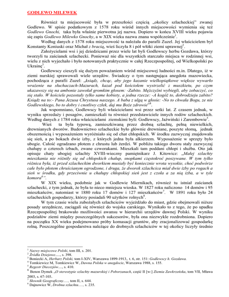 GODLEWO MILEWEK Również ta miejscowość była w przeszłości częścią „okolicy szlacheckiej” zwanej Godlewo. W spisie podatkowym z 1578 roku wśród innych miejscowości wymienia się też Godlewo Gnochi, taka była właśnie pierwotna jej nazwa. Dopiero w końcu XVIII wieku pojawia się zapis Godlewo Milewko Gnochy, a w XIX wieku nazwa znana współcześnie1. Według danych z 1578 roku miejscowość ta należała do parafii Zuzel. Jej właścicielem był Konstanty Koniuski oraz Michał z bracią, wieś liczyła 8 i pół włóki ziemi uprawnej2. Założycielami wsi i jej dziedzicami przez wiele lat byli Godlewscy herbu Gozdawa, którzy tworzyli tu zaścianek szlachecki. Ponieważ nie dla wszystkich starczało miejsca w rodzinnej wsi, wielu z nich wyjechało i było notowanych praktycznie w całej Rzeczpospolitej, od Wielkopolski po Ukrainę3. Godlewscy cieszyli się dużym poważaniem wśród miejscowej ludności m.in. Dlatego, iż w ziemi nurskiej sprawowali wiele urzędów. Świadczy o tym następująca anegdota mazowiecka, pochodząca z parafii Zuzel: „ksiądz, chcąc, aby jego kazanie wielkopiątkowe większe wywarło wrażenie na słuchaczach-Mazurach, kazał pod kościołem wystrzelić z muszkietu, po czym ukazawszy się na ambonie zawołał gromkim głosem: -Zabito. Mężczyźni wybiegli, aby zobaczyć, co się stało. W kościele pozostały tylko same kobiety, a jedna rzecze: -A kogóż to, dobrodzieju zabito? Ksiądz na to:- Pana Jezusa Chrystusa naszego. A baba z ulgą w głosie: -No to chwała Bogu, ze nie Godlewskiego, bo to dobry i cnotliwy człek, daj mu Boże zdrowie”4. Jak wspomniano, Godlewscy byli właścicielami wsi przez setki lat. Z czasem jednak, w wyniku sprzedaży i posagów, zamieszkali tu również przedstawiciele innych rodów szlacheckich. Według danych z 1784 roku właścicielami ziemskimi byli: Godlewscy, Jaźwiński i Zarembowie5. Wieś ta była typową, zamieszkiwaną przez drobną szlachtę, pełną niewielkich, drewnianych dworów. Budownictwo szlacheckie było głównie drewniane, poszyte słomą, jednak obszernością i wyposażeniem wyróżniało się od chat chłopskich. W środku zazwyczaj znajdowała się sień, a po bokach dwie izby, z których jedna była alkierzem. Wyposażenie w sprzęty było ubogie. Całość ogradzano płotem z chrustu lub żerdzi. W pobliżu takiego dworu stały zazwyczaj chałupy o czterech izbach, zwane czworakami. Mieszkali tam poddani chłopi i służba. Oto jak opisuje chaty ubogiej szlachty XVIII-wieczny pamiętnikarz J. Kitowicz: „Małej szlachty mieszkania nie różniły się od chłopskich chałup, snopkami częstokroć poszywane. W tym tylko różnica była, iż przed szlacheckim dworkiem musiały być koniecznie wrota wysokie, choć podwórze całe było płotem chruścianym ogrodzone, i druga, że dworek szlachcica miał dwie izby po rogach a sień w środku, gdy przeciwnie u chałupy chłopskiej sień jest z czoła a za nią izba, a w tyle komora6”. W XIX wieku, podobnie jak w Godlewie Miernikach, również tu istniał zaścianek szlachecki, z tym jednak, że była to nieco mniejsza wioska. W 1827 roku naliczono 14 domów i 95 mieszkańców, natomiast w 1880 roku 17 domów i 127 mieszkańców7. W 1891 roku było 24 szlacheckich gospodarzy, którzy posiadali 90 użytków rolnych8. W tym czasie wielu zubożałych szlachciców wyjeżdżało do miast, gdzie obejmowali niższe posady urzędnicze, zaciągali się również do wojska carskiego. Wynikało to z tego, że po upadku Rzeczpospolitej brakowało możliwości awansu w hierarchii urzędów dawnej Polski. W wyniku podziałów ziemi między poszczególnych sukcesorów, była ona niezwykle rozdrobniona. Dopiero na początku XX wieku podejmowano próby komasacji gruntów, aby zracjonalizować gospodarkę rolną. Poszczególne gospodarstwa należące do drobnych szlachciców w tej okolicy liczyły średnio 1 Nazwy miejscowe Polski, tom III, s. 201. Źródła Dziejowe....., s. 398. 3 Boniecki A, Herbarz Polski, tom I-XIV, Warszawa 1899-1913,, t. 6, str. 151: Godlewscy h. Gozdawa. 4 Tomkiewicz M, Tomkiewicz W, Dawna Polska w anegdocie, Warszawa 1988, s. 155. 5 Regestr Diecezjów...., s. 410. 6 Benon Dymek „O stereotypie szlachty mazurskiej i Poborzanach, część II [w:] Ziemia Zawkrzeńska, tom VII, Mława 2003, s. 67-103. 7 Słownik Geograficzny....., tom II, s. 644. 8 Dajnowicz W, Drobna szlachta....., s. 235. 2 od 1 do 20 ha, z tym, że działki często leżały w kilku wsiach i dodatkowo podzielone były czasem na 100 mniejszych działek9. Spis powszechny z 1921 roku informuje o wsi Godlewo Milewek, liczącej 25 domów i 139 mieszkańców. Miejscowość należała do gminy Szulborze Koty10. 9 Rosłoniec Stanisław, Samorzutne scalanie gruntów wśród mazowieckiej i podlaskiej szlachty zagrodowej, Warszawa 1928, s. 114-115. 10 Skorowidz miejscowości...., s. 66.