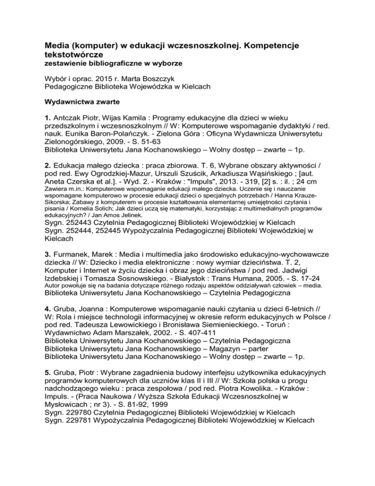 Media (komputer) w edukacji wczesnoszkolnej. Kompetencje tekstotwórcze zestawienie bibliograficzne w wyborze Wybór i oprac. 2015 r. Marta Boszczyk Pedagogiczne Biblioteka Wojewódzka w Kielcach Wydawnictwa zwarte 1. Antczak Piotr, Wijas Kamila : Programy edukacyjne dla dzieci w wieku przedszkolnym i wczesnoszkolnym // W: Komputerowe wspomaganie dydaktyki / red. nauk. Eunika Baron-Polańczyk. - Zielona Góra : Oficyna Wydawnicza Uniwersytetu Zielonogórskiego, 2009. - S. 51-63 Biblioteka Uniwersytetu Jana Kochanowskiego – Wolny dostęp – zwarte – 1p. 2. Edukacja małego dziecka : praca zbiorowa. T. 6, Wybrane obszary aktywności / pod red. Ewy Ogrodzkiej-Mazur, Urszuli Szuścik, Arkadiusza Wąsińskiego ; [aut. Aneta Czerska et al.]. - Wyd. 2. - Kraków : "Impuls", 2013. - 319, [2] s. : il. ; 24 cm Zawiera m.in.: Komputerowe wspomaganie edukacji małego dziecka. Uczenie się i nauczanie wspomagane komputerowo w procesie edukacji dzieci o specjalnych potrzebach / Hanna KrauzeSikorska; Zabawy z komputerem w procesie kształtowania elementarnej umiejętności czytania i pisania / Kornelia Solich; Jak dzieci uczą się matematyki, korzystając z multimedialnych programów edukacyjnych? / Jan Amos Jelinek. Sygn. 252443 Czytelnia Pedagogicznej Biblioteki Wojewódzkiej w Kielcach Sygn. 252444, 252445 Wypożyczalnia Pedagogicznej Biblioteki Wojewódzkiej w Kielcach 3. Furmanek, Marek : Media i multimedia jako środowisko edukacyjno-wychowawcze dziecka // W: Dziecko i media elektroniczne : nowy wymiar dzieciństwa. T. 2, Komputer i Internet w życiu dziecka i obraz jego dzieciństwa / pod red. Jadwigi Izdebskiej i Tomasza Sosnowskiego. - Białystok : Trans Humana, 2005. - S. 17-24 Autor powołuje się na badania dotyczące różnego rodzaju aspektów oddziaływań człowiek – media. Biblioteka Uniwersytetu Jana Kochanowskiego – Czytelnia Pedagogiczna 4. Gruba, Joanna : Komputerowe wspomaganie nauki czytania u dzieci 6-letnich // W: Rola i miejsce technologii informacyjnej w okresie reform edukacyjnych w Polsce / pod red. Tadeusza Lewowickiego i Bronisława Siemienieckiego. - Toruń : Wydawnictwo Adam Marszałek, 2002. - S. 407-411 Biblioteka Uniwersytetu Jana Kochanowskiego – Czytelnia Pedagogiczna Biblioteka Uniwersytetu Jana Kochanowskiego – Magazyn – parter Biblioteka Uniwersytetu Jana Kochanowskiego – Wolny dostęp – zwarte – 1p. 5. Gruba, Piotr : Wybrane zagadnienia budowy interfejsu użytkownika edukacyjnych programów komputerowych dla uczniów klas II i III // W: Szkoła polska u progu nadchodzącego wieku : praca zespołowa / pod red. Piotra Kowolika. - Kraków : Impuls. - (Praca Naukowa / Wyższa Szkoła Edukacji Wczesnoszkolnej w Mysłowicach ; nr 3). - S. 81-92, 1999 Sygn. 229780 Czytelnia Pedagogicznej Biblioteki Wojewódzkiej w Kielcach Sygn. 229781 Wypożyczalnia Pedagogicznej Biblioteki Wojewódzkiej w Kielcach 6. Grzesiak, Jan : Komputer w edukacji początkowej dzieci w obliczu społeczeństwa informacyjnego // W: Komputer w edukacji : 19. ogólnopolskie sympozjum naukowe, Kraków 25-26 września 2009 / red. nauk. Janusz Morbitzer. - Kraków : Uniwersytet Pedagogiczny. Katedra Technologii i Mediów Edukacyjnych, 2009. - S. 62-68 Biblioteka Główna UMCS w Lublinie, Biblioteka Uniwersytecka KUL, Biblioteka Uniwersytetu Łódzkiego, Biblioteka Główna Uniwersytetu Pedagogicznego w Krakowie, Biblioteka Jagiellońska i Biblioteka Medyczna Uniwersytetu Jagiellońskiego - Collegium Medium, Biblioteka Krakowskiej Akademii, Biblioteka Publiczna m. st. Warszawy, Biblioteki Uniwersytetu Warszawskiego 7. Jakubowicz-Bryx, Anna : Multimedialne programy edukacyjne i ich wykorzystanie w edukacji wczesnoszkolnej // W: System integralny w edukacji dziecka : konteksty i konsekwencje zmian : praca zbiorowa / pod red. Heleny Siwek i Małgorzaty Bereźnickiej. - Warszawa : Wydawnictwo Wyższej Szkoły Pedagogicznej TWP, 2011. - S. 276-282 Biblioteka Uniwersytetu Jana Kochanowskiego – Magazyn parter 8. Jaroni, Elżbieta : Dylematy integrowanej edukacji wczesnoszkolnej / Elżbieta Jaroni. - Kraków : "Impuls", 2008. - 130 s. ; 24 cm M.in.: Wykorzystanie komputera w edukacji wczesnoszkolnej uczniów - możliwości i zagrożenia. Sygn. 248189 Czytelnia Pedagogicznej Biblioteki Wojewódzkiej w Kielcach Sygn. 248190 Wypożyczalnia Pedagogicznej Biblioteki Wojewódzkiej w Kielcach 9. Juszczyk, Stanisław : Informatyczne środki dydaktyki w edukacji wczesnoszkolnej // W: Współczesne tendencje w teorii i praktyce nauczania początkowego / pod red. Henryka Moroza. - Katowice : Wydawnictwo Uniwersytetu Śląskiego, 1997. - (Prace Naukowe Uniwersytetu Śląskiego w Katowicach ; nr 1653). - S. 112-123 Biblioteka Uniwersytetu Jana Kochanowskiego – Czytelnia Pedagogiczna 10. Juszczyk-Rygałło, Joanna : E-learning jako nowa przestrzeń działań pedagogicznych wczesnej edukacji // W: Aspekty edukacji szkolnej / red. Kazimierz Denek, Aleksandra Kamińska, Piotr Oleśniewicz. - Sosnowiec : Oficyna Wydawnicza "Humanitas" : Wyższa Szkoła Humanitas, 2014. - (Edukacja Jutra). - S. 87-96 Biblioteka Uniwersytetu Jana Kochanowskiego – Czytelnia Pedagogiczna 11. Kielar-Turska, Maria : Poznawcze, językowe i komunikacyjne kompetencje dziecka // W: Dziecko - nauczyciel - rodzice : konteksty edukacyjne / pod red. Rafała Piwowarskiego. - Białystok : Wydawnictwo Uniwersytetu w Białymstoku, 2003. - S. 277-289 Biblioteka Główna UMCS w Lublinie, Biblioteka Uniwersytecka KUL, Biblioteka Uniwersytetu Łódzkiego, Biblioteka Główna Uniwersytetu Pedagogicznego w Krakowie, Biblioteka Jagiellońska i Biblioteka Medyczna Uniwersytetu Jagiellońskiego - Collegium Medium, Biblioteka Publiczna m. st. Warszawy, Biblioteki Uniwersytetu Warszawskiego 12. Kłosińska, Tatiana : Multimedialne programy edukacyjne w kształceniu wczesnoszkolnym // W: Zintegrowana edukacja wczesnoszkolna w teorii i praktyce / pod red. Władysława Puśleckiego. - Opole : Wydawnictwo Uniwersytetu Opolskiego, 2004. - S. 115-125 