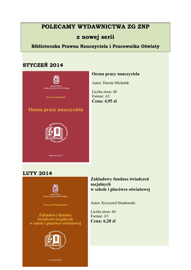 POLECAMY WYDAWNICTWA ZG ZNP z nowej serii Biblioteczka Prawna Nauczyciela i Pracownika Oświaty STYCZEŃ 2014 Ocena pracy nauczyciela Autor: Dorota Michalak Liczba stron: 40 Format: A5 Cena: 4,95 zł LUTY 2014 Zakładowy fundusz świadczeń socjalnych w szkole i placówce oświatowej Autor: Krzysztof Stradomski Liczba stron: 60 Format: A5 Cena: 6,20 zł MARZEC 2014 Kwalifikacje nauczycieli Autor: Liliana Dąbrowska Liczba stron: Format: A5 Cena: 5,70 zł KWIECIEŃ 2014 Uprawnienia oddziałów ZNP jako zakładowych organizacji związkowych Autor: Krzysztof Stradomski Liczba stron: Format: A5 W przygotowaniu: Nawiązywanie i rozwiązywanie stosunków pracy w zawodzie nauczyciela Społeczna inspekcja pracy w placówkach oświatowych Stanowisko dyrektora szkoły – powołanie, obowiązki, odpowiedzialność Ponadto polecamy Mobbing i dyskryminacja w miejscu pracy Autor: Krzysztof Stradomski Liczba stron: 48 Format: A5 Cena: 4,20zł Układ zbiorowy pracy w oświacie Autor: Krzysztof Stradomski Liczba stron: 77 Format: A5 Cena: 7,10zł Prawna ochrona osób wykonujących zawód nauczyciela Autor: Krzysztof Stradomski Liczba stron: 52 Format: A5 Cena: 5,50 zł Wszystko o godzinach nauczycieli Autor: Jolanta Gałczyńska Liczba stron: 40 Format: A5 Cena: 6,00 zł Prawa i obowiązki nauczyciela jako członka rady pedagogicznej Autor: Dorota Michalak Liczba stron: 48 Format: A5 Cena: 6,00 zł Broszury zamówić można poprzez Ośrodek Usług Pedagogicznych i Socjalnych ZG ZNP ul. Smulikowskiego 6/8, 00-389 Warszawa tel. (22) 318 92 39; tel./fax (22) 318 91 40; www.oupis.pl; [email protected] lub zakupić bezpośrednio w sklepiku w siedzibie OUPiS ZG ZNP (wejście od Wybrzeża Kościuszkowskiego)