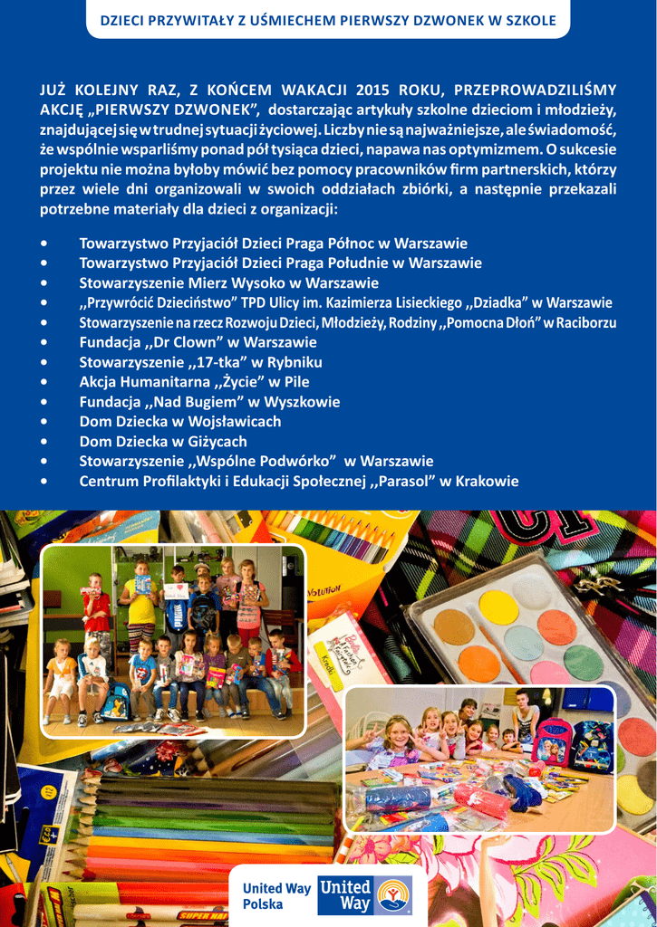 DZIECI PRZYWITAŁY Z UŚMIECHEM PIERWSZY DZWONEK W SZKOLE JUŻ KOLEJNY RAZ, Z KOŃCEM WAKACJI 2015 ROKU, PRZEPROWADZILIŚMY AKCJĘ „PIERWSZY DZWONEK”, dostarczając artykuły szkolne dzieciom i młodzieży, znajdującej się w trudnej sytuacji życiowej. Liczby nie są najważniejsze, ale świadomość, że wspólnie wsparliśmy ponad pół tysiąca dzieci, napawa nas optymizmem. O sukcesie projektu nie można byłoby mówić bez pomocy pracowników firm partnerskich, którzy przez wiele dni organizowali w swoich oddziałach zbiórki, a następnie przekazali potrzebne materiały dla dzieci z organizacji: • • • • • • • • • • • • • Towarzystwo Przyjaciół Dzieci Praga Północ w Warszawie Towarzystwo Przyjaciół Dzieci Praga Południe w Warszawie Stowarzyszenie Mierz Wysoko w Warszawie ,,Przywrócić Dzieciństwo” TPD Ulicy im. Kazimierza Lisieckiego ,,Dziadka” w Warszawie Stowarzyszenie na rzecz Rozwoju Dzieci, Młodzieży, Rodziny ,,Pomocna Dłoń” w Raciborzu Fundacja ,,Dr Clown” w Warszawie Stowarzyszenie ,,17-tka” w Rybniku Akcja Humanitarna ,,Życie” w Pile Fundacja ,,Nad Bugiem” w Wyszkowie Dom Dziecka w Wojsławicach Dom Dziecka w Giżycach Stowarzyszenie ,,Wspólne Podwórko” w Warszawie Centrum Profilaktyki i Edukacji Społecznej ,,Parasol” w Krakowie DZIECI PRZYWITAŁY Z UŚMIECHEM PIERWSZY DZWONEK W SZKOLE SERDECZNIE DZIĘKUJEMY WSZYSTKIM PRACOWNIKOM ZAANGAŻOWALI SIĘ W AKCJĘ „PIERWSZY DZWONEK” FIRM, KTÓRZY Dzięki Państwa wsparciu dzieci ruszyły do szkoły z plecakami pełnymi przyborów szkolnych, które na pewno ułatwią im zdobywanie wiedzy, a także zwiększą ich poczucie komfortu. W roku 2015 w akcji wzięli udział pracownicy następujących firm: • Mondelez (oddział w Skarbimierzu i Płońsku) • American Express S.A. • AMGEN Polska Sp. z o.o. • ATOS IT Services Sp. z o.o. (oddział w Bydgoszczy i Warszawie) • Colgate Palmolive Poland Sp. z o.o. • Delphi Poland S.A. (oddział w Błoniu i Krakowie) • Mattel Poland Sp. z o.o. • Sygnity S.A. • Janssen-Cilag Polska Sp. z o.o. • Société Générale S.A. oddział w Warszawie (akcja zorganizowana samodzielnie po raz ósmy) Szczególne podziękowania należą się Firmie FedEx Express Polska Sp. z o.o., która bezpłatnie obsłużyła całą akcję dostarczając paczki od pracowników do dzieci. W tym roku obchodzimy globalny jubileusz 40-lecia współpracy w ramach wspólnych działań na rzecz wsparcia osób najbardziej potrzebujących. Bardzo dziękujemy FedEx za partnerstwo i inicjatywę w budowaniu zmiany społecznej.