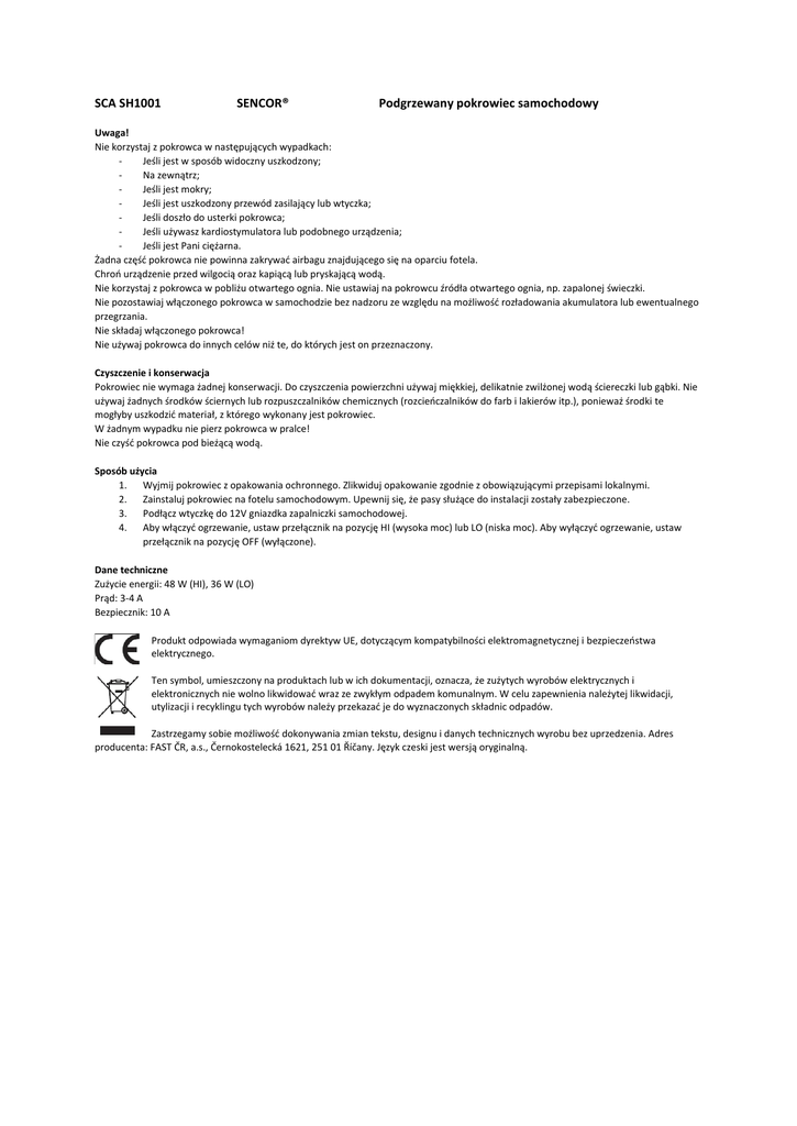 SCA SH1001 SENCOR® Podgrzewany pokrowiec samochodowy Uwaga! Nie korzystaj z pokrowca w następujących wypadkach: Jeśli jest w sposób widoczny uszkodzony; Na zewnątrz; Jeśli jest mokry; Jeśli jest uszkodzony przewód zasilający lub wtyczka; Jeśli doszło do usterki pokrowca; Jeśli używasz kardiostymulatora lub podobnego urządzenia; Jeśli jest Pani ciężarna. Żadna część pokrowca nie powinna zakrywać airbagu znajdującego się na oparciu fotela. Chroń urządzenie przed wilgocią oraz kapiącą lub pryskającą wodą. Nie korzystaj z pokrowca w pobliżu otwartego ognia. Nie ustawiaj na pokrowcu źródła otwartego ognia, np. zapalonej świeczki. Nie pozostawiaj włączonego pokrowca w samochodzie bez nadzoru ze względu na możliwość rozładowania akumulatora lub ewentualnego przegrzania. Nie składaj włączonego pokrowca! Nie używaj pokrowca do innych celów niż te, do których jest on przeznaczony. Czyszczenie i konserwacja Pokrowiec nie wymaga żadnej konserwacji. Do czyszczenia powierzchni używaj miękkiej, delikatnie zwilżonej wodą ściereczki lub gąbki. Nie używaj żadnych środków ściernych lub rozpuszczalników chemicznych (rozcieńczalników do farb i lakierów itp.), ponieważ środki te mogłyby uszkodzić materiał, z którego wykonany jest pokrowiec. W żadnym wypadku nie pierz pokrowca w pralce! Nie czyść pokrowca pod bieżącą wodą. Sposób użycia 1. Wyjmij pokrowiec z opakowania ochronnego. Zlikwiduj opakowanie zgodnie z obowiązującymi przepisami lokalnymi. 2. Zainstaluj pokrowiec na fotelu samochodowym. Upewnij się, że pasy służące do instalacji zostały zabezpieczone. 3. Podłącz wtyczkę do 12V gniazdka zapalniczki samochodowej. 4. Aby włączyć ogrzewanie, ustaw przełącznik na pozycję HI (wysoka moc) lub LO (niska moc). Aby wyłączyć ogrzewanie, ustaw przełącznik na pozycję OFF (wyłączone). Dane techniczne Zużycie energii: 48 W (HI), 36 W (LO) Prąd: 3-4 A Bezpiecznik: 10 A Produkt odpowiada wymaganiom dyrektyw UE, dotyczącym kompatybilności elektromagnetycznej i bezpieczeństwa elektrycznego. Ten symbol, umieszczony na produktach lub w ich dokumentacji, oznacza, że zużytych wyrobów elektrycznych i elektronicznych nie wolno likwidować wraz ze zwykłym odpadem komunalnym. W celu zapewnienia należytej likwidacji, utylizacji i recyklingu tych wyrobów należy przekazać je do wyznaczonych składnic odpadów. Zastrzegamy sobie możliwość dokonywania zmian tekstu, designu i danych technicznych wyrobu bez uprzedzenia. Adres producenta: FAST ČR, a.s., Černokostelecká 1621, 251 01 Říčany. Język czeski jest wersją oryginalną.