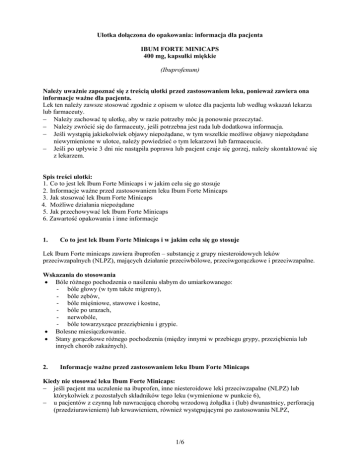 Ulotka dołączona do opakowania: informacja dla pacjenta IBUM FORTE MINICAPS 400 mg, kapsułki miękkie (Ibuprofenum) Należy uważnie zapoznać się z treścią ulotki przed zastosowaniem leku, ponieważ zawiera ona informacje ważne dla pacjenta. Lek ten należy zawsze stosować zgodnie z opisem w ulotce dla pacjenta lub według wskazań lekarza lub farmaceuty. Należy zachować tę ulotkę, aby w razie potrzeby móc ją ponownie przeczytać. Należy zwrócić się do farmaceuty, jeśli potrzebna jest rada lub dodatkowa informacja. Jeśli wystąpią jakiekolwiek objawy niepożądane, w tym wszelkie możliwe objawy niepożądane niewymienione w ulotce, należy powiedzieć o tym lekarzowi lub farmaceucie. Jeśli po upływie 3 dni nie nastąpiła poprawa lub pacjent czuje się gorzej, należy skontaktować się z lekarzem. Spis treści ulotki: 1. Co to jest lek Ibum Forte Minicaps i w jakim celu się go stosuje 2. Informacje ważne przed zastosowaniem leku Ibum Forte Minicaps 3. Jak stosować lek Ibum Forte Minicaps 4. Możliwe działania niepożądane 5. Jak przechowywać lek Ibum Forte Minicaps 6. Zawartość opakowania i inne informacje 1. Co to jest lek Ibum Forte Minicaps i w jakim celu się go stosuje Lek Ibum Forte minicaps zawiera ibuprofen – substancję z grupy niesteroidowych leków przeciwzapalnych (NLPZ), mających działanie przeciwbólowe, przeciwgorączkowe i przeciwzapalne. Wskazania do stosowania Bóle różnego pochodzenia o nasileniu słabym do umiarkowanego: - bóle głowy (w tym także migreny), - bóle zębów, - bóle mięśniowe, stawowe i kostne, - bóle po urazach, - nerwobóle, - bóle towarzyszące przeziębieniu i grypie. Bolesne miesiączkowanie. Stany gorączkowe różnego pochodzenia (między innymi w przebiegu grypy, przeziębienia lub innych chorób zakaźnych). 2. Informacje ważne przed zastosowaniem leku Ibum Forte Minicaps Kiedy nie stosować leku Ibum Forte Minicaps: jeśli pacjent ma uczulenie na ibuprofen, inne niesteroidowe leki przeciwzapalne (NLPZ) lub którykolwiek z pozostałych składników tego leku (wymienione w punkcie 6), u pacjentów z czynną lub nawracającą chorobą wrzodową żołądka i (lub) dwunastnicy, perforacją (przedziurawieniem) lub krwawieniem, również występującymi po zastosowaniu NLPZ, 1/6 u pacjentów, u których w trakcie leczenia kwasem acetylosalicylowym lub innymi niesteroidowymi lekami przeciwzapalnymi występowały jakiekolwiek objawy alergii w postaci kataru, pokrzywki, duszności lub astmy oskrzelowej, w przypadku przyjmowania innych leków z grupy NLPZ (w tym inhibitorów COX-2 takich jak celekoksyb lub etorykoksyb), jeśli u pacjenta występuje ciężka niewydolność wątroby, nerek lub serca, jeśli u pacjenta występuje krwawienie w mózgu (krwawienie z naczyń mózgowych) lub inne krwawienie, jeśli u pacjenta występują zaburzenia krzepnięcia krwi, skaza krwotoczna (skłonność do krwawień) lub zaburzenia wytwarzania krwi o nieustalonym pochodzeniu, u pacjentów odwodnionych (odwodnienie wywołane wymiotami, biegunką lub niewystarczającym spożyciem płynów), w ostatnich 3 miesiącach ciąży. Ostrzeżenia i środki ostrożności Należy zachować szczególną ostrożność stosując lek Ibum Forte Minicaps: jeśli pacjent przyjmuje inne leki przeciwbólowe z grupy NLPZ lub kwas acetylosalicylowy, jeśli u pacjenta stwierdzono niektóre choroby skóry (toczeń rumieniowaty układowy, mieszaną chorobę tkanki łącznej), jeśli u pacjenta stwierdzono choroby przewodu pokarmowego oraz przewlekłe zapalne choroby jelit (wrzodziejące zapalenie jelita grubego, choroba Leśniowskiego i Crohna), jeśli u pacjenta stwierdzono podwyższone ciśnienie krwi i (lub) zaburzenia czynności serca, jeśli u pacjenta stwierdzono zaburzenia czynności nerek, jeśli u pacjenta stwierdzono choroby wątroby, po ostatnio przebytej poważnej operacji, jeśli występuje odwodnienie ze względu na zwiększone ryzyko niewydolności nerek, jeśli u pacjenta stwierdzono zaburzenia krzepnięcia krwi (ibuprofen może wydłużyć czas krwawienia), w przypadku występowania obecnie lub w przeszłości astmy, przewlekłego kataru, polipów nosa lub chorób alergicznych, gdyż możliwe jest wystąpienie duszności, podczas stosowania innych leków, które mogą zwiększać ryzyko wystąpienia owrzodzenia lub krwawienia, takich jak doustne kortykosteroidy (np. prednizolon), leki rozrzedzające krew (np. acenokumarol), selektywne inhibitory wychwytu zwrotnego serotoniny (leki przeciwdepresyjne) oraz leki przeciwpłytkowe (np. kwas acetylosalicylowy). Jednoczesne, długotrwałe stosowanie leków przeciwbólowych może prowadzić do utrzymujących się poważnych problemów z nerkami. Ibum Forte Minicaps może maskować objawy istniejącego zakażenia lub gorączki. Przyjmowanie takich leków jak ibuprofen może być związane z niewielkim zwiększeniem ryzyka ataku serca (zawału serca) lub udaru. Ryzyko to zwiększa długotrwałe przyjmowanie dużych dawek leku. Nie należy stosować większych dawek i dłuższego czasu leczenia niż zalecane (3 dni). W przypadku kłopotów z sercem, przebytego udaru lub podejrzenia, że występuje ryzyko tych zaburzeń (zwiększone ciśnienie krwi, cukrzyca, zwiększone stężenie cholesterolu, palenie tytoniu) należy omówić sposób leczenia z lekarzem lub farmaceutą. Podczas ospy wietrznej należy unikać stosowania leku Ibum Forte Minicaps. U osób w podeszłym wieku występuje zwiększone ryzyko działań niepożądanych w trakcie stosowania leków z grupy NLPZ, w szczególności tych dotyczących żołądka i jelit. Pacjenci, u których wcześniej wystąpiły działania niepożądane w obrębie przewodu pokarmowego, zwłaszcza pacjenci w podeszłym wieku, powinni zgłaszać wszelkie nietypowe objawy w obrębie jamy 2/6 brzusznej (szczególnie krwawienia z przewodu pokarmowego), szczególnie w początkowym etapie leczenia. Dzieci i młodzież Nie podawać dzieciom w wieku poniżej 12