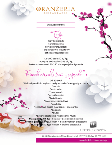 WESELNE SŁODKOŚCI Trzy Czekolady Tort Oranżeria Tort Schwarcwaldzki Tort owocowo-jogurtowy Tort z czarnej porzeczki Do 100 osób 50 zł/ kg Powyżej 100 osób 40-45 zł / kg Dekoracja tortu od 50-250 zł na specjalne życzenie Od 20-30 zł W skład paczki do wyboru będą wchodzić następujące ciasta: *sernik *makowiec *miodownik *przekładaniec *bakaliowiec *brownie czekoladowe *szarlotka *sezonowe ciasto z owocami i kruszonką *babeczki *trufle , *kruche ciasteczka * kokosanki *rurki Mała paczka 0,5 kg - 4 ciasta +1 szt drobne ciastko Średnia paczka 0,7 kg , 5 ciast + 3 szt drobnych ciasteczek Duża paczka 1 kg 5-6 ciast + drobne ciasteczka 4 szt kolorowych makaroników z różnym nadzieniem bądź trufle elegancko zapakowane z karteczką z podziękowaniem dla gości 8 szt kolorowych makaroników z różnym nadzieniem bądź trufle elegancko zapakowane z karteczką z podziękowaniem dla gości Od 25-35 zł / kg *sernik *makowiec *miodownik *przekładaniec *bakaliowiec *brownie czekoladowe *szarlotka *sezonowe ciasto z owocami i kruszonką *babeczki *trufle , *kruche ciasteczka * kokosanki *rurki
