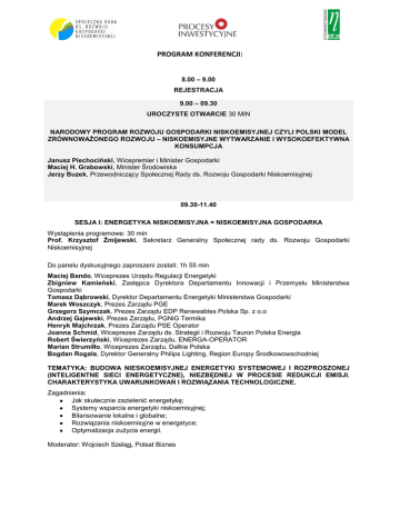 PROGRAM KONFERENCJI: 8.00 – 9.00 REJESTRACJA 9.00 – 09.30 UROCZYSTE OTWARCIE 30 MIN NARODOWY PROGRAM ROZWOJU GOSPODARKI NISKOEMISYJNEJ CZYLI POLSKI MODEL ZRÓWNOWAŻONEGO ROZWOJU – NISKOEMISYJNE WYTWARZANIE I WYSOKOEFEKTYWNA KONSUMPCJA Janusz Piechociński, Wicepremier i Minister Gospodarki Maciej H. Grabowski, Minister Środowiska Jerzy Buzek, Przewodniczący Społecznej Rady ds. Rozwoju Gospodarki Niskoemisyjnej 09.30-11.40 SESJA I: ENERGETYKA NISKOEMISYJNA = NISKOEMISYJNA GOSPODARKA Wystąpienia programowe: 30 min Prof. Krzysztof Żmijewski, Sekretarz Generalny Społecznej rady ds. Rozwoju Gospodarki Niskoemisyjnej Do panelu dyskusyjnego zaproszeni zostali: 1h 55 min Maciej Bando, Wiceprezes Urzędu Regulacji Energetyki Zbigniew Kamieński, Zastępca Dyrektora Departamentu Innowacji i Przemysłu Ministerstwa Gospodarki Tomasz Dąbrowski, Dyrektor Departamentu Energetyki Ministerstwa Gospodarki Marek Woszczyk, Prezes Zarządu PGE Grzegorz Szymczak, Prezes Zarządu EDP Renewables Polska Sp. z o.o Andrzej Gajewski, Prezes Zarządu, PGNiG Termika Henryk Majchrzak, Prezes Zarządu PSE Operator Joanna Schmid, Wiceprezes Zarządu ds. Strategii i Rozwoju Tauron Polska Energia Robert Świerzyński, Wiceprezes Zarządu, ENERGA-OPERATOR Marian Strumiłło, Wiceprezes Zarządu, Dalkia Polska Bogdan Rogala, Dyrektor Generalny Philips Lighting, Region Europy Środkowowschodniej TEMATYKA: BUDOWA NIESKOEMISYJNEJ ENERGETYKI SYSTEMOWEJ I ROZPROSZONEJ (INTELIGENTNE SIECI ENERGETYCZNE), NIEZBĘDNEJ W PROCESIE REDUKCJI EMISJI. CHARAKTERYSTYKA UWARUNKOWAŃ I ROZWIĄZANIA TECHNOLOGICZNE. Zagadnienia: Jak skutecznie zazielenić energetykę; Systemy wsparcia energetyki niskoemisyjnej; Bilansowanie lokalne i globalne; Rozwiązania niskoemisyjne w energetyce; Optymalizacja zużycia energii. Moderator: Wojciech Szeląg, Polsat Biznes 11.40-12.00 PRZERWA NA POCZĘSTUNEK 12.00-13.50 SESJA II: BUDOWNICTWO NISKOEMISYJNE I ENERGETYKA PROSUMENCKA Wystąpienia programowe: 30 min Tomasz Żuchowski, Zastępca Dyrektora Departament Budownictwa, Ministerstwo Infrastruktury i Rozwoju, Sekretarz Zespołu ds. opracowania projektu dotyczącego efektywności energetycznej budynków o niemal zerowym zużyciu energii Małgorzata Skucha, Prezes Zarządu Narodowy Fundusz Ochrony Środowiska i Gospodarki Wodnej Do panelu dyskusyjnego zaproszeni zostali: 1h 20 min Kazimierz Żmuda, Zastępca Dyrektora Departamentu Rynków Rolnych Ministerstwa Rolnictwa Marek Sawicki, Poseł na Sejm PSL, Zastępca Przewodniczącego, Komisja Rolnictwa i Rozwoju Wsi Przemysław Figarski, Wiceprezes Zarządu, Bank Ochrony Środowiska Lin Hengxi, Tianjin Mingxi Science & Technology Co. Ltd., Chiny Dr Inż. Arkadiusz Węglarz, Doradca Zarządu ds. Gospodarki Niskoemisyjnej, KAPE S.A. Dr. Kazimierz Dudziński, Prezes Zarządu, Stowarzyszenie ds. Rozliczania Energii Mirosław Niewiadomski, Prezes Polskiej Unii Ubocznych Produktów Spalania TEMATYKA: PODCZAS PANELU PRZEDYSKUTOWANA ZOSTANIE KWESTIA ZAPEWNIENIA NIŻSZEGO POZIOMU EMISYJNOŚCI BUDYNKÓW, ROZWOJU ENERGETYKI PROSUMENCKIEJ W OPARCIU O NOWOCZESNE BUDOWNICTWO I ROZWIAZANIA ENERGETYKI ROZPROSZONEJ, MOZLIWOŚCI FINANSOWANIA ROWOJU NIEWIELKICH INSTALACJI OZE. Zagadnienia: Podnoszenie standardów energetycznych budynków nowych; Konwergencja niskoenergetycznego budownictwa i niskoemisyjnej energetyki (przydomowe źródła energii); Rola państwa w zakresie niskoenergetycznego budownictwa. Moderator: Wojciech Szeląg, Polsat Biznes 13:50-14:10 PRZERWA NA POCZĘSTUNEK 14:10-15:50 SESJA III: TRANSPORT NISKOEMISYJNY Wystąpienia programowe: 30 min Zbigniew Rynasiewicz, Wiceminister, Ministerstwo Infrastruktury i Rozwoju Paweł Stelmaszczyk, Kierownik Działu Inteligentne Systemy Transportowe, Dyrekcja ds. Mobilności i Transportu, Komisja Europejska Do panelu dyskusyjnego zaproszeni zostali: 1h 10 min Krzysztof Żuk, Prezydent Miasta Lublin Jarosław Zygmunt Dworzański, Marszałek Województwa Podlaskiego Jacek Protas, Marszałek Województwa Warmińsko - Mazurskiego Lucjan Kuźniar, Wicemarszałek Województwa Podkarpackiego Kazimierz Kotowski, Członek Zarządu, Urząd Marszałkowski Województwa Świętokrzyskiego Leszek Drogosz, Dyrektor Biura Infrastruktury m.st. Warszawy Mirosław Kowalik, Dyrektor ds. sprzedaży Alstom Power w Polsce W PANELU DYSKUSYJNYM TEJ SESJI OMÓWIONE ZOSTANĄ PROBLEMY ZWIĄZANE Z WDROŻENIEM TECHNOLOGII I SYSTEMÓW INWESTOWANIA W TRANSPORT W PERSPEKTYWIE SPEŁNIENIA WYMOGÓW NISKIEJ EMISYJNOŚCI Zagadnienia: Zwiększenie sprawności pojazdów dzięki zastosowaniu nowych rozwiązań w zakresie silników, materiałów i konstrukcji; Wykorzystanie nowej generacji paliw i systemów napędowych; Poprawa organizacji transportu dzięki zastosowaniu nowoczesnych technologii informacyjnych i komunikacyjnych. Moderator: Jan Niedziałek, TVN24 Biznes i Świat 15:50-16:00 PRZERWA NA POCZĘSTUNEK 16:00-17:15 OTWARTE POSIEDZENIE SRRGN Janusz Piechociński, Wicepremier i Minister Gospodarki RP Jerzy Buzek, Przewodniczący Społecznej Rady ds. Rozwoju Gospodarki Niskoemisyjnej Michał Kleiber, Wiceprzewodniczący Społecznej Rady ds. Rozwoju Gospodarki Niskoemisyjnej Janusz Steinhoff, Wiceprzewodniczący Społecznej rady ds. Rozwoju Gospodarki Niskoemisyjnej Krzysztof Żmijewski, Sekretarz Generalny Społecznej rady ds. Rozwoju Gospodarki Niskoemisyjnej Członkowie Społecznej Rady ds. Rozwoju Gospodarki Niskoemisyjnej 1. Raport z prac Rady: Jerzy Buzek, Przewodniczący Społecznej Rady ds. Rozwoju Gospodarki Niskoemisyjnej, Krzysztof Żmijewski, Sekretarz Generalny Społecznej rady ds. Rozwoju Gospodarki Niskoemisyjnej 2. Podsumowanie prac Rady i ocena jej aktywistów: Janusz Piechociński, Wicepremier i Minister Gospodarki RP 3. Dyskusja nad trybem i zasadami dalszej współpracy. W zależności od decyzji Pana Premiera wręczenie podziękowań i/lub odznaczeń najaktywniejszym członkom Rady.