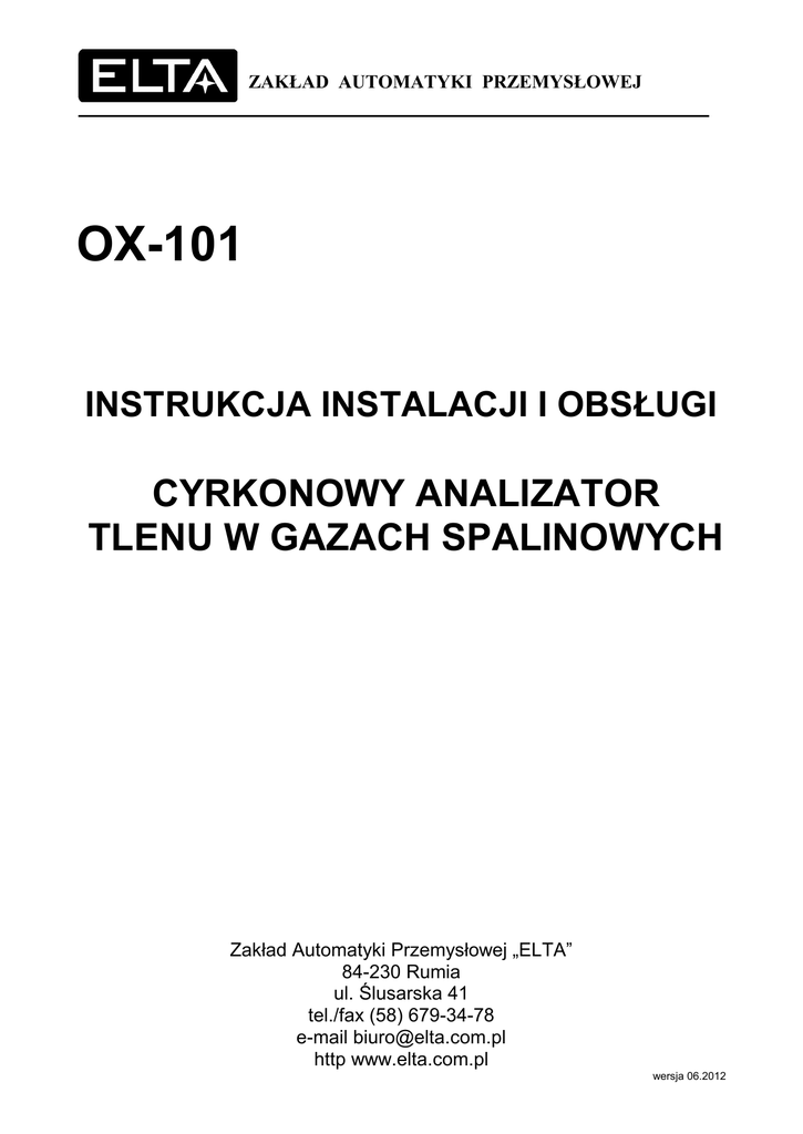 ZAKŁAD AUTOMATYKI PRZEMYSŁOWEJ OX-101 INSTRUKCJA INSTALACJI I OBSŁUGI CYRKONOWY ANALIZATOR TLENU W GAZACH SPALINOWYCH Zakład Automatyki Przemysłowej „ELTA” 84-230 Rumia ul. Ślusarska 41 tel./fax (58) 679-34-78 e-mail [email protected] http www.elta.com.pl wersja 06.2012 ver. 06.2012 OX-101 - INSTRUKCJA INSTALACJI I OBSŁUGI 2 SPIS TREŚCI 1. BEZPIECZEŃSTWO ..............................................................................................................................................3 2. PRZEZNACZENIE .................................................................................................................................................3 3. SZEROKOPASMOWA SONDA TLENU OX-101-5 .............................................................................................4 4. MODUŁ ELEKTRONICZNY OX-101 ...................................................................................................................5 5. PRZEPISY MONTAśU ..........................................................................................................................................5 6. ZESTAWIENIE ELEMENTÓW UKŁADU POMIAROWEGO ............................................................................7 7. WYMIARY OSŁONY CZUJNIKA TLENU...........................................................................................................8 8. USYTUOWANIE CZUJNIKA TLENU W KANALE SPALINOWYM.................................................................8 9. WIDOK I OPIS ELEWACJI MODUŁU OX-101....................................................................................................9 10. WIDOK I OPIS PRZYCISKÓW PROGRAMUJĄCYCH MODUŁU OX-101.....................................................11 11. URUCHOMIENIE I PROGRAMOWANIE ..........................................................................................................12 12. OPIS LISTWY ZACISKOWEJ MODUŁU OX-101 .............................................................................................16 13. KONSERWACJA..................................................................................................................................................16 14. KOMPLETACJA...................................................................................................................................................16 15. TABELA NASTAW FABRYCZNYCH................................................................................................................16 KARTA GWARANCYJNA..............................................................................................................................................17 DEKLARACJA ZGODNOŚCI .........................................................................................................................................18 ZAKŁAD AUTOMATYKI PRZEMYSŁOWEJ ”ELTA” 84-230 RUMIA UL.ŚLUSARSKA 41 TEL: (58) 679-34-78 MAIL: [email protected] HTTP: WWW.ELTA.COM.PL ver. 06.2012 OX-101 - INSTRUKCJA INSTALACJI I OBSŁUGI 3 1. BEZPIECZEŃSTWO Analizator OX-101 zasilany jest napięciem 230V AC, zatem musi być instalowany jedynie przez pracowników posiadających odpowiednie kwalifikacje. Przez pracowników posiadających odpowiednie kwalifikacje naleŜy rozumieć osoby, które uzyskały odpowiednie przeszkolenie w zakresie elektrotechniki, zastosowań i uŜytkowania urządzeń bezpieczeństwa i sprzętu ochrony osobistej przy eksploatacji i przy pracy z instalacjami i urządzeniami elektrycznymi, jak równieŜ w zakresie udzielania pierwszej pomocy i zapobiegania wypadkom, w wyniku czego uzyskały dostateczny zasób wiadomości i umiejętności niezbędny przy instalacji i odbiorze tego urządzenia. Montując lub demontując sondę cyrkonową w kanale spalinowym naleŜy uprzednio wyłączyć analizator z sieci zasilającej. Sonda posiada wewnętrzną grzałkę rozgrzewającą korpus do wysokiej temperatury – dotknięcie jej ręką moŜe spowodować poparzenia. OstrzeŜenie Podczas pracy analizatora OX-101 na listwie zaciskowej występuje napięcie sieci. Stwarza to zagroŜenie poraŜenia prądem elektrycznym. Przed przystąpieniem do demontaŜu lub montaŜu pokrywy obudowy naleŜy odciąć dopływ zasilania do urządzenia. Sonda cyrkonowa jest fabrycznie kalibrowana razem z analizatorem OX-101, zatem podczas wymiany sondy układ naleŜy ponownie skalibrować lub liczyć się ze zwiększeniem błędu pomiaru. 2. PRZEZNACZENIE Analizator tlenu OX-101 przeznaczony jest do ciągłego pomiaru stęŜenia tlenu w gazach spalinowych o temperaturze nieprzekraczającej 600°C mierzonej bezpośrednio w kanale spalinowym kotłów. Zadaniem analizatora jest zmierzenie za pośrednictwem sondy cyrkonowej umieszczonej w kanale spalinowym kotła procentowej wartości tlenu zawartego w gazach spalinowych. Sygnał z sondy przetwarzany jest w przetworniku OX101 na standardowe sygnały 4–20mA, 0–10V, wartości progowe min i max oraz na procentową wartość wyświetlaną na płycie czołowej przetwornika. ZAKŁAD AUTOMATYKI PRZEMYSŁOWEJ ”ELTA” 84-230 RUMIA UL.ŚLUSARSKA 41 TEL: (58) 679-34-78 MAIL: [email protected] HTTP: WWW.ELTA.COM.PL ver. 06.2012 OX-101 - INSTRUKCJA INSTALACJI I OBSŁUGI 4 3. SZEROKOPASMOWA SONDA TLENU OX-101-5 Cyrkonowa szerokopasmowa sonda tlenu typu OX101-5 jest nowoczesnym dwuogniwowym cyrkonowym (ZrO2) czujnikiem zintegrowanym z grzałką elektryczną oraz ze szczelną odporną na warunki przemysłowe obudową. Sondę montuje się w kanale spalinowym kotła wraz z osłoną czujnika zgodnie z rysunkiem na stronie 9. PODSTAWOWE DANE TECHNICZNE • Napięcie grzałki • Pobór mocy przez grzałkę • Rezystancja grzałki w temp. 20 oC • Rezystancja izolacji (obudowa – wtyczka) • Zakres temperatur pracy – gazy spalinowe – obudowa – przewód • Zakres temperatury składowania • Temperatura elementu ceramicznego • Ciśnienie pracy • Odporność na wibracje – zakres wibracji – przyspieszenie wibracji