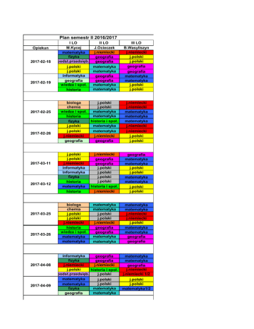 Plan semestr II 2016/2017 Opiekun 2017-02-18 2017-02-19 2017-02-25 2017-02-26 2017-03-11 2017-03-12 2017-03-25 2017-03-26 2017-04-08 2017-04-09 I LO II LO M.Kycej J.Ocieczek j.niemiecki matematyka fizyka geografia podst.przedsięb.. geografia j.polski matematyka j.polski matematyka informatyka geografia geografia geografia wiedza i społ. matematyka matematyka historia III LO B.Wasyliszyn j.niemiecki j.polski j.polski geografia geografia matematyka matematyka j.polski j.polski biologa chemia wiedza i społ. historia fizyka j.polski j.polski j.niemiecki geografia j.polski j.polski matematyka matematyka historia i społ. matematyka matematyka j.niemiecki geografia j.niemiecki j.niemiecki matematyka matematyka matematyka j.niemiecki j.niemiecki j.polski j.polski j.polski j.polski j.niemiecki informatyka informatyka fizyka historia matematyka historia j.niemiecki geografia geografia j.polski j.polski j.polski j.polski historia i społ. j.niemiecki geografia matematyka matematyka j.polski j.polski matematyka matematyka j.polski j.polski biologa chemia j.polski j.polski j.niemiecki historia wiedza i społ. matematyka matematyka matematyka matematyka j.polski j.polski j.niemiecki geografia geografia matematyka matematyka matematyka matematyka j.niemiecki j.niemiecki j.polski matematyka matematyka geografia geografia informatyka geografia fizyka geografia j.niemiecki j.niemiecki j.polski historia i społ. podst.przedsięb.. j.polski matematyka j.polski j.polski matematyka fizyka matematyka matematyka geografia matematyka matematyka geografia j.niemiecki j.niemiecki 1/2 j.polski j.polski matematyka1/2 2017-04-22 2017-04-23 2017-05-13 2017-05-14 2017-05-27 2017-05-28 geografia fizyka wiedza i społ. historia j.polski j.niemiecki matematyka matematyka podst.przedsięb.. podst.przedsięb.. j.polski informatyka matematyka j.polski matematyka historia i społ. j.polski j.niemiecki historia chemia matematyka biologa matematyka geografia biologa j.niemiecki geografia1/2 geografia chemia geografia biologa geografia historia i społ. matematyka historia podst.przedsięb.. matematyka informatyka j.polski j.polski j.polski j.polski j.niemiecki j.niemiecki matematyka1/2 historia chemia matematyka matematyka 2017-06-03 2017-06-04 j.polski j.polski matematyka matematyka j.niemiecki matematyka matematyka geografia geografia j.niemiecki historia i społ. geografia geografia j.polski