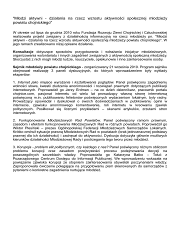"Młodzi aktywni - działania na rzecz wzrostu aktywności społecznej młodzieży powiatu chojnickiego" W okresie od lipca do grudnia 2010 roku Fundacja Rozwoju Ziemi Chojnickiej i Człuchowskiej realizowała projekt związany z działalnością informacyjną na rzecz młodzieży pn. "Młodzi aktywni - działania na rzecz wzrostu aktywności społecznej młodzieży powiatu chojnickiego". W jego ramach zrealizowano niżej opisane działania. Konsultacje dotyczące sposobów przygotowania i wdrażania inicjatyw młodzieżowych, organizowania wolontariatu i innych zagadnień związanych z aktywnością społeczną młodzieży. Skorzystać z nich mogli młodzi ludzie, nauczyciele, opiekunowie i inne zainteresowane osoby. Sejmik młodzieży powiatu chojnickiego - zorganizowany 21 września 2010. Program sejmiku obejmował realizację 3 paneli dyskusyjnych, do których wprowadzeniem były wykłady ekspertów: 1. Internet jako miejsce wyrażania i kształtowania poglądów. Panel poświęcony zagadnieniu wolności słowa, kwestii złudzenia anonimowości i rozwiązań prawnych dotyczących publikacji internetowych. Poprowadził go Jerzy Erdman – na co dzień dziennikarz, pracownik portalu chojnice.com, pasjonat internetu od wielu lat prowadzący własną stronę internetową poświęconą m.in. publikowaniu felietonów poświęconych wydarzeniom lokalnym, były radny. Prowadzący opowiadał i dyskutował o swoich doświadczeniach w publikowaniu opinii w internecie, zjawisku anonimowego komentowania, roli internetu w kreowaniu zjawisk politycznych. Posiłkował się licznymi przykładami – skanami artykułów, zrzutami stron internetowych. 2. Funkcjonowanie Młodzieżowych Rad Powiatów. Panel poświęcony ramom prawnym, zasadom i efektom funkcjonowania Młodzieżowych Rad w różnych powiatach. Poprowadził go Wiktor Plesiński – prezes Ogólnopolskiej Federacji Młodzieżowych Samorządów Lokalnych. Krótko omówił sytuacje prawną Młodzieżowych Rad w powiatach (brak jednoznacznej podstawy prawnej dla ich działalności) i zachęcał do aktywności. Dyskusja dotyczyła głównie możliwych kierunków działalności Młodzieżowej Rady i postrzegania tego tworu przez młodzież. 3. Korupcja - problem elit politycznych, czy każdego z nas? Panel poświęcony różnym obliczom problemu korupcji oraz zasadom przejrzystości procesu podejmowania decyzji na poszczególnych szczeblach władzy. Poprowadziła go Katarzyna Batko – Tołuć z Pozarządowego Centrum Dostępu do Informacji Publicznej. We wprowadzeniu wskazała na powiązanie zjawiska korupcji ze stopniem zainteresowania obywateli poczynaniami władzy. Zaproponowała ćwiczenie polegające na przygotowaniu pism skierowanych do samorządów z pytaniami o konkretne zagadnienia nurtujące młodzież. Szkolenie dla młodzieży szkół ponadgimnazjalnych "Jak skutecznie zorganizować kampanię społeczną?" - ukierunkowane na wyposażenie w umiejętność samodzielnego przygotowania kampanii zmierzających do realizacji społecznie użytecznych celów. Szkolenie poprowadził Radosław Sawicki - osoba doświadczona w organizacji kampanii i akcji społecznych. Zagadnienia tematyczne szkolenia to m.in.: planowanie kampanii społecznej (wyznaczanie celów, sojuszników, strategii działania, dobór narzędzi i ich odpowiednie przygotowanie, strategia finansowania), praktyczna umiejętność przygotowania komunikatu prasowego i organizacji konferencji prasowej, negocjacje. 4 spotkania 4 godzinne odbyły się w październiku 2010r. W gronie uczestników ukształtowała się nieformalna grupa "Młodzi aktywni", która podjęła działania na rzecz utworzenia w Chojnicach tzw. centrum młodzieży. Szkolenie dla osób pracujących z młodzieżą „Jak wspierać uczniów w podejmowaniu samodzielnych inicjatyw na rzecz społeczności lokalnej?" - szkolenie dla nauczycieli, liderów organizacji pozarządowych, opiekunów młodzieży i innych osób pracujących z młodzieżą mające na celu wyposażenie w wiedzę i narzędzia umożliwiające skuteczne wspieranie młodych osób w podejmowaniu samodzielnych inicjatyw na rzecz społeczności lokalnej. Szkolenie obejmowało takie zagadnienia tematyczne jak: rola edukacji pozaformalnej (w tym inicjatyw młodzieżowych) w kształtowaniu umiejętności przydatnych życiu młodego człowieka, programy wspierające finansowo inicjatywy młodzieżowe, wolontariat młodzieży zagadnienia prawne i praktyczne, rola organizacji pozarządowych w realizacji inicjatyw młodzieżowych i organizacji wolontariatu, metody wspierania i motywowania młodzieży przy zachowaniu samodzielnego charakteru ich inicjatywy. Zajęcia odbywały się 17 i 18 listopada (2 sesje wyjazdowe - ogółem 12 godzin).Poprowadził je Sławomir Mołda – na co dzień pracownik Centrum Edukacji i Inicjatyw Kulturalnych w Olsztynie, osoba z wieloletnią praktyką w animacji społeczno – kulturalnej młodzieży. Szkolenie „Różne oblicza wolontariatu" - szkolenie skierowane do młodzieży z terenu powiatu chojnickiego zainteresowanej działalnością na rzecz społeczności lokalnej. Zagadnienia tematyczne: definicja wolontariatu, prawa i obowiązki wolontariusza, wolontariat jako forma zdobycia doświadczenia zawodowego, wolontariat europejski w ramach programu „Młodzież w działaniu". Szkolenie potrwało 5 godzin , odbyło się 1 grudnia i poprowadziła je pani Ewa Kosiedowska. Projekt dofinansowany ze środków Programu Operacyjnego Fundusz Inicjatyw Obywatelskich.