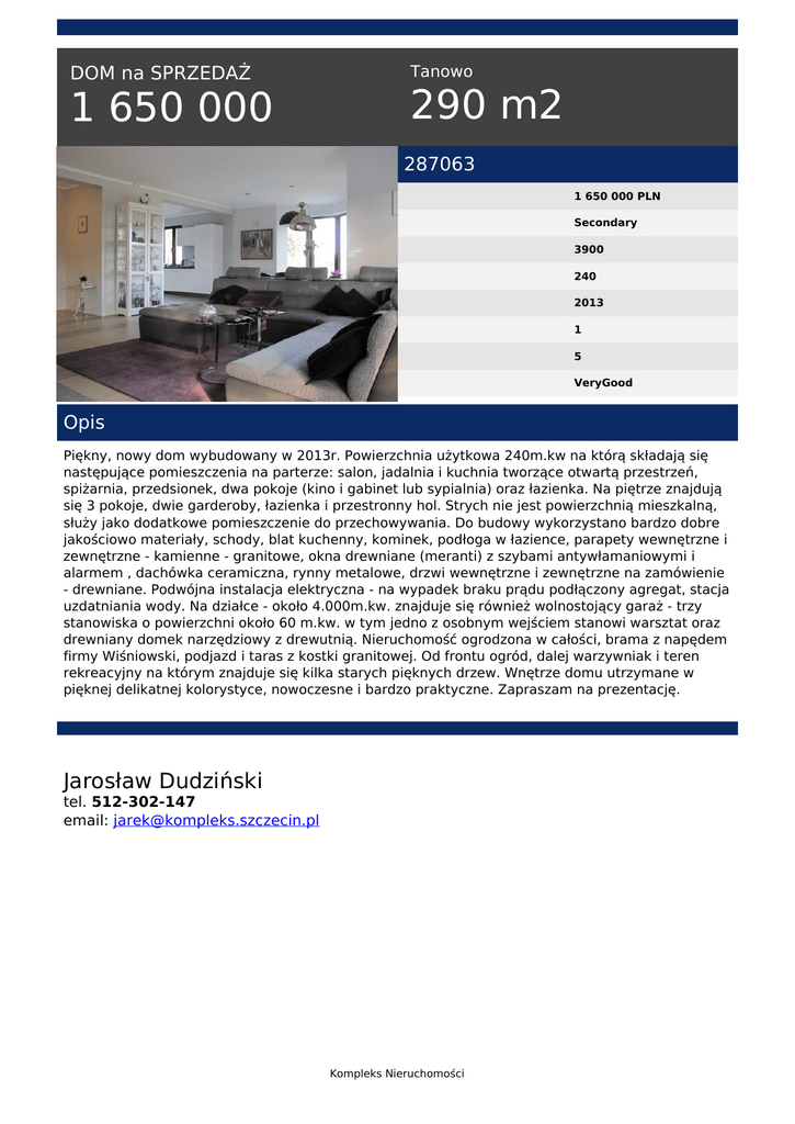 DOM na SPRZEDAŻ 1 650 000 Tanowo 290 m2 287063 1 650 000 PLN Secondary 3900 240 2013 1 5 VeryGood Opis Piękny, nowy dom wybudowany w 2013r. Powierzchnia użytkowa 240m.kw na którą składają się następujące pomieszczenia na parterze: salon, jadalnia i kuchnia tworzące otwartą przestrzeń, spiżarnia, przedsionek, dwa pokoje (kino i gabinet lub sypialnia) oraz łazienka. Na piętrze znajdują się 3 pokoje, dwie garderoby, łazienka i przestronny hol. Strych nie jest powierzchnią mieszkalną, służy jako dodatkowe pomieszczenie do przechowywania. Do budowy wykorzystano bardzo dobre jakościowo materiały, schody, blat kuchenny, kominek, podłoga w łazience, parapety wewnętrzne i zewnętrzne - kamienne - granitowe, okna drewniane (meranti) z szybami antywłamaniowymi i alarmem , dachówka ceramiczna, rynny metalowe, drzwi wewnętrzne i zewnętrzne na zamówienie - drewniane. Podwójna instalacja elektryczna - na wypadek braku prądu podłączony agregat, stacja uzdatniania wody. Na działce - około 4.000m.kw. znajduje się również wolnostojący garaż - trzy stanowiska o powierzchni około 60 m.kw. w tym jedno z osobnym wejściem stanowi warsztat oraz drewniany domek narzędziowy z drewutnią. Nieruchomość ogrodzona w całości, brama z napędem firmy Wiśniowski, podjazd i taras z kostki granitowej. Od frontu ogród, dalej warzywniak i teren rekreacyjny na którym znajduje się kilka starych pięknych drzew. Wnętrze domu utrzymane w pięknej delikatnej kolorystyce, nowoczesne i bardzo praktyczne. Zapraszam na prezentację. Jarosław Dudziński tel. 512-302-147 email: [email protected] Kompleks Nieruchomości Powered by TCPDF (www.tcpdf.org)