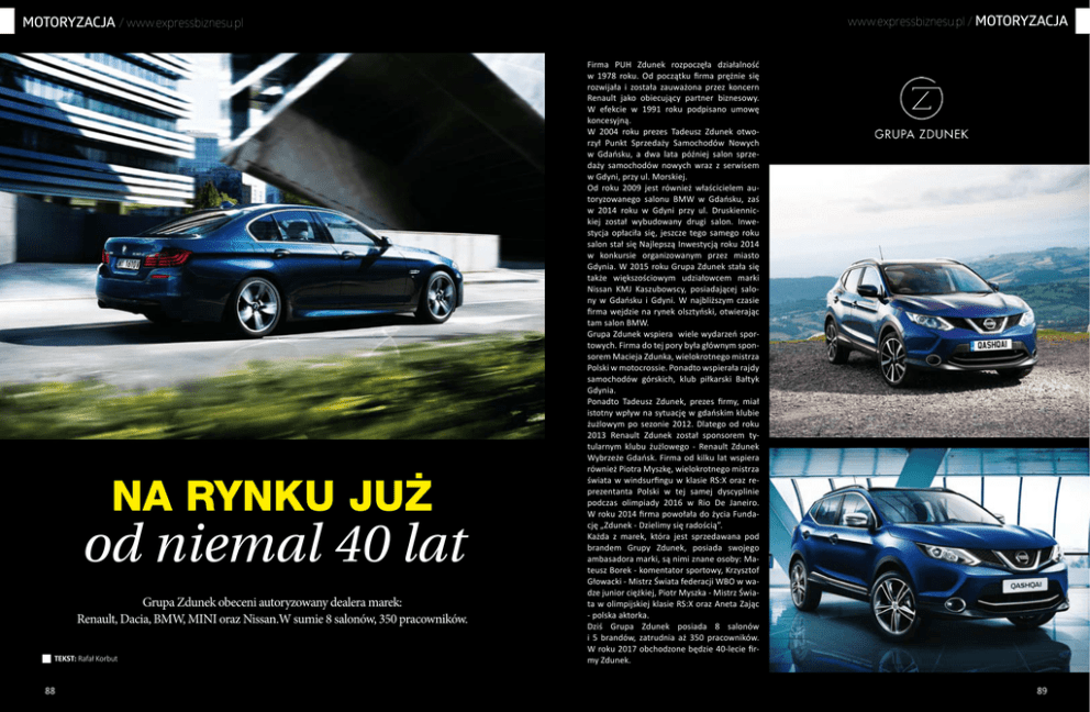 www.expressbiznesu.pl / MOTORYZACJA MOTORYZACJA / www.expressbiznesu.pl Na rynku już od niemal 40 lat Grupa Zdunek obeceni autoryzowany dealera marek: Renault, Dacia, BMW, MINI oraz Nissan.W sumie 8 salonów, 350 pracowników. TEKST: Rafał Korbut 88 Firma PUH Zdunek rozpoczęła działalność w 1978 roku. Od początku firma prężnie się rozwijała i została zauważona przez koncern Renault jako obiecujący partner biznesowy. W efekcie w 1991 roku podpisano umowę koncesyjną. W 2004 roku prezes Tadeusz Zdunek otworzył Punkt Sprzedaży Samochodów Nowych w Gdańsku, a dwa lata później salon sprzedaży samochodów nowych wraz z serwisem w Gdyni, przy ul. Morskiej. Od roku 2009 jest również właścicielem autoryzowanego salonu BMW w Gdańsku, zaś w 2014 roku w Gdyni przy ul. Druskiennickiej został wybudowany drugi salon. Inwestycja opłaciła się, jeszcze tego samego roku salon stał się Najlepszą Inwestycją roku 2014 w konkursie organizowanym przez miasto Gdynia. W 2015 roku Grupa Zdunek stała się także większościowym udziałowcem marki Nissan KMJ Kaszubowscy, posiadającej salony w Gdańsku i Gdyni. W najbliższym czasie firma wejdzie na rynek olsztyński, otwierając tam salon BMW. Grupa Zdunek wspiera wiele wydarzeń sportowych. Firma do tej pory była głównym sponsorem Macieja Zdunka, wielokrotnego mistrza Polski w motocrossie. Ponadto wspierała rajdy samochodów górskich, klub piłkarski Bałtyk Gdynia. Ponadto Tadeusz Zdunek, prezes firmy, miał istotny wpływ na sytuację w gdańskim klubie żużlowym po sezonie 2012. Dlatego od roku 2013 Renault Zdunek został sponsorem tytularnym klubu żużlowego - Renault Zdunek Wybrzeże Gdańsk. Firma od kilku lat wspiera również Piotra Myszkę, wielokrotnego mistrza świata w windsurfingu w klasie RS:X oraz reprezentanta Polski w tej samej dyscyplinie podczas olimpiady 2016 w Rio De Janeiro. W roku 2014 firma powołała do życia Fundację „Zdunek - Dzielimy się radością”. Każda z marek, która jest sprzedawana pod brandem Grupy Zdunek, posiada swojego ambasadora marki, są nimi znane osoby: Mateusz Borek - komentator sportowy, Krzysztof Głowacki - Mistrz Świata federacji WBO w wadze junior ciężkiej, Piotr Myszka - Mistrz Świata w olimpijskiej klasie RS:X oraz Aneta Zając - polska aktorka. Dziś Grupa Zdunek posiada 8 salonów i 5 brandów, zatrudnia aż 350 pracowników. W roku 2017 obchodzone będzie 40-lecie firmy Zdunek. 89