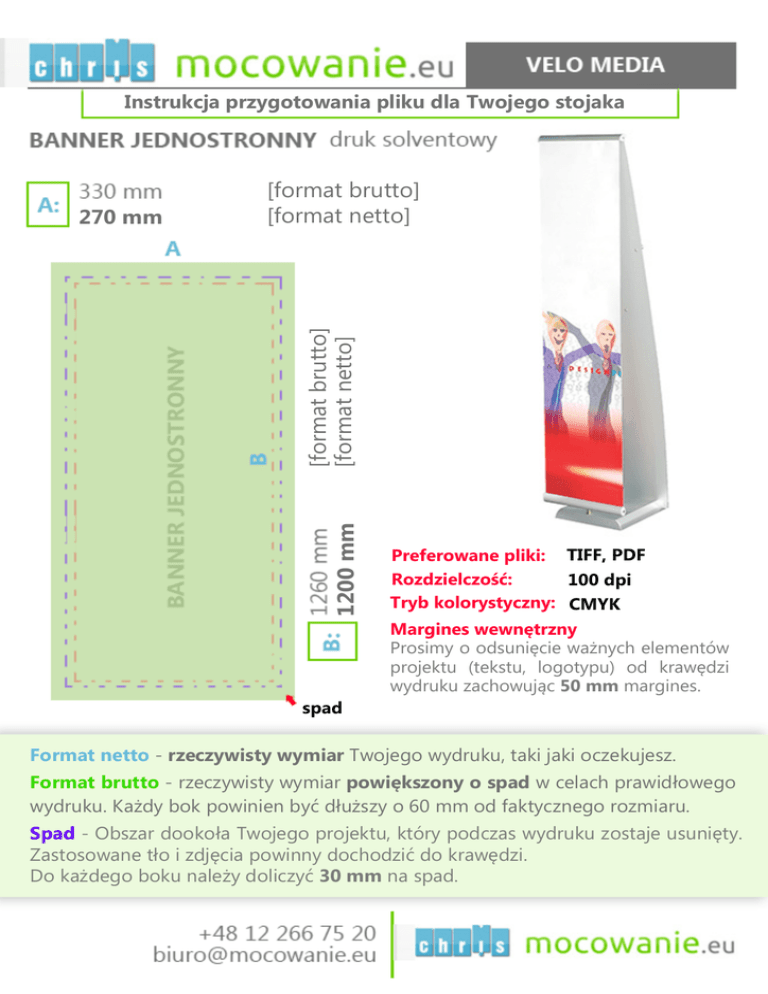 Instrukcja przygotowania pliku dla Twojego stojaka 1200 mm [format brutto] [format netto] 270 mm [format brutto] [format netto] spad Preferowane pliki: TIFF, PDF Rozdzielczość: 100 dpi Tryb kolorystyczny: CMYK Margines wewnętrzny Prosimy o odsunięcie ważnych elementów projektu (tekstu, logotypu) od krawędzi wydruku zachowując 50 mm margines. Format netto - rzeczywisty wymiar Twojego wydruku, taki jaki oczekujesz. Format brutto - rzeczywisty wymiar powiększony o spad w celach prawidłowego wydruku. Każdy bok powinien być dłuższy o 60 mm od faktycznego rozmiaru. Spad - Obszar dookoła Twojego projektu, który podczas wydruku zostaje usunięty. Zastosowane tło i zdjęcia powinny dochodzić do krawędzi. Do każdego boku należy doliczyć 30 mm na spad.