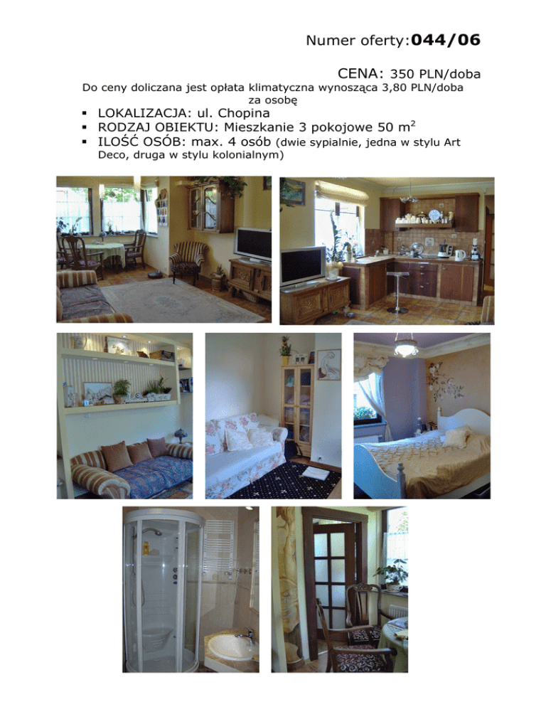 Numer oferty:044/06 CENA: 350 PLN/doba Do ceny doliczana jest opłata klimatyczna wynosząca 3,80 PLN/doba za osobę LOKALIZACJA: ul. Chopina RODZAJ OBIEKTU: Mieszkanie 3 pokojowe 50 m2 ILOŚĆ OSÓB: max. 4 osób (dwie sypialnie, jedna w stylu Art Deco, druga w stylu kolonialnym) Numer oferty: 044/06 LOKALIZACJA: ul. Chopina Lp. PRZEDMIOT OCENY UWAGI 1. Nowe/stare budownictwo Nowe budownictwo, monitorowane (alarm) 2. Nowe/stare meble Nowe meble, takŜe antyki 3. Parking na posesji/GaraŜ 1 miejsce parkingowe na ogrodzonej posesji 4. Balkon / taras / ogródek Ogródek 150 m2 5. Telewizor (Kablówka, TV Sat), Radio TV Kablowa 6. Dostęp do telefonu Nie 7. Dostęp do internetu Nie Kuchnia Kuchnia z pełnym wyposaŜeniem, lodówka, pralka, czajnik bezprzewodowy, płyta elektryczna 8. 9. Łazienka Łazienka z WC, prysznic z sauną i hydromasaŜem 10. Pościel, ręczniki Tak 11. Dostęp do szafy / półek Tak 12. Pobyt ze zwierzątkiem Do uzgodnienia 14. Niepełnosprawni (winda, podjazd) Tak (parter) 15. Plac zabaw dla dzieci W pobliŜu 16. 17. Lokalizacja • Centrum – Dworzec PKP • PlaŜa, park • Dzielnica • Komunikacja miejska Osoby palące Nie 18. Piwnica/schowek Nie 19. Faktura VAT lub Rachunek Faktura 20. Inne Malowidła na ścianach inspirowane twórczością Gustawa Klimta Centrum, 200 metrów do plaŜy, oraz 200 metrów do głównego deptaka ul. Bohaterów Monte Cassino, 300 metrów do dworca PKP