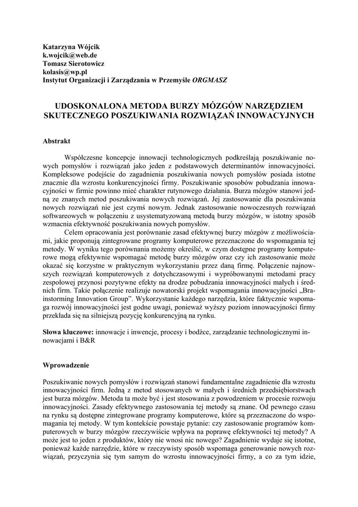 Katarzyna Wójcik [email protected] Tomasz Sierotowicz [email protected] Instytut Organizacji i Zarządzania w Przemyśle ORGMASZ UDOSKONALONA METODA BURZY MÓZGÓW NARZĘDZIEM SKUTECZNEGO POSZUKIWANIA ROZWIĄZAŃ INNOWACYJNYCH Abstrakt Współczesne koncepcje innowacji technologicznych podkreślają poszukiwanie nowych pomysłów i rozwiązań jako jeden z podstawowych determinantów innowacyjności. Kompleksowe podejście do zagadnienia poszukiwania nowych pomysłów posiada istotne znacznie dla wzrostu konkurencyjności firmy. Poszukiwanie sposobów pobudzania innowacyjności w firmie powinno mieć charakter rutynowego działania. Burza mózgów stanowi jedną ze znanych metod poszukiwania nowych rozwiązań. Jej zastosowanie dla poszukiwania nowych rozwiązań nie jest czymś nowym. Jednak zastosowanie nowoczesnych rozwiązań softwareowych w połączeniu z usystematyzowaną metodą burzy mózgów, w istotny sposób wzmacnia efektywność poszukiwania nowych pomysłów. Celem opracowania jest porównanie zasad efektywnej burzy mózgów z możliwościami, jakie proponują zintegrowane programy komputerowe przeznaczone do wspomagania tej metody. W wyniku tego porównania możemy określić, w czym dostępne programy komputerowe mogą efektywnie wspomagać metodę burzy mózgów oraz czy ich zastosowanie może okazać się korzystne w praktycznym wykorzystaniu przez daną firmę. Połączenie najnowszych rozwiązań komputerowych z dotychczasowymi i wypróbowanymi metodami pracy zespołowej przynosi pozytywne efekty na drodze pobudzania innowacyjności małych i średnich firm. Takie połączenie realizuje nowatorski projekt wspomagania innowacyjności „Brainstorming Innovation Group”. Wykorzystanie każdego narzędzia, które faktycznie wspomaga rozwój innowacyjności jest godne uwagi, ponieważ wyższy poziom innowacyjności firmy przekłada się na silniejszą pozycję konkurencyjną na rynku. Słowa kluczowe: innowacje i inwencje, procesy i bodźce, zarządzanie technologicznymi innowacjami i B&R Wprowadzenie Poszukiwanie nowych pomysłów i rozwiązań stanowi fundamentalne zagadnienie dla wzrostu innowacyjności firm. Jedną z metod stosowanych w małych i średnich przedsiębiorstwach jest burza mózgów. Metoda ta może być i jest stosowania z powodzeniem w procesie rozwoju innowacyjności. Zasady efektywnego zastosowania tej metody są znane. Od pewnego czasu na rynku są dostępne zintegrowane programy komputerowe, które są przeznaczone do wspomagania tej metody. W tym kontekście powstaje pytanie: czy zastosowanie programów komputerowych w burzy mózgów rzeczywiście wpływa na poprawę efektywności tej metody? A może jest to jeden z produktów, który nie wnosi nic nowego? Zagadnienie wydaje się istotne, ponieważ każde narzędzie, które w rzeczywisty sposób wspomaga generowanie nowych rozwiązań, przyczynia się tym samym do wzrostu innowacyjności firmy, a co za tym idzie, Udoskonalona metoda burzy mózgów narzędziem skutecznego poszukiwania rozwiązań ... 41 wzrasta wówczas poziom konkurencyjności firmy. Jakkolwiek nie dysponujemy wyczerpującym materiałem empirycznym w tej dziedzinie, ponieważ zagadnienie stanowi nowe zjawisko i jest obecnie stosowane w dość wąskim zakresie. Jednak zainteresowanie tego rodzaju narzędziami komputerowymi wzrasta. Pojawiają się nowe, zintegrowane systemy programów komputerowych, przeznaczone do wspomagania burzy mózgów, które niekiedy wykorzystują sieć internetową. W jaki sposób ocenić ich przydatność? Czy inwestycja w kolejne oprogramowanie oraz w szkolenie jego wykorzystania mogą okazać się korzystne? Projekt „Brainstorming Innovation Group (BIG)”, działający w „Technology Enterprise Kent” w Anglii, wykorzystuje program komputerowy w trakcie sesji burzy mózgów, który wydobywa i wychwytuje ciekawe pomysły w bardziej profesjonalny i elastyczny sposób niż tradycyjne metody (European Innovation, 2006, s 19). Innym przykładem jest firma Georgia – Paciffic, która obecnie od 3 lat korzysta ze zintegrowanego systemu komputerowego, dedykowanego do wspomagania generacji pomysłów innowacyjnych. Celem opracowania jest porównanie zasad efektywnego przeprowadzania sesji burzy mózgów z możliwościami, jakie są proponowane przez programy komputerowe, przeznaczone do wspomagania tej metody. Dzięki temu, możemy ocenić, w jakim stopniu zastosowanie programu komputerowego może przyczynić się do efektywniejszego poszukiwania nowych rozwiązań. Wydaje się, że zastosowanie dedykowanego oprogramowania oraz szkolenie w jego pełnym użyciu może przynieść wymierny wzrost pomysłów innowacyjnych, które bardzo często stanowią pierwszy impuls na drodze rozwoju innowacji, a zatem podniesienia poziomu konkurencyjnej pozycji firmy na rynku, czego przykładem jest wspomniana firma Georgia – Pacific Corp. Poszukiwanie pomysłów innowacyjnych Współczesne modele innowacji podkreślają znaczenie badań, wzrostu wiedzy oraz oczekiwań rynku. Podstawowym modelem innowacji, który podkreśla znaczenie tych czynników jest model łańcuchowy Klina – Rosenberga. Oczekiwania rynku stanowią wyzwania dla firm. Firma zamierza rozwiązać je w taki sposób, aby zaspokoić oczekiwania rynku w sposób innowacyjny. Jeśli rynek zaakceptuje rozwiązanie, wówczas innowacja odnosi sukces. Dla realizacji oczekiwań rynku potrzebny jest określony poziom wiedzy i możliwości technologicznych przedsiębiorstwa. Ograniczenia w tej dziedzinie niejednokrotnie uniemożliwia realizacje najlepszego pomysłu innowacyjnego. Dlatego badania, które podnoszą poziom wiedzy i możliwości technologicznych stanowią istotny czynnik w procesie wzrostu innowacyjności a co za tym idzie konkurencyjności firmy. Model łańcuchowy, przedstawiony na rysunku 1, uwzględnia poszukiwanie nowych rozwiązań w każdej dziedzinie naszego życia. Przedstawia on przebieg ścieżek przepływu informacji w formie strzałek 
