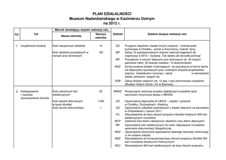 PLAN DZIAŁALNOŚCI Muzeum Nadwiślańskiego w Kazimierzu Dolnym na 2012 r. Miernik określający stopień realizacji celu Lp. Cel 1 Uzupełnianie kolekcji Wartość miernika Oddział Zadanie służące realizacji celu Ilość zakupionych obiektów 10 GŻ Ilość obiektów pozyskanych w ramach prac terenowych 100 MP Przyjęcie zabytków z badań innych instytucji: cmentarzysko kurhanowe w Chodliku, zamek w Kazimierzu, kościół farny Zakup 10 wypreparowanych okazów zwierząt kręgowych do organizacji w 2013 r. wystawy „Tak daleko jak skrzydła poniosą” Pozyskanie w ramach własnych prac terenowych ok. 40 nowych gatunków roślin, 50 okazów owadów i 10 skamieniałości Kontynuowanie działań zmierzających do pozyskania w formie darów lub depozytów najnowszych prac czołowych artystów projektantów, poprzez indywidualne rozmowy i udział w wernisażach wstaw, pokazach, targach itp. Nazwa miernika MP MSZ DDB 2 Katalogowanie i naukowe opracowywanie zbiorów Ilość założonych kart ewidencyjnych Ilość wpisów dokonanych w bazie MusNet Ilość tomów dokumentacji 25 MNKD 1 000 GŻ 1 GŻ KC MCP MP MSZ MSZ MZJ Zakup druków zwartych (ok. 12 egz.) oraz prenumerata czasopism (Biuletyn Historii Sztuki i Art & Business) Rozpoczęcie realizacja projektu digitalizacji muzealiów (pod warunkiem otrzymania dotacji z MKiDN) Opracowanie depozytów IA UMCS – zabytki z grodzisk w Chodliku, Żmijowiskach i Kłodnicy Opracowanie zabytków wydzielonych z badań własnych na stanowisku w Żmijowiskach z sezonu 2011 Wprowadzenie do bazy danych programu MusNet kolejnych 500 kart ewidencyjnych muzealiów Założenie kart dwóm zakupionym obiektom oraz dwóm depozytom Opracowanie kart ewidencyjnych do nowo nabywanych muzealiów, wykonanie dokumentacji fotograficznej Opracowanie elementów wyposażenia dawnego warsztatu złotniczego (o ile zostana nabyte) Wprowadzenie do komputerowej bazy danych programu MusNet 200 kart muzealiów artystyczno-historycznych Wprowadzenie 300 kart ewidencyjnych do bazy danych programu MusNet 3 Przechowywanie zbiorów - Ilość zmodernizowanych poprawa warunków Dokończenie kolejnego etapu oracowywania wyników badań wykopaliskowych zamku w Janowcu (sezony 1982 i 1996) 1 GŻ Zakup pudeł magazynowych (200 szt.) 2 KC Przeniesienie zbiorów i ich właściwe rozmieszczenie zmodernizowanym magazynie KC Zakup nawilżaczy (2 szt.) GŻ Konserwacja zabytków archeologicznych z badań Żmijowiskach: 6 naczyń ceramicznych, 4 zabytki żelazne MP Zakup materiałów do połowu, preparowania, przechowywania i konserwacji zbiorów Oczyszczenie (siłami własnymi) ok. 100 szt. sreber dawnych i współczesnych prezentowanych na wystawie stałej MSZ magazynów Ilość zakupionych urządzeń pomiarowych i klimatyzacyjnych 4 Konserwowanie zbiorów i Ilość zakonserwowanych / profilaktyka konserwatorska MZJ 110 zrekonstruowanych obiektów MSZ 5 Zabezpieczanie i restauracja nieruchomych obiektów kultury materialnej i przyrody 6 Urządzanie wystaw stałych i czasowych w w Ilość prac remontowych wykonanych przy obiektach zabytkowych 9 Ilość prezentowanych wystaw stałych Ilość zmodernizowanych wystaw stałych Ilość zrealizowanych nowych wystaw stałych Ilośc prezentowanych wystaw czasowych Ilość nowo zorganizowanych wystaw czasowych Ilość opracowanych koncepcji, scenariuszy przyszłych wystaw 12 DMJK Prezentacja ekspozycji stałej - wnętrz domu Kuncewiczów 2 DMJK 1 DMJK Organizacja wystawy malarstwa Ewy Siemińskiej (połączona ze spotkaniem literackim) Przygotowanie prezentacji "Mapa podróży Marii Kuncewiczowej" 4 DMJK Organizacja wystawy "MSZ w Domu Kuncewiczów - wrzesień 1939: 9 GŻ 3 GŻ Uzupełnienie ekspozycji w skansenie – elementy wyposażenia stałego (paleniska kamienne, sprzęty domowe itp.) Wystawa czasowa „Ceramika chodlikowska….” KC KC Prezentacja wystawy stałej „Kolonia artystyczna…” Prezentacja wystawy czasowej "Hartwig. Dorys. Magierski" przedstawiono w pkt. 14 KC KC KC KC KC KC KC KC MCP MCP MCP MP MP MP MP MP MSZ MSZ Organizacja wystawy czasowej "Jacek Sempoliński. Na skrzyżowaniu z Kazimierzem" Organizacja wystawy czasowej "Jan Cybis" Organizacja wystawy czasowej "Henryk Dąbrowski. 50 lat później" Organizacja wystawy czasowej "Anatol Martyniuk – malarz z Krzemieńca" Przygotowania do wystaw czasowych twórczości Władysława Skoczylasa oraz Chaima Goldberga (otwarcia planowane na rok 2013) Udział 2 obrazów T. Pruszkowskiego w wystawie „Polowanie na awangardę. Zakazana sztuka w Trzeciej Rzeszy” w Międzynarodowym Centrum Kultury w Krakowie Użyczenie 2 obrazów T. Pruszkowskiego na wystawę „Hunting down the modernism…" do Muzeum Sztuki w Mülheim (Niemcy) Użyczenie obrazów na wystawę "Sztuka wszędzie. ASP w Warszawie 1904-1944” organizowaną przez Zachętę w Warszawa Wystawa: „Czartoryscy. Powrót do Puław” - ponowne urządzenie i dalsza prezentacja Uzupełnienia i zmiany w wystawie stałej wynikające z potrzeby oddania części depozytów Zrealizowanie ekspozycji wnętrz historycznych głównego korpusu Pałacu Czartoryskich (sieni, klatki schodowej, sal: Kamiennej, Gotyckiej i Rycerskiej) Renowacja i prezentacja wystaw stałych: „W przełomowej dolinie środkowej Wisły”, "W krainie wąwozów” , „Tajemnice wymarłego świata”, „Nasze drzewa i krzewy” Ponowna instalacja szklanego ula z pszczołami, reaktywowanie mrowiska, utrzymanie wiślanego akwarium Opracowanie programu przystosowania wystaw dla osób niewidomych i słabo widzących wraz ze scenariuszami zajęć edukacyjnych Kontynuacja prac koncepcyjnych nad wystawą „Cud ptasiej wędrówki. Tak daleko jak skrzydła poniosą” - współpraca z Muzeum Przyrodniczym w Erfurcie Wystawa fotograficzna Macieja Szajowskiego – otwarcie w ramach obchodów „Dnia Ziemi 2012” W budynku dzwonnicy - tymczasowej siedzibie MSZ - nadal eksponowana będzie wystawa stała „Złotnictwo polskie i obce od XV do XXI w.” Prezentowana będzie 