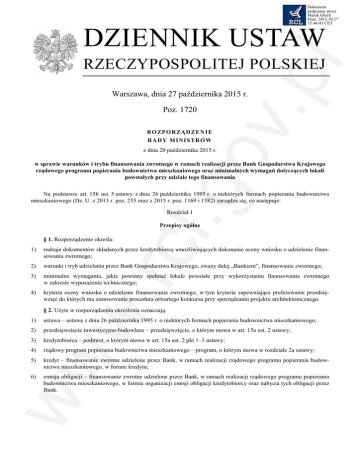 Dokument podpisany przez Marek Głuch Data: 2015.10.27 15:44:43 CET l.g ov .pl DZIENNIK USTAW RZECZYPOSPOLITEJ POLSKIEJ Warszawa, dnia 27 października 2015 r. Poz. 1720 RO ZP O R ZĄ D ZE N I E RA DY M I NI S TR Ó W z dnia 20 października 2015 r. w sprawie warunków i trybu finansowania zwrotnego w ramach realizacji przez Bank Gospodarstwa Krajowego rządowego programu popierania budownictwa mieszkaniowego oraz minimalnych wymagań dotyczących lokali powstałych przy udziale tego finansowania Na podstawie art. 15b ust. 5 ustawy z dnia 26 października 1995 r. o niektórych formach popierania budownictwa mieszkaniowego (Dz. U. z 2013 r. poz. 255 oraz z 2015 r. poz. 1169 i 1582) zarządza się, co następuje: Rozdział 1 Przepisy ogólne 1) 2) 3) 4) w. rc § 1. Rozporządzenie określa: rodzaje dokumentów składanych przez kredytobiorcę umożliwiających dokonanie oceny wniosku o udzielenie finansowania zwrotnego; warunki i tryb udzielania przez Bank Gospodarstwa Krajowego, zwany dalej „Bankiem”, finansowania zwrotnego; minimalne wymagania, jakie powinny spełniać lokale powstałe przy wykorzystaniu finansowania zwrotnego w zakresie wyposażenia technicznego; kryteria oceny wniosku o udzielenie finansowania zwrotnego, w tym kryteria zapewniające preferowanie przedsięwzięć do których ma zastosowanie procedura otwartego konkursu przy sporządzaniu projektu architektonicznego. § 2. Użyte w rozporządzeniu określenia oznaczają: 1) 2) 3) przedsięwzięcie inwestycyjno-budowlane – przedsięwzięcie, o którym mowa w art. 15a ust. 2 ustawy; kredytobiorca – podmiot, o którym mowa w art. 15a ust. 2 pkt 1–3 ustawy; rządowy program popierania budownictwa mieszkaniowego – program, o którym mowa w rozdziale 2a ustawy; ww 4) ustawa – ustawę z dnia 26 października 1995 r. o niektórych formach popierania budownictwa mieszkaniowego; 5) kredyt – finansowanie zwrotne udzielone przez Bank, w ramach realizacji rządowego programu popierania budownictwa mieszkaniowego, w formie kredytu; 6) emisja obligacji – finansowanie zwrotne udzielone przez Bank, w ramach realizacji rządowego programu popierania budownictwa mieszkaniowego, w formie organizacji emisji obligacji kredytobiorcy oraz nabycia tych obligacji przez Bank. Dziennik Ustaw –2– Poz. 1720 Rozdział 2 l.g ov .pl Warunki i tryb udzielania finansowania zwrotnego w ramach realizacji rządowego programu popierania budownictwa mieszkaniowego oraz wymagania dotyczące wyposażenia technicznego lokali finansowanych w ramach tego programu § 3. 1. Kredyt lub emisja obligacji może dotyczyć wyłącznie przedsięwzięcia inwestycyjno-budowlanego, które zostało rozpoczęte nie wcześniej niż w dniu 1 lipca 2015 r. oraz nie później niż w okresie 2 lat od złożenia wniosku, o którym mowa w § 4 ust. 1. 2. Przez rozpoczęcie przedsięwzięcia inwestycyjno-budowlanego rozumie się: 1) podjęcie robót ziemnych w formie wykopów do posadowienia budynku – w przypadku przedsięwzięcia polegającego na budowie, 2) podjęcie robót ziemnych w formie wykopów do posadowienia budynku dla kolejnego etapu inwestycji wieloetapowej, której dotyczy jedna decyzja o pozwoleniu na budowę – w przypadku wieloetapowego przedsięwzięcia polegającego na budowie, 3) podjęcie lub wznowienie robót budowlanych – w przypadku przedsięwzięcia polegającego na przebudowie, rozbudowie, nadbudowie, zmianie sposobu użytkowania lub dokończeniu inwestycji będącej w trakcie realizacji – potwierdzone wpisem do dziennika budowy. 3. W przypadku gdy zapotrzebowanie na finansowanie zwrotne wynikające z wniosków złożonych w danym roku przekracza limit środków, o którym mowa w § 6 ust. 1, łączna kwota finansowania zwrotnego udzielonego jednemu kredytobiorcy nie może przekroczyć 15% tych środków. § 4. 1. Wniosek o udzielenie finansowania zwrotnego, zwany dalej „wnioskiem”, jest składany jednocześnie w postaci papierowej i elektronicznej w Banku. w. rc 2. Nabór wniosków odbywa się corocznie w okresie od dnia 1 do dnia 30 września, nie później jednak niż do dnia 30 września 2024 r. 3. Do wniosku w postaci papierowej dołącza się na etapie jego złożenia: 1) 2) 3) 4) 5) poświadczoną za zgodność z oryginałem kopię umowy, o której mowa w art. 15a ust. 3 ustawy; odpis z Krajowego Rejestru Sądowego, umowę albo statut spółki, albo statut spółdzielni; odpis z księgi wieczystej finansowanej nieruchomości, a w przypadku braku ujawnienia kredytobiorcy jako właściciela lub użytkownika wieczystego – inny dokument potwierdzający jego tytuł prawny do nieruchomości; wyciąg z miejscowego planu zagospodarowania przestrzennego lub programu w zakresie rewitalizacji – w przypadku przedsięwzięć inwestycyjno-budowlanych realizowanych na obszarze objętym tym planem lub programem; kserokopię stron dziennika budowy potwierdzających rozpoczęcie przedsięwzięcia inwestycyjno-budowlanego lub oświadczenie, że przedsięwzięcie inwestycyjno-budowlane zostanie rozpoczęte nie później niż w terminie, o którym mowa w § 3 ust. 1; ww 6) prawomocną decyzję o pozwoleniu na budowę albo zgłoszenie właściwemu organowi wykonywania robót budowalnych, do którego nie wniesiono sprzeciwu – zgodnie z przepisami ustawy z dnia 7 lipca 1994 r. – Prawo budowlane (Dz. U. z 2013 r. poz. 1409, z późn. zm.1)); 7) dokumenty niezbędne do przeprowadzenia oceny wiarygodności kredytowej, o których mowa w § 5 ust. 2. 4. W przypadku, o którym mowa w § 7, Bank wzywa kredytobiorcę do dołączenia do wniosku, w terminie określonym w wezwaniu, dodatkowych dokumentów niezbędnych do podjęcia decyzji kredytowej, w tym: 1) 1) propozycji zabezpieczenia spłaty kredytu lub zabezpieczenia obligacji, przy czym obligatoryjne zabezpieczenia stanowią hipoteka na finansowanej nieruchomości, przelew wierzytelności z tytułu należnych czynszów z finansowanej nieruchomości, przelew wierzytelności z umów ubezpiecze