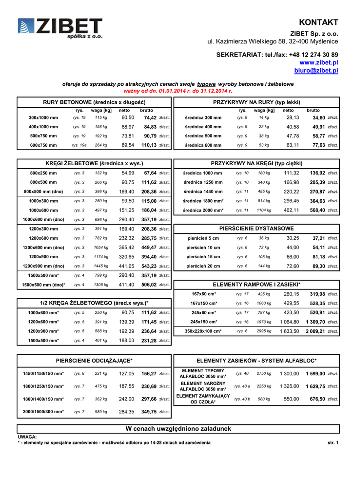 KONTAKT ZIBET Sp. z o.o. ul. Kazimierza Wielkiego 58, 32-400 Myślenice SEKRETARIAT: tel./fax: +48 12 274 30 89 www.zibet.pl [email protected] oferuje do sprzedaży po atrakcyjnych cenach swoje typowe wyroby betonowe i żelbetowe ważny od dn. 01.01.2014 r. do 31.12.2014 r. RURY BETONOWE (średnica x długość) netto PRZYKRYWY NA RURY (typ lekki) rys. waga [kg] rys. waga [kg] 300x1000 mm rys. 19 115 kg 60,50 brutto 74,42 zł/szt. średnica 300 mm rys. 9 14 kg 28,13 34,60 zł/szt. 400x1000 mm rys. 19 158 kg 68,97 84,83 zł/szt. średnica 400 mm rys. 9 22 kg 40,58 49,91 zł/szt. 500x750 mm rys. 19 192 kg 73,81 90,79 zł/szt. średnica 500 mm rys. 9 38 kg 47,78 58,77 zł/szt. 600x750 mm rys. 19a 264 kg 89,54 średnica 600 mm rys. 9 53 kg 63,11 77,63 zł/szt. 110,13 zł/szt. KRĘGI ŻELBETOWE (średnica x wys.) netto brutto PRZYKRYWY NA KRĘGI (typ ciężki) 800x250 mm rys. 3 132 kg 54,99 67,64 zł/szt. średnica 1000 mm rys. 10 180 kg 111,32 136,92 zł/szt. 800x500 mm rys. 3 266 kg 90,75 111,62 zł/szt. średnica 1250 mm rys. 10 340 kg 166,98 205,39 zł/szt. 800x500 mm (dno) rys. 3 386 kg 169,40 208,36 zł/szt. średnica 1440 mm rys. 11 485 kg 220,22 270,87 zł/szt. 1000x300 mm rys. 3 250 kg 93,50 115,00 zł/szt. średnica 1800 mm* rys. 11 814 kg 296,45 364,63 zł/szt. 1000x600 mm rys. 3 497 kg 151,25 186,04 zł/szt. średnica 2000 mm* rys. 11 1104 kg 462,11 568,40 zł/szt. 1000x600 mm (dno) rys. 3 686 kg 290,40 357,19 zł/szt. 1200x300 mm rys. 3 391 kg 169,40 208,36 zł/szt. 1200x600 mm rys. 3 782 kg 232,32 285,75 zł/szt. pierścień 5 cm rys. 6 1200x600 mm (dno) rys. 3 1054 kg 365,42 449,47 zł/szt. pierścień 10 cm 1200x900 mm rys. 3 1174 kg 320,65 394,40 zł/szt. 1200x900 mm (dno) rys. 3 1445 kg 441,65 543,23 1500x500 mm* rys. 4 799 kg 290,40 357,19 zł/szt. 1500x500 mm (dno)* rys. 4 1308 kg 411,40 506,02 zł/szt. zł/szt. 1/2 KRĘGA ŻELBETOWEGO (śred.x wys.)* PIERŚCIENIE DYSTANSOWE 36 kg 30,25 37,21 zł/szt. rys. 6 72 kg 44,00 54,11 zł/szt. pierścień 15 cm rys. 6 108 kg 66,00 81,18 zł/szt. pierścień 20 cm rys. 6 144 kg 72,60 89,30 zł/szt. ELEMENTY RAMPOWE I ZASIEKI* 167x60 cm* rys. 17 425 kg 260,15 319,98 zł/szt. 167x150 cm* rys. 16 1063 kg 429,55 528,35 zł/szt. 1000x600 mm* rys. 5 250 kg 90,75 111,62 zł/szt. 245x60 cm* rys. 17 787 kg 423,50 520,91 zł/szt. 1200x600 mm* rys. 5 391 kg 139,39 171,45 zł/szt. 245x150 cm* rys. 16 1970 kg 1 064,80 1 309,70 zł/szt. 1200x900 mm* rys. 5 588 kg 192,39 236,64 zł/szt. 350x220x100 cm* rys. 6 2995 kg 1 633,50 2 009,21 zł/szt. 1500x500 mm* rys. 4 401 kg 188,03 231,28 zł/szt. ELEMENTY ZASIEKÓW - SYSTEM ALFABLOC* PIERŚCIENIE ODCIĄŻAJĄCE* 1450/1150/150 mm* rys. 8 221 kg 127,05 156,27 zł/szt. ELEMENT TYPOWY ALFABLOC 3050 mm* rys. 40 2750 kg 1 300,00 1 599,00 zł/szt. 1800/1250/150 mm* rys. 7 475 kg 187,55 230,69 zł/szt. ELEMENT NAROŻNY ALFABLOC 3050 mm* rys. 40 a 2250 kg 1 325,00 1 629,75 zł/szt. 1800/1400/150 mm* rys. 7 362 kg 242,00 297,66 zł/szt. ELEMENT ZAMYKAJĄCY rys. 40 b OD CZOŁA* 580 kg 550,00 676,50 zł/szt. 2000/1500/300 mm* rys. 7 989 kg 284,35 349,75 zł/szt. W cenach uwzględniono załadunek UWAGA: * - elementy na specjalne zamówienie - możliwość odbioru po 14-28 dniach od zamówienia str. 1 KONTAKT ZIBET Sp. z o.o. ul. Kazimierza Wielkiego 58, 32-400 Myślenice SEKRETARIAT: tel./fax: +48 12 274 30 89 www.zibet.pl [email protected] oferuje do sprzedaży po atrakcyjnych cenach swoje typowe wyroby betonowe i żelbetowe ważny od dn. 01.01.2014 r. do 31.12.2014 r. PREFABRYKOWANE ELEMENTY ZBIORNIKÓW ŻELBETOWYCH* rys. Element z dnem* 230x260 cm, h=100 cm Objętość = 4,9 m3 rys. 22 Element pośredni* 230x260 cm, h=100 cm Objętość = 5,0 m3 rys. 23 Komplet nakrywczy (typ cięzki)* rys. 22 waga [kg] 4900 kg 3897 kg 1368 kg netto ELEMENTY DROGOWE (wym. w cm)* brutto 2 545,54 3 131,01 zł/szt. 1 481,04 1 821,68 zł/szt. 833,09 1 024,69 zł/szt. Płyty drogowe* 300x150x15 cm Płyty drogowe* 300x150x18 cm Płyty ażurowe (żelb.)* 60x90x10 cm Płyty ażurowa betonowa* 60x90x10 cm Płyty "IOMB"* 100x75x12,5 cm Elementy ściekowe* 50x50x12 cm Elementy ściekowe* 40x50x18 cm Elementy ściekowe* 50x50x25 cm Elementy ściekowe* 50x60x50 cm Elementy ściekowe* 100x28x14 cm Elementy ściekowe* 50x50x50 cm Elementy ściekowe* 70x70x50 cm rys. waga [kg] netto brutto rys. 13 1620 kg 435,60 535,79 zł/szt. rys. 14 1944 kg 629,20 773,92 zł/szt. rys. 12 103 kg 39,93 49,11 zł/szt. rys. 12 103 kg 30,25 37,21 zł/szt. rys. 15 170 kg 99,22 122,04 zł/szt. rys. 1 60 kg 15,73 19,35 zł/szt. rys. 2 38 kg 19,36 23,81 zł/szt. rys. 2 76 kg 22,99 28,28 zł/szt. rys. 2 144 kg 50,82 62,51 zł/szt. rys. 1 72 kg 30,25 37,21 zł/szt. rys. 1 146 kg 57,48 70,69 zł/szt. rys. 1 228 kg 82,28 101,20 zł/szt. W cenach uwzględniono załadunek UWAGA: * - elementy na specjalne zamówienie - możliwość odbioru po 14-28 dniach od zamówienia str. 2 KONTAKT ZIBET Sp. z o.o. ul. Kazimierza Wielkiego 58, 32-400 Myślenice SEKRETARIAT: tel./fax: +48 12 274 30 89 www.zibet.pl [email protected] oferuje do sprzedaży po atrakcyjnych cenach swoje nietypowe wyroby betonowe i żelbetowe ważny od dn. 01.01.2014 r. do 31.12.2014 r. PREFABRYKOWANE ELEMENTY PRZELOTOWE "Z" ŻELBETOWE - zbrojone podwójną siatką* rys. waga [kg] netto brutto Element typ A 70x140 cm, h= 50 cm rys. 28 456 kg 185,13 227,71 zł/szt. Element typ B 130x230 cm, h=100 cm rys. 29 2400 kg Element typ C 230x260 cm, h=100 cm rys. 30 Element zamknięty 100x150x100 cm rys. 41 PREFABRYKOWANE ELEMENTY OTWARTE "O" ŻELBETOWE - zbrojone podwójną siatką* rys. waga [kg] Element typ D 60x140 cm, h=50 cm rys. 35 288 kg 129,59 159,40 zł/szt. 925,65 1 138,55 zł/szt. Element typ E 110x230 cm, h=100 cm rys. 36 2112 kg 601,67 740,06 zł/szt. 3897 kg 1 481,04 1 821,68 zł/szt. Element typ F 130x230 cm, h=100 cm rys. 37 2189 kg 786,80 967,77 zł/szt. 2616 kg 1 000,00 1 230,00 zł/szt. Element typ G 130x350 cm, h=100 cm rys. 38 3931 kg 1 481,04 1 821,68 zł/szt. Element typ H 168x230 cm, h=100 cm ry