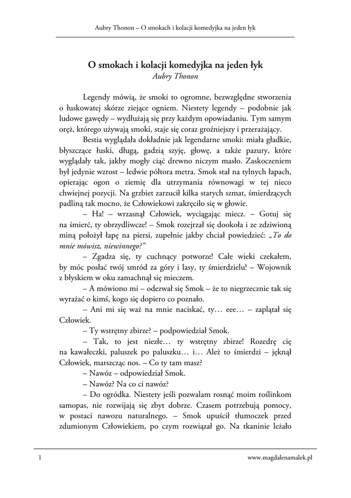 Aubry Thonon – O smokach i kolacji komedyjka na jeden łyk O smokach i kolacji komedyjka na jeden łyk Aubry Thonon Legendy mówią, że smoki to ogromne, bezwzględne stworzenia o łuskowatej skórze ziejące ogniem. Niestety legendy – podobnie jak ludowe gawędy – wydłużają się przy każdym opowiadaniu. Tym samym oręż, którego używają smoki, staje się coraz groźniejszy i przerażający. Bestia wyglądała dokładnie jak legendarne smoki: miała gładkie, błyszczące łuski, długą, gadzią szyję, głowę, a także pazury, które wyglądały tak, jakby mogły ciąć drewno niczym masło. Zaskoczeniem był jedynie wzrost – ledwie półtora metra. Smok stał na tylnych łapach, opierając ogon o ziemię dla utrzymania równowagi w tej nieco chwiejnej pozycji. Na grzbiet zarzucił kilka starych szmat, śmierdzących padliną tak mocno, że Człowiekowi zakręciło się w głowie. – Ha! – wrzasnął Człowiek, wyciągając miecz. – Gotuj się na śmierć, ty obrzydliwcze! – Smok rozejrzał się dookoła i ze zdziwioną miną położył łapę na piersi, zupełnie jakby chciał powiedzieć: „To do mnie mówisz, niewinnego?” – Zgadza się, ty cuchnący potworze! Całe wieki czekałem, by móc posłać twój smród za góry i lasy, ty śmierdzielu! – Wojownik z błyskiem w oku zamachnął się mieczem. – A mówiono mi – odezwał się Smok – że to niegrzecznie tak się wyrażać o kimś, kogo się dopiero co poznało. – Ani mi się waż na mnie naciskać, ty… eee… – zaplątał się Człowiek. – Ty wstrętny zbirze? – podpowiedział Smok. – Tak, to jest niezłe… ty wstrętny zbirze! Rozedrę cię na kawałeczki, paluszek po paluszku… i… Ależ to śmierdzi – jęknął Człowiek, marszcząc nos. – Co ty tam masz? – Nawóz – odpowiedział Smok. – Nawóz? Na co ci nawóz? – Do ogródka. Niestety jeśli pozwalam rosnąć moim roślinkom samopas, nie rozwijają się zbyt dobrze. Czasem potrzebują pomocy, w postaci nawozu naturalnego. – Smok upuścił tłumoczek przed zdumionym Człowiekiem, po czym rozwiązał go. Na tkaninie leżało 1 www.magdalenamalek.pl Aubry Thonon – O smokach i kolacji komedyjka na jeden łyk kilka krowich placków. – Najlepsza jakość, mówię ci. Od świętej krowy. Nie kupisz tego w pierwszym lepszym wiejskim sklepie, się wie. – Ale… roślinki? – zapiszczał Człowiek. – Nikt cię jeszcze nie uświadomił? Smoki to roślinożercy. Jemy roślinki. Wiesz, takie zielone i chrupiące. A ja słynę z najlepszej sałatki cesarskiej w okolicy. – Roślinożercy? – Głos Człowieka uderzał w coraz wyższe tony. – Ale czy nie powinieneś pożerać dziewic? I zrównywać z ziemią całych wsi i osad? – To tylko plotki. Rozpowszechniane przez wojowników, którzy kiedyś zetknęli się z moim gatunkiem. No wiesz, a co możesz innego powiedzieć, jak wracasz do domu po całodniowym polowaniu na smoka? „Sięgał ledwie do mojej piersi, ważył mniej ode mnie, a ja miłosiernie zaszlachtowałem bezbronne stworzenie?” Nie… wymyślasz historie o ogromnych, krwawych bestiach, która za jednym zamachem może odgryźć ci głowę. Lepiej wygląda w memuarach. – Ale co ze mną? Co ja mam teraz zrobić? Smok przyjrzał się Człowiekowi z dołu. – Hm. Kiepsko wyglądasz. Kiedy ostatnio jadłeś? Nieważne zresztą – ciągnął Smok, zanim Człowiek zdołał odpowiedzieć. – Zapraszam cię do mnie na kolację. Człowiek cofnął się o krok. – Na kolację? Nie chcesz chyba zjeść mnie na kolację? – Gdybym zapragnął cię zjeść na pierwsze danie, powiedziałbym to wyraźnie – westchnął Smok. – Zapewniam cię – nie chcę cię zjeść. Ten pomysł sprawia, że zbiera mi się na wymioty. – Smok podniósł tłumok z krowimi plackami i odwrócił się ku wzgórzom. – Idziesz? Człowiek spojrzał na swój miecz, a potem na Smoka. W końcu wzruszył ramionami, schował broń do pochwy i podążył ścieżką za Smokiem. Smoczy dom był jasny i przestronny – zupełnie inny, niż Człowiek się spodziewał. Zamiast nierównych kamieni ściany pokrywał gładki tynk, a na suficie znajdowały się wzorki. Kryształki przepuszczały światło przez szczeliny w skale, rozświetlając jamę. W środku było ciepło i sucho. 2 www.magdalenamalek.pl Aubry Thonon – O smokach i kolacji komedyjka na jeden łyk – Centralne ogrzewanie – stwierdził Smok. – Pomaga na artretyzm. – Zupełnie nie tego oczekiwałem – przyznał Człowiek. – A co, myślałeś, że będę mieszkał w lochach w towarzystwie kości, dam w potrzebie i innych takich? – zachichotał Smok. – Cóż, muszę cię zawieść. My, smoki, jesteśmy samotnikami. Niezbyt często zapraszamy obcych do naszych domostw. Nawet na kolację. – Trzymając tłumoczek w jednej łapie, bestia przespacerowała się korytarzem i weszła do dużego, ładnie udekorowanego pokoju. Smok postawił tłumok obok drzwi z przydymionego szkła, wyjął z szafy porcelanowe filiżanki i czajniczek, postawił je na tacy i przez chwilę przetrząsał kredens, wyraźnie czegoś szukając. W końcu wyciągnął paczkę ciasteczek i triumfalnie położył obok zastawy. Wrócił do pokoju z całym tym majdanem i zaczął rozstawiać wszystko na stoliku. – Widzisz, cenię sobie wygodę. Mam nawet bibliotekę, o tam… a za tamtymi drzwiami znajduje się palarnia – nie wchodziłbym tam na twoim miejscu. Szkoda płuc… Kuchnia… A tam – powiedział, wskazując na drzwi, obok których położył tłumok – znajduje się szklarnia. – Tam są twoje roślinki? – dopytywał się Człowiek. – Tak, sam hoduję moje jedzenie. Tak jest zdrowiej, sam rozumiesz. – Mogę zobaczyć? Znaczy się szklarnię? – Oczywiście. A ja przygotuję kolację, jak będziesz ją oglądał. Smok uchylił szklane drzwi tak, by Człowiek mógł przez nie przejść, po czym zamknął je za nim. Patrzył przez chwilę na klamkę, po czym pokręci