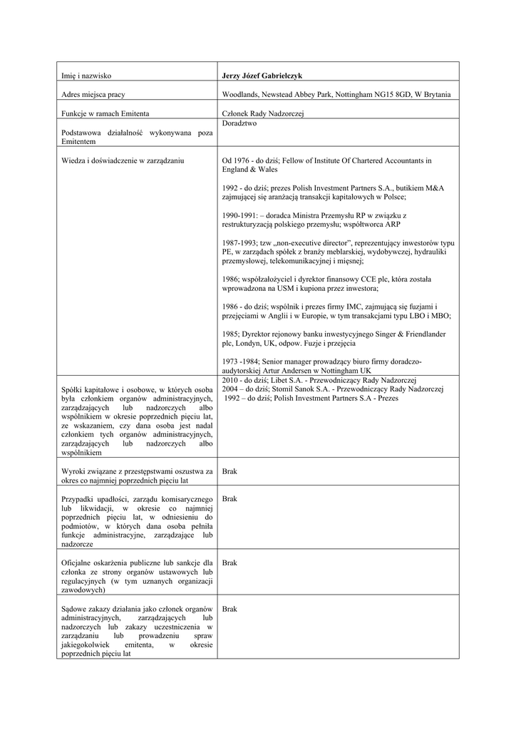 Imię i nazwisko Jerzy Józef Gabrielczyk Adres miejsca pracy Woodlands, Newstead Abbey Park, Nottingham NG15 8GD, W Brytania Funkcje w ramach Emitenta Członek Rady Nadzorczej Doradztwo Podstawowa działalność wykonywana poza Emitentem Wiedza i doświadczenie w zarządzaniu Od 1976 - do dziś; Fellow of Institute Of Chartered Accountants in England & Wales 1992 - do dziś; prezes Polish Investment Partners S.A., butikiem M&A zajmującej się aranżacją transakcji kapitałowych w Polsce; 1990-1991: – doradca Ministra Przemysłu RP w związku z restrukturyzacją polskiego przemysłu; współtworca ARP 1987-1993; tzw „non-executive director”, reprezentujący inwestorów typu PE, w zarządach spółek z branży meblarskiej, wydobywczej, hydrauliki przemysłowej, telekomunikacyjnej i mięsnej; 1986; współzałożyciel i dyrektor finansowy CCE plc, która została wprowadzona na USM i kupiona przez inwestora; 1986 - do dziś; wspólnik i prezes firmy IMC, zajmującą się fuzjami i przejęciami w Anglii i w Europie, w tym transakcjami typu LBO i MBO; 1985; Dyrektor rejonowy banku inwestycyjnego Singer & Friendlander plc, Londyn, UK, odpow. Fuzje i przejęcia Spółki kapitałowe i osobowe, w których osoba była członkiem organów administracyjnych, zarządzających lub nadzorczych albo wspólnikiem w okresie poprzednich pięciu lat, ze wskazaniem, czy dana osoba jest nadal członkiem tych organów administracyjnych, zarządzających lub nadzorczych albo wspólnikiem 1973 -1984; Senior manager prowadzący biuro firmy doradczoaudytorskiej Artur Andersen w Nottingham UK 2010 - do dziś; Libet S.A. - Przewodniczący Rady Nadzorczej 2004 – do dziś; Stomil Sanok S.A. - Przewodniczący Rady Nadzorczej 1992 – do dziś; Polish Investment Partners S.A - Prezes Wyroki związane z przestępstwami oszustwa za okres co najmniej poprzednich pięciu lat Brak Przypadki upadłości, zarządu komisarycznego lub likwidacji, w okresie co najmniej poprzednich pięciu lat, w odniesieniu do podmiotów, w których dana osoba pełniła funkcje administracyjne, zarządzające lub nadzorcze Brak Oficjalne oskarżenia publiczne lub sankcje dla członka ze strony organów ustawowych lub regulacyjnych (w tym uznanych organizacji zawodowych) Brak Sądowe zakazy działania jako członek organów administracyjnych, zarządzających lub nadzorczych lub zakazy uczestniczenia w zarządzaniu lub prowadzeniu spraw jakiegokolwiek emitenta, w okresie poprzednich pięciu lat Brak