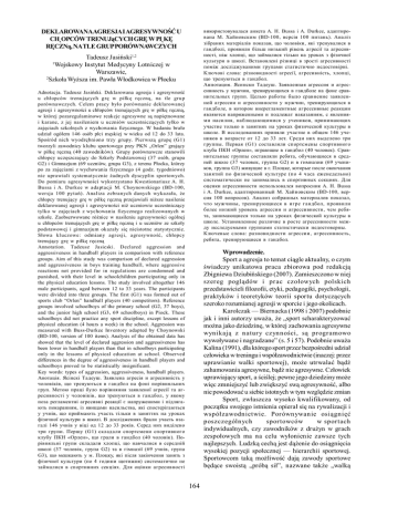 використовувалася анкета A. H. Bussa i A. Durkee, адаптирована М. Хайновским (BD-100, версія 100 питань). Аналіз зібраних матеріалів показав, що чоловіки, які тренувалися в гандболі, проявили більш низький рівень агресії та агресивності, ніж хлопці, що займалися тільки на уроках з фізичної культури в школі. Встановлені різниці в зрості агресивності поміж досліджуваними групами статистично недостовірні. Ключові слова: різновидності агресії, агресивність, хлопці, що тренуються в гандбол. Аннотация. Ясински Тадеуш. Заявленная агрессия и агрессивность у мужчин, тренирующихся в гандболе на фоне сравнительных групп. Целью работы было сравнение заявленной агрессии и агрессивности у мужчин, тренирующихся в гандболе, в котором внерегламентные агрессивные реакции являются напряженными и подлежат наказаниям, с явлениями насилия, наблюдающимися у учеников, принимающих участие только в занятиях на уроках физической культуры в школе. В исследованиях приняли участие в общем 146 учеников в возрасте от 12 до 33 лет. Среди них выделено три группы. Первая (G1) составляли спортсмены спортивного клуба ПКН «Орлен», играющие в гандбол (40 человек). Сравнительные группы составляли ребята, обучающиеся в средней школе (37 человек, группа G2) и в гимназии (69 учеников, группа G3) живущие в г. Плоцке, которые после окончания занятий по физической культуре (по 4 часа еженедельно) систематически не занимались в спортивных секциях. Для оценки агрессивности использовался вопросник A. H. Bussa i A. Durkee, адаптированный М. Хайновским (BD-100, версия 100 вопросов). Анализ собранных материалов показал, что мужчины, тренирующиеся в игре гандбол, проявили более низкий уровень агрессии и агрессивности, чем ребята, занимающиеся только на уроках физической культуры в школе. Установленное различие в росте агрессивности между исследуемыми группами статистически недостоверны. Ключевые слова: разновидности агрессии, агрессивность, ребята, тренирующиеся в гандбол. DEKLAROWANAAGRESJA I AGRESYWNOŚĆ U CH˛OPCÓW TRENUJąCYCH GRĘ W PI˛KĘ RĘCZNą, NATLE GRUP PORÓWNAWCZYCH Tadeusz Jasiński1,2 Wojskowy Instytut Medycyny Lotniczej w Warszawie, 2 Szkoła Wyższa im. Pawła Włodkowica w Płocku 1 Adnotacja. Tadeusz Jasiński. Deklarowana agresja i agresywność u chłopców trenują cych grę w piłk ę ręczną, na tle grup porównawczych. Celem pracy było porównanie deklarowanej agresji i agresywności u chłopców trenujących grę w piłkę ręczną, w której pozaregulaminowe reakcje agresywne są napiętnowane i karane, z jej nasileniem u uczniów uczestniczących tylko w zajęciach szkolnych z wychowania fizycznego. W badaniu brało udział ogółem 146 osób płci męskiej w wieku od 12 do 33 lata. Spośród nich wyodrębniono trzy grupy. Pierwszą grupę (G1) tworzyli zawodnicy klubu sportowego przy PKN „Orlen” grający w piłkę ręczną (40 zawodników). Grupy porównawcze stanowili chłopcy uczęszczający do Szkoły Podstawowej (37 osób, grupa G2) i Gimnazjum (69 uczniów, grupa G3), z terenu Płocka, którzy po za zajęciami z wychowania fizycznego (4 godz. tygodniowo) nie uprawiali systematycznie żadnych dyscyplin sportowych. Do pomiaru agresywności wykorzystano Kwestionariusz A. H. Bussa i A. Durkee w adaptacji M. Choynowskiego (BD-100, wersja 1 00 pytań). Analiza zebranych danych wyka zała, że chłopcy trenujący grę w piłkę ręczną przejawiali niższe nasilenie deklarowanej agresji i agresywności niż uczniowie uczestniczący tylko w zajęciach z wychowania fizycznego realizowanych w szkole. Zaobserwowane różnice w nasileniu agresywności ogólnej u chłopców trenujących grę w piłkę ręczną i u uczniów ze szkoły podstawowej i gimnazjum okazały się nieistotne statystycznie. Słowa kluczowe: odmiany agresji, agresywność, chłopcy trenujący grę w piłkę ręczną Annotation. Tadeusz Jasiсski. Declared aggression and aggressiveness in handball players in comparison with reference groups. Aim of this study was comparison of declared aggression and aggressiveness in boys training handball, where aggressive reactions not provided for in regulations are condemned and punished, with their level in schoolchildren participating only in the physical education lessons. The study involved altogether 146 male participants, aged between 12 to 33 years. The participants were divided into three groups. The first (G1) was formed out of sports club “Orlen” handball pla