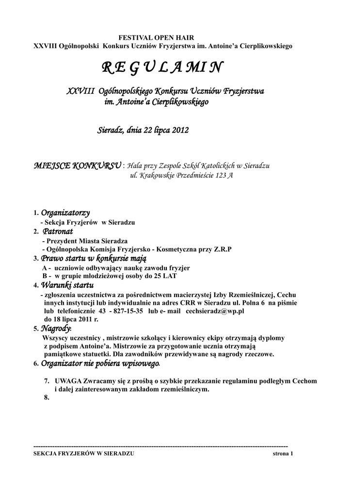 FESTIVAL OPEN HAIR XXVIII Ogólnopolski Konkurs Uczniów Fryzjerstwa im. Antoine’a Cierplikowskiego R E G U L A MI N XXVIII Ogólnopolskiego Konkursu Uczniów Fryzjerstwa im. Antoine’a Cierplikowskiego Sieradz, dnia 22 lipca 2012 MIEJSCE KONKURSU : Hala przy Zespole Szkól Katolickich w Sieradzu ul. Krakowskie Przedmieście 123 A 1. Organizatorzy - Sekcja Fryzjerów w Sieradzu 2. Patronat - Prezydent Miasta Sieradza - Ogólnopolska Komisja Fryzjersko - Kosmetyczna przy Z.R.P 3. Prawo startu w konkursie mają A - uczniowie odbywający naukę zawodu fryzjer B - w grupie młodzieżowej osoby do 25 LAT 4. Warunki startu - zgłoszenia uczestnictwa za pośrednictwem macierzystej Izby Rzemieślniczej, Cechu innych instytucji lub indywidualnie na adres CRR w Sieradzu ul. Polna 6 na piśmie lub telefonicznie 43 - 827-15-35 lub e- mail [email protected] do 18 lipca 2011 r. 5. Nagrody: Wszyscy uczestnicy , mistrzowie szkolący i kierownicy ekipy otrzymają dyplomy z podpisem Antoine’a. Mistrzowie za przygotowanie ucznia otrzymają pamiątkowe statuetki. Dla zawodników przewidywane są nagrody rzeczowe. 6. Organizator nie pobiera wpisowego. 7. UWAGA Zwracamy się z prośbą o szybkie przekazanie regulaminu podległym Cechom i dalej zainteresowanym zakładom rzemieślniczym. 8. -----------------------------------------------------------------------------------------------------------SEKCJA FRYZJERÓW W SIERADZU strona 1 FESTIVAL OPEN HAIR XXVIII Ogólnopolski Konkurs Uczniów Fryzjerstwa im. Antoine’a Cierplikowskiego Jednym z priorytetów XVIII Ogólnopolskiego Konkursu Uczniów Fryzjerstwa im. Antoinea Cuierplikowskiego jest wyłonienie Zwycięzcy SIERADZ OPEN HAIR FESTVAL 2012 w klasyfikacji damskiej i meskiej. Ten prestiżowy Konkurs odbędzie się pod patronatem Prezydenta Miasta Sieradza i Ogólnopolskiej Komisji Fryzjersko Kosmetycznej i stanowi dodatkowa kategorię obok Laureatów wyłonionych w XXVIII Ogolnopolskim Konkursie Uczniów Fryzjerstwa im. Antoinea Cierplikowskiego. W klasyfikacji damskiej o wyborze zwycięzcy decyduje suma punktów w następujących konkurencjach: 1. Fryzura Dzienna Konsumencka 2. Fryzura Wieczorowa 3. Fryzura Twoich Marzeń W klasyfikacji męskiej pod uwagę brana będzie suma punktów z następujących konkurencji: 1. Modelowanie Fryzury z Długich Włosów 2. Modelowanie Fryzury Klasycznej -----------------------------------------------------------------------------------------------SEKCJA FRYZJERÓW W SIERADZU strona 2 FESTIVAL OPEN HAIR XXVIII Ogolnopolski Konkurs Uczniów Fryzjerstwa om. Antoinea Cierplikowskiego KONKURS OBEJMUJE NASTĘPUJĄCE KONKURENCJE --------------------------------------------------------------------------------------------- FRYZJERSTWO DAMSKIE --------------------------------------------------I. W y c i s k a n i e f a l n a m o k r o ============================= przed rozpoczęciem konkurencji włosy muszą być zmoczone i zaczesane gładko do tyłu. 1. Można użyć klipsów do wykończenia. Włosy nie mogą być spięte. 2. Kolor włosów - kolory włosów są dozwolone. Zabronione są kolory neonowe i kolorowe spray. Nie wolno używać brokatu. 3. Wszystkie produkty są dozwolone. 4. Czas wykonania - 25 minut II. F r y z u r a d z i e n n a k o n s u m e n c k a =================================== fryzura dla dziewczyny wybierającej się na casting modelek - pokaz mody Mokre włosy - przed rozpoczęciem konkurencji włosy muszą być mokre i gładko zaczesane do tyłu głowy Długość włosów dowolna. Zadanie: wykonanie fryzury 1. PRODUKTY - Wszystkie produkty dozwolone 2. NARZĘDZIA - wszystkie narzędzia modelujące dozwolone 3. KOLOR WŁOSÓW - według uznania uczestnika - zabronione kolory neonowe i kolory spraye 4. UBIÓR - Strój akcesoria makijaż muszą harmonizować z fryzurą 5. CZAS TRWANIA - 30 minut ----------------------------------------------------------------------------------------------------------------SEKCJA FRYZJERÓW W SIERADZU strona 3 FESTIVAL OPEN HAIR XXVIII Ogolnopolski Konkurs Uczniów Fryzjerstwa im. Antoinea Cierplikowskiego III. F r y z u r a w i e c z o r o w a ======================== fryzura na specjalną okazję /wizytowa/ - plecionki i warkocze z długich włosów Włosy rozpuszczone i gładko zaczesane do tyłu głowy / mokre lub suche - do uznania zawodnika/ 1. FRYZURA bez dopinek , wykonana wyłącznie przy użyciu rąk , grzebieni i szczotek 2. KOLOR WŁOSÓW - Według uznania uczestnika. 3. MAKIJAŻ - stosowny do fryzury wizytowej 4. PRODUKTY - dozwolone wszystkie produkty 5. CZAS WYKONANIA - 30 minut IV . F r y z u r a t w o i c h m a r z e ń =========================== fryzura według własnego pomysłu Mokre włosy - przed rozpoczęciem konkurencji włosy muszą być mokre i gładko Zaczesane do tyłu głowy 1. DŁUGOŚĆ włosów dowolna 2. DOZWOLONE wszystkie narzędzia 3. KOLORY bez ograniczeń możliwości zastosowania wszelkich środków Koloryzujących - zabronione kolory neonowe i spray”e 4. Czas wykonania - 25 minut -----------------------------------------------------------------------------------------------------------------SEKCJA FRYZJERÓW W SIERADZ strona 4 FESTIVAL OPEN HAIR XXVIII Ogolnopolski Konkurs Uczniów Fryzjerstwa im. Antpoinea Cierplikowskiego V. F r y z u r a ś l u b n a z d ł u g i c h w ł o s ó w ======================================= Fryzura ślubna na długich włosach wykonana na główkach treningowych lub modelach. 1. WŁOSY manekina mają być suche, rozpuszczone i zaczesane do tyłu. 2. WSZYSTKIE produkty są dozwolone. 3. WSZYSTKIE narzędzia modelujące są dozwolone. 4. KOLOR WŁOSÓW- wybór koloru jest dowolny. Zabronione są kolory neonowe kolor spray’e i brokaty. 5. FRYZURA ma charakter elegancki. 6. UBIÓR - kreacja i makijaż muszą mieć charakter ślubny 7. Wszystkie materiały do dekoracji są dozwolone, ale nie mogą przykrywac więcej niż 25 % fryzury. Treski, dopinki i peruki są zabronione. 8. Czas wykonania - 30