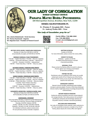 February 5, 2017 Our Lady of Consolation R. C. Church - olcny.org Page 1 OUR LADY OF CONSOLATION ROMAN CATHOLIC CHURCH PARAFIA MATKI BOŻEJ POCIESZENIA 184 Metropolitan Avenue, Brooklyn, New York, 11249 KSIĘŻA SALWATORIANIE.PL Fr. Wiesław P. Strządała SDS - Pastor Fr. Andrzej Waśko SDS - Vicar “Our Lady of Consolation, pray for us” Mrs. Jolanta Modzelewski - Parish Secretary Mr. Thomas Raczkowski - Organist Mr. Bogusław Szast - President of Pastoral Council Parish Office: 718-388-1942 Fax: 718-388-8993 E-mail: [email protected] olcny.org RECTORY OFFICE HOURS / KANCELARIA PARAFIALNA: Monday to Friday from 9:00 AM to 5:00 PM od poniedziałku do piątku od 9:00 AM do 5:00 PM BAPTISM IN ENGLISH Sunday at 9:30 AM . For more informa on, please contact the rectory office. WEEKDAY SCHEDULE / PLAN TYGODNIOWY: 7:45 AM — English Holy Mass / 7:45 AM — Msza św. angielska 4:00 PM — Eucharis c Adora on / 4:00 PM — Adoracja N S 6:30 PM — Devo on / 6:30 PM — Nabożeństwo 7:00 PM — Polish Holy Mass / 7:00 PM — Msza św. polska CHRZEST PO POLSKU Niedziela — godzina 12:30 PM. Po więcej informacji prosimy o kontakt z kancelarią parafialną. SATURDAY MASSES / SOBOTNIE MSZE ŚWIĘTE: 8:00 AM — Polish Holy Mass / 8:00 AM — Msza św. polska 5:00 PM — English Holy Mass / 5:00 PM — Msza św. angielska 7:00 PM — Polish Holy Mass / 7:00 PM — Msza św. polska SUNDAY MASSES / NIEDZIELNE MSZE ŚWIĘTE: 7:30 AM — Polish Holy Mass / 7:30 AM — Msza św. polska 9:30 AM — English Holy Mass / 9:30 AM — Msza św. angielska 11:00 AM — Polish Holy Mass / 11:00 AM — Msza św. polska 12:30 PM—Polish Children Holy Mass 12:30 PM—Msza polska dla dzieci 6:30 PM — Devo on / 6:30 PM — Nabożeństwo 7:00 PM — Polish Holy Mass / 7:00 PM — Msza św. polska EUCHARISTIC ADORATION / ADORACJA NAJŚW. SAKR. Monday to Friday from 4:00 PM to 6:30 PM Od Poniedziałku do Piątku od 4:00 do 6:30 PM CONFESSIONS / SPOWIEDŹ Every day before devo on / Codziennie przed Nabożeństwem First Friday from 6:00 PM / Pierwszy Piątek od 6:00 PM Saturday: 6:30 PM / Sobota: 6:30 PM Sunday: 7:00 AM, 9:15 AM, 10:30 AM, 6:00 PM Niedziela: 7:00 AM, 9:15 AM, 10:30 AM, 6:00 PM For individual confession, please contact priest. W razie potrzeby prosimy o kontakt z księdzem. WEDDING / ŚLUB Please contact the Rectory office six month in advance Prosimy zgłosić się 6 miesięcy przed ślubem do kancelarii parafialnej. VISITING THE SICK Parishioners who are confined to their homes are usually visited each month of First Friday by one of the Priests. Please call the rectory so we can get the informa on we need for this home visit. ODWIEDZINY CHORYCH Naszych chorych parafian odwiedzają księża każdego miesiąca w pierwszy piątek. Prosimy o informacje dotyczące chorych, byśmy mogli lepiej służyć im posługą duszpasterską i sakramentalną. WITAMY NOWYCH PARAFIAN Serdecznie witamy wszystkich wiernych uczęszczających do naszego kościoła. Tych, którzy jeszcze nie są naszymi parafianami zachęcamy do formalnego zapisania się do parafii. Prosimy o kontakt z kancelarią parafialną. WELCOME NEW PARISHIONERS Our Lady of Consola on Parish extends a warm welcome to all. If you would like to become a member of our Parish Family, please stop by the rectory office and register. February 5, 2017 Our Lady of Consolation R. C. Church - olcny.org Intencje Mszalne i Nabożeństwa Holy Masses Intensions and Devotions Niedziela, 5 lutego — Sunday, February 5th 7:30 am 9:30 am 11:00 am 12:30 pm 6:30 pm 7:00 pm + Czesław Kwiatkowski + Stella Jaskowska—from children and family ++ Anna i Kazimierz Zarzycki—od wnuka z rodziną ++ Piotr i Katarzyna Dwornik—od dzieci z rodzinami Nieszpory + Zenonę Skiba—od rodziny Poniedziałek, 6 lutego — Monday, February 6th 7:45 am 4:00 pm 6:30 pm 7:00 pm A blessing to find a job according to the will of God for Dorothy Rozpoczęcie Adoracji Nabożeństwo do Miłosierdzia Bożego W intencji o nawrócenie grzeszników—od ofiarodawcy Wtorek, 7 lutego — Tueasday, February 7th 7:45 am 4:00 pm 6:30 pm 7:00 pm + Irena—od córki Doroty Rozpoczęcie Adoracji Nabożeństwo do Matki Bożej Nieustającej Pomocy + Łukasz Jankowski—od przyjaciół Środa, 8 lutego — Wednesday, February 8th 7:45 am 4:00 pm 5:30 pm 6:30 pm 7:00 pm ++ Gabriella and John Urbanowicz Rozpoczęcie Adoracji Godzina Św. Towarzystwa Najśw. Serca Pana Jezusa Nabożeństwo do Świętego Józefa O łaski Boże z okazji urodzin Kamila Czwartek, 9 lutego — Thursday, February 9th 7:45 am 4:00 pm 6:30 pm 7:00 pm + Gabriella Urbanowicz—from Robert Sawicki Rozpoczęcie Adoracji Nabożeństwo Powołaniowe Za dusze w czyśćcu cierpiące—od ofiarodawcy Piątek, 10 lutego — Friday, February 10th 7:45 am 4:00 pm 6:30 pm 7:00 pm + Gabriella Urbanowicz—from Blanche Vitkevich Rozpoczęcie Adoracji Nabożeństwo do Serca Pana Jezusa + z Rodzin Szumiło, Regimowicz, Hulanicki, Marzec, Głowacki, Przybyła i Ochenduszko—od Reginy Szumiło z rodziną Sobota, 11 lutego — Saturday, February 11th 8:00 am Proszę Matkę Bożą z Lourdes o łaskę zdrowia dla chorych członków mojej rodziny, przyjaciół i chorych przebywających w szpitalach i w hospicjach—prosi Władysława 5:00 pm Thanksgiving mass from Agnieszka 7:00 pm ++ Eleonora i Tomasz Kornego, + Jadwiga Zarzecka i + Eugenia Skrodzka—od Krystyny z rodziną Niedziela, 12 lutego — Sunday, February 12th 7:30 am + Ryszard, + Janina, + Jan Welc i + Czesław Węgrowski—od rodziny 9:30 am For health and God’s blessing for Teresa Dziedzic on Her Birthday—from Weronika and Tadeusz 11:00 am + Barbara Sadlak w 1 rocznicę śmierci —od córek Sylvii i Moniki 12:30 pm + Helena Wojtaś, + Adam i Edward Wojtaś—od syna Piotra z rodziną 6:30 pm Nieszpory 7:00 pm + Teresa Nastaj—od koleżanki Krystyny Page 2 Kolekty / Collections W ubiegłą niedzielę pierwsza kolekta wyniosła $ 1,730.00 Last Sunday’s first collection was $ 1,730.00 