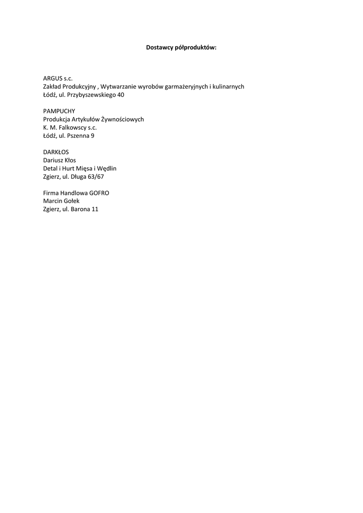 Dostawcy półproduktów: ARGUS s.c. Zakład Produkcyjny , Wytwarzanie wyrobów garmażeryjnych i kulinarnych Łódź, ul. Przybyszewskiego 40 PAMPUCHY Produkcja Artykułów Żywnościowych K. M. Falkowscy s.c. Łódź, ul. Pszenna 9 DARKŁOS Dariusz Kłos Detal i Hurt Mięsa i Wędlin Zgierz, ul. Długa 63/67 Firma Handlowa GOFRO Marcin Gołek Zgierz, ul. Barona 11