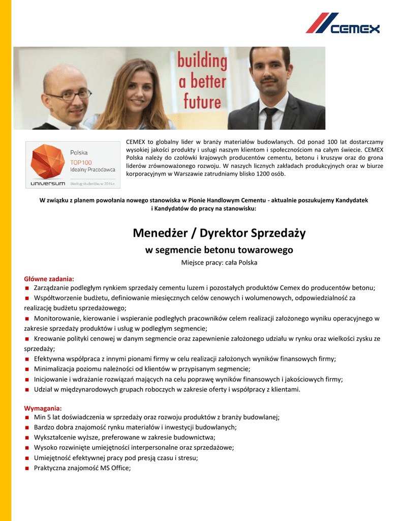 CEMEX to globalny lider w branży materiałów budowlanych. Od ponad 100 lat dostarczamy wysokiej jakości produkty i usługi naszym klientom i społecznościom na całym świecie. CEMEX Polska należy do czołówki krajowych producentów cementu, betonu i kruszyw oraz do grona liderów zrównoważonego rozwoju. W naszych licznych zakładach produkcyjnych oraz w biurze korporacyjnym w Warszawie zatrudniamy blisko 1200 osób. W związku z planem powołania nowego stanowiska w Pionie Handlowym Cementu - aktualnie poszukujemy Kandydatek i Kandydatów do pracy na stanowisku: Menedżer / Dyrektor Sprzedaży w segmencie betonu towarowego Miejsce pracy: cała Polska Główne zadania: Zarządzanie podległym rynkiem sprzedaży cementu luzem i pozostałych produktów Cemex do producentów betonu; Współtworzenie budżetu, definiowanie miesięcznych celów cenowych i wolumenowych, odpowiedzialność za realizację budżetu sprzedażowego; Monitorowanie, kierowanie i wspieranie podległych pracowników celem realizacji założonego wyniku operacyjnego w zakresie sprzedaży produktów i usług w podległym segmencie; Kreowanie polityki cenowej w danym segmencie oraz zapewnienie założonego udziału w rynku oraz wielkości zysku ze sprzedaży; Efektywna współpraca z innymi pionami firmy w celu realizacji założonych wyników finansowych firmy; Minimalizacja poziomu należności od klientów w przypisanym segmencie; Inicjowanie i wdrażanie rozwiązań mających na celu poprawę wyników finansowych i jakościowych firmy; Udział w międzynarodowych grupach roboczych w zakresie oferty i współpracy z klientami. Wymagania: Min 5 lat doświadczenia w sprzedaży oraz rozwoju produktów z branży budowlanej; Bardzo dobra znajomość rynku materiałów i inwestycji budowlanych; Wykształcenie wyższe, preferowane w zakresie budownictwa; Wysoko rozwinięte umiejętności interpersonalne oraz sprzedażowe; Umiejętność efektywnej pracy pod presją czasu i stresu; Praktyczna znajomość MS Office; Minimum podstawowa znajomość technologii produkcji betonu; Doświadczenie w zarządzaniu zespołem i/lub zdolności przywódcze / liderskie; Czynne prawo jazdy kat. B; Dyspozycyjność do częstych wyjazdów służbowych na terenie kraju; Komunikatywna znajomość języka angielskiego będzie dodatkowym atutem. Co możesz zyskać pracując w CEMEX? Pracę w dużej i stabilnej firmie o globalnym zasięgu; Możliwość rozwoju, nauki i zdobywania doświadczenia w różnych obszarach biznesu;; Rozległą sieć międzynarodowych kontaktów; Konkurencyjne wynagrodzenie, szeroki pakiet świadczeń dodatkowych oraz rozbudowane usługi dla pracowników. W naszych rekrutacjach stosujemy zasady równości i poszanowania różnorodności. Zatrudniamy kandydatów najlepiej spełniających wymagania na danym stanowisku, bez względu na stopień sprawności, wiek, płeć, pochodzenie lub inne cechy podmiotowe. Jeżeli czujesz, że ta praca jest dla Ciebie, kliknij Informujemy, że wszystkie nadesłane aplikacje zostaną poddane wnikliwej analizie, jednak odpowiemy tylko na wybrane zgłoszenia. Poznaj CEMEX: Prosimy o zamieszczenie w aplikacji następującej klauzuli: „Wyrażam zgodę na przetwarzanie moich danych osobowych zawartych w dokumentach rekrutacyjnych dla potrzeb związanych z realizacją obecnie prowadzonego procesu rekrutacji oraz procesów rekrutacji prowadzonych w przyszłości przez administratora danych CEMEX Polska Sp. z o.o., ul. Łopuszańska 38D, 02-232 Warszawa („Spółka”), zgodnie z ustawą z dnia 29 sierpnia 1997 r. o ochronie danych osobowych (tekst jednolity: Dz. U. z 2002 r. Nr 101 poz. 926)”. Zostałem(am) poinformowany(a) o przysługującym mi prawie dostępu do treści moich danych oraz prawie ich poprawiania. Podanie danych jest dobrowolne, lecz niezbędne dla celów rekrutacji prowadzonej przez Spółkę.”