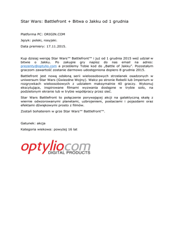 Star Wars: Battlefront + Bitwa o Jakku od 1 grudnia Platforma PC: ORIGIN.COM Język: polski, rosyjski. Data premiery: 17.11.2015. Kup dzisiaj wersję Star Wars™ Battlefront™ i już od 1 grudnia 2015 weź udział w bitwie o Jakku. Po zakupie gry napisz do nas email na adres: [email protected] a prześlemy Tobie kod do „Battle of Jakku”. Pozostałym graczom zawartość zostanie darmowo udostępniona dopiero 8 grudnia 2015. Battlefront jest nową odsłoną serii wieloosobowych strzelanek osadzonych w uniwersum Star Wars (Gwiezdne Wojny). Walcz po stronie Rebelii lub Imperium w rozgrywkach wieloosobowych z udziałem maksymalnie 40 graczy. Wykonuj ekscytujące, inspirowane filmami wyzwania dostępne w trybie solo, na podzielonym ekranie lub w trybie współpracy przez sieć. Star Wars Battlefront to połączenie porywającej akcji na galaktyczną skalę z wiernie odwzorowanymi planetami, uzbrojeniem, postaciami i pojazdami oraz efektami dźwiękowymi prosto z filmów. Zostań bohaterem w grze Star Wars™ Battlefront™. Gatunek: akcja Kategoria wiekowa: powyżej 16 lat