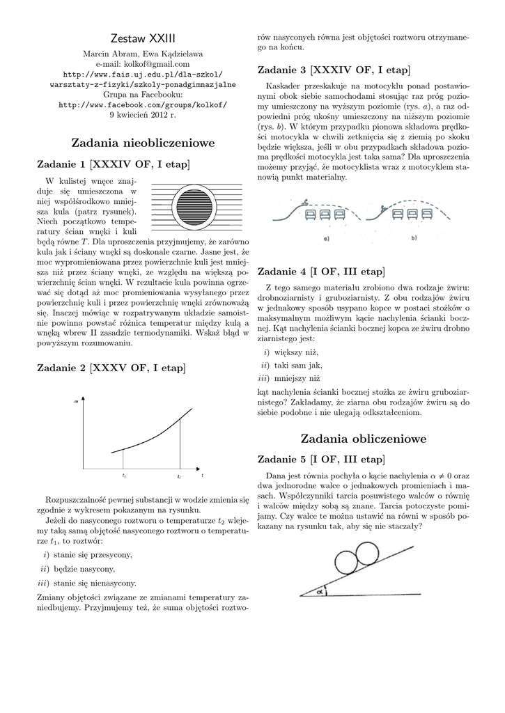 Zestaw XXIII Marcin Abram, Ewa Kądzielawa e-mail: [email protected] http://www.fais.uj.edu.pl/dla-szkol/ warsztaty-z-fizyki/szkoly-ponadgimnazjalne Grupa na Facebooku: http://www.facebook.com/groups/kolkof/ 9 kwiecień 2012 r. Zadania nieobliczeniowe Zadanie 1 [XXXIV OF, I etap] W kulistej wnęce znajduje się umieszczona w niej współśrodkowo mniejsza kula (patrz rysunek). Niech początkowo temperatury ścian wnęki i kuli będą równe T . Dla uproszczenia przyjmujemy, że zarówno kula jak i ściany wnęki są doskonale czarne. Jasne jest, że moc wypromieniowana przez powierzchnie kuli jest mniejsza niż przez ściany wnęki, ze względu na większą powierzchnię ścian wnęki. W rezultacie kula powinna ogrzewać się dotąd aż moc promieniowania wysyłanego przez powierzchnię kuli i przez powierzchnię wnęki zrównoważą się. Inaczej mówiąc w rozpatrywanym układzie samoistnie powinna powstać różnica temperatur między kulą a wnęką wbrew II zasadzie termodynamiki. Wskaż błąd w powyższym rozumowaniu. Zadanie 2 [XXXV OF, I etap] rów nasyconych równa jest objętości roztworu otrzymanego na końcu. Zadanie 3 [XXXIV OF, I etap] Kaskader przeskakuje na motocyklu ponad postawionymi obok siebie samochodami stosując raz próg poziomy umieszczony na wyższym poziomie (rys. a), a raz odpowiedni próg ukośny umieszczony na niższym poziomie (rys. b). W którym przypadku pionowa składowa prędkości motocykla w chwili zetknięcia się z ziemią po skoku będzie większa, jeśli w obu przypadkach składowa pozioma prędkości motocykla jest taka sama? Dla uproszczenia możemy przyjąć, że motocyklista wraz z motocyklem stanowią punkt materialny. Zadanie 4 [I OF, III etap] Z tego samego materiału zrobiono dwa rodzaje żwiru: drobnoziarnisty i gruboziarnisty. Z obu rodzajów żwiru w jednakowy sposób usypano kopce w postaci stożków o maksymalnym możliwym kącie nachylenia ścianki bocznej. Kąt nachylenia ścianki bocznej kopca ze żwiru drobno ziarnistego jest: iq większy niż, iiq taki sam jak, iiiq mniejszy niż kąt nachylenia ścianki bocznej stożka ze żwiru gruboziarnistego? Zakładamy, że ziarna obu rodzajów żwiru są do siebie podobne i nie ulegają odkształceniom. Zadania obliczeniowe Zadanie 5 [I OF, III etap] Rozpuszczalność pewnej substancji w wodzie zmienia się zgodnie z wykresem pokazanym na rysunku. Jeżeli do nasyconego roztworu o temperaturze t2 wlejemy taką samą objętość nasyconego roztworu o temperaturze t1 , to roztwór: iq stanie się przesycony, iiq będzie nasycony, iiiq stanie się nienasycony. Zmiany objętości związane ze zmianami temperatury zaniedbujemy. Przyjmujemy też, że suma objętości roztwo- Dana jest równia pochyła o kącie nachylenia α 0 oraz dwa jednorodne walce o jednakowych promieniach i masach. Współczynniki tarcia posuwistego walców o równię i walców między sobą są znane. Tarcia potoczyste pomijamy. Czy walce te można ustawić na równi w sposób pokazany na rysunku tak, aby się nie staczały? Zadanie 6 [XXXIX OF - III etap] [jm-OF] 50 lat olimpiad fizycznych redakcja P. Janiszewski i J. Mostowski, PWN, Warszawa, 2002. Cząstka punktowa o masie m i ładunku elektrycznym q porusza się w polu elektrostatycznym o natężeniu E [g-OF] Zbiór zadań z olimpiad fizycznych redakcja W. Gorzkowskiego, Wyd. Szkolne i Pedagogiczne, WarE px,y,z q po torze T . W punkcie P0 toru T cząstka ma szawa, 1987. prędkość v0 . Jaką prędkość powinna mieć w P0 cząstka punktowa o masie M i ładunku Q, aby jej ruch pod wpły[i-OF] Archiwalne zadania z olimpiad fizycznych dowem tego samego pola E odbywał się po tym samym torze stępne w internecie patrz takie strony jak T? http://www.olimpiada.fizyka.szc.pl/. Uwaga! Ograniczamy rozważania do cząstek o prędkościach małych w porównaniu z prędkością światła. [MOF] Zadania z Fizyki z całego świata z rozwiązaniami. 20 lat Międzynarodowych Olimpiad Fizycznych redakcja W. Gorzkowski, WNT, Warszawa, 1994. Zadanie 7 [XLI OF - II etap] Wewnątrz zamkniętego balonu znajduje się gaz pod ci- [PZO] Piotr Makowiecki, Pomyśl zanim odpowiesz, Wiedza Powszechna, Warszawa, 1985. śnieniem p p4{3qp0 , gdzie p0 jest ciśnieniem gazu na zewnątrz balonu. Elastyczna, przewodząca powłoka tego balonu pod wpływem sił działających na jej powierzchnię przyjmuje kształt kuli. Jakim ładunkiem należy naelektryzować powłokę, aby promień balonu zwiększył się dwukrotnie? W interesującym nas zakresie rozmiarów balonu spełniony jest związek rp∆pq2 A const., gdzie r jest promieniem balonu, a ∆p wartością wypadkowej siły działającej na jednostkę pola powierzchni jego powłoki. Dane: p0 , A, przenikalność dielektryczna gazu jest równa przenikalności dielektrycznej próżni 0 . Uwaga: Przyjmij, że w czasie powolnego elektryzowania powłoki gaz zachowuje się jak doskonały oraz że temperatury gazu wewnątrz i na zewnątrz balonu są równe i stałe. Zadanie 8 [XXXII OF, II etap] Jednorodny pręt o długości L i masie m, zawieszony na przegubie, zakreśla powierzchnię stożka o kącie rozwarcia 2α (α 0), pokazaną na rysunku. Wyznacz okres tego ruchu. Wszelkie opory ruchu zaniedbujemy. Literatura [NZzF] J. Domański, J. Turło, Nieobliczeniowe zadania z fizyki, Pruszyński i S-ka, Warszawa, 1997.