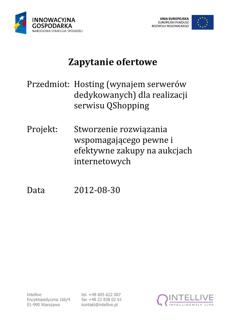 Zapytanie ofertowe Przedmiot: Hosting (wynajem serwerów dedykowanych) dla realizacji serwisu QShopping Projekt: Stworzenie rozwiązania wspomagającego pewne i efektywne zakupy na aukcjach internetowych Data 2012-08-30 Intellive Encyklopedyczna 16b/4 01-990 Warszawa tel. +48 605 622 007 fax +48 22 838 02 61 [email protected] 1. Wstęp Niniejszy dokument to zapytanie ofertowe na hosting (wynajem serwerów dedykowanych) w ramach realizacji projektu pt: "Stworzenie rozwiązania wspomagającego pewne i efektywne zakupy na aukcjach internetowych" dofinansowanego z Europejskiego Funduszu Rozwoju Regionalnego, na podstawie umowy o dofinansowanie projektu z działania 8.1 Programu Operacyjnego Innowacyjna Gospodarka, w ramach umowy UDA-POIG.08.01.00-14-725/1100 zawartej dnia 24.05.2012. Informacje firmie Firma jest prowadzona jako jednoosobowa działalność gospodarcza pod nazwą „Anna HańćOracz Intellive” zwaną dalej Intellive z siedzibą w Warszawie pod adresem: ul. Encyklopedyczna 16 B/4, wpisaną do ewidencji działalności gospodarczej prowadzonej przez Prezydenta m.st. Warszawy pod numerem 526233, NIP: 118-166-69-37, REGON: 142837587. Firma została założona w 2011r w celu budowania systemów informatycznych wspierających podejmowanie decyzji w szczególności w obszarze E-Commerce zarówno dla strony kupujących jak i sprzedających. Niniejsze zapytanie ofertowe ma pomóc realizować jeden z takich projektów o roboczej nazwie QShopping. Informacje o dokumencie Dokument zawiera następujące elementy: Założenia – okoliczności, które oferent powinien wziąć pod uwagę podczas przygotowywania oferty Opis zapytania ofertowego – spis elementów, których dotyczy zapytanie ofertowe wraz z kryteriami wyboru platformy hostingowej oraz z preferowaną konfiguracją serwerów. Ponadto zaprezentowane są kryteria wyboru najlepszej oferty. Zawartość oferty – zawiera przykładowy szablon do zaprezentowania oferty, termin złożenia wraz z opisem form jej przesłania Kontakt – zawiera procedurę, w jaki sposób kontaktować się z Intellive, aby zadawać dodatkowe pytania bądź doprecyzować zapytanie Informacje dodatkowe – zawiera takie szczegóły jak: okres ważności oferty, zastrzeżenia 2. Założenia Niniejszy rozdział opisuje podstawowe założenia, które oferent powinien wziąć pod uwagę podczas przygotowywania oferty: Intellive Encyklopedyczna 16b/4 01-990 Warszawa tel. +48 605 622 007 fax +48 22 838 02 61 [email protected] Realizacja zamówienia tj. uruchomienie, konfiguracja i udostępnienie platformy hostingowej nastąpi w okresie nie dłuższym niż 14 dni roboczych od wpłynięcia zamówienia. Pełne informacje o metodach dostępu do serwera zostaną przesłane w formie elektronicznej lub pisemnej na adres firmy Intellive. Płatność nastąpi z dwóch osobnych kont bankowych: konta dedykowanego do dysponowania zaliczką do dofinansowania projektu z działania 8.1 PO IG (100% wartości zamówienia netto) oraz firmowego konta firmy Intellive (podatek VAT) 3. Opis zapytania ofertowego W ramach zamówienia prosimy o przygotowanie oferty hosting serwera dedykowanego. Podstawowe parametry wyboru dla dedykowanego serwera Cecha Procesor Pamięć RAM Dyski System Operacyjny Konfiguracja minimalna Min. Intel Xeon X3440 Quadcore lub równoważny 16 GB RAM 2 x 1,5 TB - Sieć Minimum karta 10/100 Mb Możliwość kontaktu z wsparciem technicznym (telefonicznie/mailowo) Dostęp zdalny - Możliwość backupu - Transfer danych - Długość trwania umowy Redundantne zasilanie Koszt instalacji Ilość niezależnych łącz internetowych - Intellive Encyklopedyczna 16b/4 01-990 Warszawa tel. +48 605 622 007 fax +48 22 838 02 61 [email protected] Konfiguracja optymalna 2 procesory z serii Intel lub AMD, min. 6 rdzeni per procesor Minimum 32 GB Minimum 2 x 2TB SATA lub równoważne Microsoft Windows 2008 R2 Web Edition 100 Mb/s 24h x 7 dni Remote Desktop lub inna technologia zapewniająca min. 2 równoległe połączenia umożliwiające pracę zdalną Minimum 30% dodatkowej przestrzeni dyskowej na backup danych. Minimum 10TB/miesiąc lub nielimitowany Minimum 12 miesięcy TAK < 200 zł Minimum 2 Możliwość instalacji własnego oprogramowania (np. serwer baz danych) - TAK Kryteria wyboru oferty (wagi) Kryteria wyboru Waga kryterium w procesie decyzyjnym 30 % wagi oceny Cena za 1 m-ce hostingu Spełnienie konfiguracji minimalnej dla 10% wagi oceny parametrów dedykowanego serwera Spełnienie konfiguracji optymalnej dla 60% wagi oceny dedykowanego serwera 4. Zawartość oferty Prosimy o potwierdzenie otrzymania zapytania ofertowego oraz informację czy są Państwo zainteresowani przystąpieniem do konkursu ofertowego. Informacje te prosimy o przekazanie w terminie 2 dni roboczych od otrzymania powyższego zapytania, drogą elektroniczną. Koszt realizacji oferty Oferta powinna zawierać następujące parametry: Nazwę handlową oferowanej usługi Czas trwania umowy dla usługi Parametry serwera dedykowanego w formacie zgodnym z tabelą przedstawioną w rozdziale „Podstawowe parametry wyboru dla dedykowanego serwera” Koszt miesięczny wynajmu serwera Jednorazowy koszt instalacji serwera Termin składania ofert Oferta powinna zostać przesłana zgodnie z określonymi formami składania oferty (szczegóły w rozdziale „Formy składania oferty”) do dnia 07.09.2012r. do godziny 16.00. Formy składania oferty Oferty należy składać jedną z poniższych metod: Drogą elektroniczną na adres [email protected] Drogą pocztową, w zaklejonej kopercie na adres Anna Hańć-Oracz Intellive, ul. Encyklopedyczna 16B/4, 01-990 Warszawa. W przypadku przesyłania wydrukowanej wersji, prosimy o dołączenie oferty na płycie CD Intellive Encyklopedyczna 16b/4 01-990 Warszawa tel. +48 605 622 007 fax +48 22 838 02 61 [email protected] 5. Kontakt W przypadku dodatkowych pytań związanych z procesem ofertowym prosimy o kontakt drogą elektroniczną (szczegóły w rozdziale „Formy skł