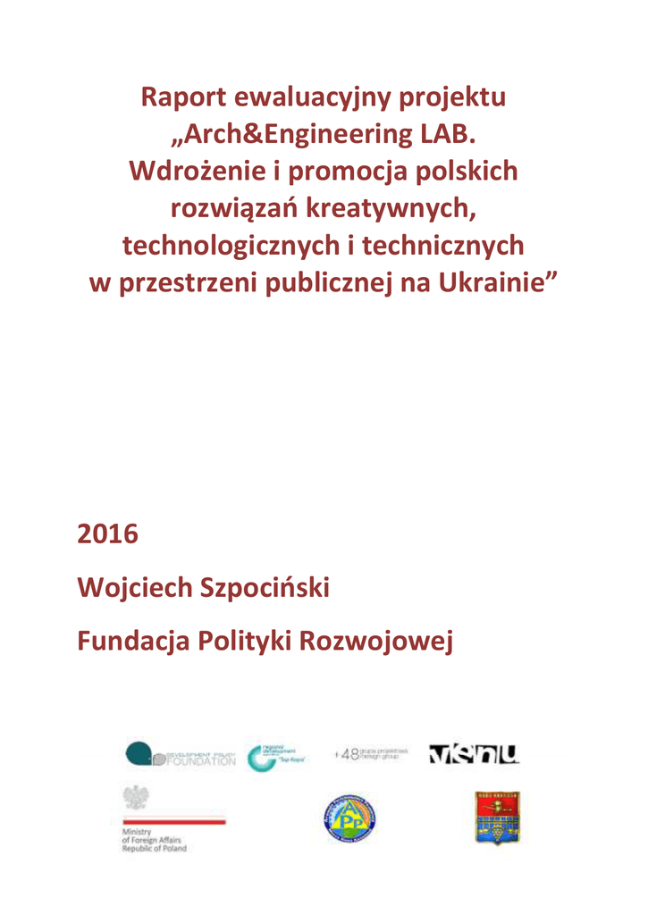 Raport ewaluacyjny projektu „Arch&Engineering LAB. Wdrożenie i promocja polskich rozwiązań kreatywnych, technologicznych i technicznych w przestrzeni publicznej na Ukrainie” 2016 Wojciech Szpociński Fundacja Polityki Rozwojowej 1. Dane projektu Tytuł: Arch&Engineering LAB. Wdrożenie i promocja technologicznych i technicznych w przestrzeni publicznej na Ukrainie polskich rozwiązań kreatywnych, Wdrażający: Fundacja Polityki Rozwojowej W oparciu o umowę BDG-249-2016 z 15 kwietnia 2016 z Ministerstwem Spraw Zagranicznych RP 2. Metodologia Analiza ma charakter wewnętrzny, stanowi dokument projektu udostępniony czytelnikom w celach edukacyjnych, zgodnych z celami statutowymi Fundacji. Analizę przeprowadzono w oparciu o – informacje własne zebrane podczas realizacji projektu, szczególnie wywiady z beneficjentami bezpośrednimi projektu, w tym uczestnikami charette, przedstawicielami samorządu, przedstawicielami wspólnot mieszkaniowych, NGO z regionu Chersonia. - analizę materiałów projektu i ocenę wskaźników celu i rezultatu - rozmowy z kluczowymi osobami dla projektu w tym koordynatorką polską Sylwią Szparkowską, koordynatorem ukraińskim Vyachesławem Kosteniukiem, przedstawicielem partnera ukraińskiego Vyachesławem Toporowem, tutorami projektu Karolem Szparkowskim i Kamilem Miklaszewskim. Wywiady miały charakter nieustrukturyzowany. 3. Finanse projektu i zarządzanie projektem Dotacja MSZ w wysokości 147 560 PLN Zleceniobiorca wykorzystał w całości, co należy ocenić pozytywnie – ze względu na właściwe zaplanowanie kosztów i właściwe zarządzanie wydatkami. Wartość projektu przekroczyła zakładany poziom ze względu na wyższy, niż zakładano początkowo, wkład własny Zleceniobiorcy do projektu. Ostateczna wartość projektu wyniosła 165 176,21 zł (pierwotnie zakładany poziom 164 760). Wyższy wkład własny jest zgodny z umową dotacji. Na wkład własny składa się głównie wkład osobowy / wolontariat obejmujący tutoring po-warsztatowy, rekrutację studentów na warsztaty, bezpłatne współprowadzenie zajęć merytorycznych. Wysoki wkład pracy wolontaryjnej należy ocenić wysoko. Zleceniobiorca znacznie obniżył koszty administracyjne projektu (o 45 proc.) na rzecz kosztów programowych. Wydatki są zgodne z umową dotacji – nie przekraczają założonego w dotacji poziomu (dopuszczalne przekroczenie o 10 proc. zakładanego kosztu). Tam, gdzie wydatki są przekroczone Zleceniobiorca potraktował wydatki przekraczające dopuszczone umową 10 proc. jako wkład własny. Zleceniobiorca nie uwzględnił w sprawozdaniu finansowym możliwego do odliczenia VAT, co jest zgodne z umową dotacji. Wszystkie wydatki poniesiono w okresie kwalifikowalności projektu. Kluczowe dla poprawnego rozliczenia dotacji była zgoda MSZ RP na zmianę umowy dotacji podczas trwania projektu. Przeniesienia dotyczyły przede wszystkim przeniesienia kosztów na podróże międzynarodowe / bilety lotnicze na podróże lokalne. Wynikało to z zaangażowania Zleceniobiorcy i Zleceniodawcy w efektywne zarządzanie środkami publicznymi. W okresie realizacji projektu loty międzynarodowe na trasie Warszawa-Chersoń były bardzo drogie, stąd konieczność zmiany trasy na loty Warszawa-Odessa i zwiększenia wydatków na przejazdy lokalne. Dobrą współpracę z donorem i elastyczne reagowanie na zmieniające się warunki realizacji projektu należy ocenić jako praktykę wzorową. 4. Realizacja celu głównego projektu i zgodność z celem programu Projekt w całości mieścił się w celach określonych przez donora. Cel główny: budowanie pozytywnego wizerunku Polski wśród samorządowców na południu Ukrainy, a także wśród profesjonalistów biznesu kreatywnego i studentów architektury, poprzez promowanie atrakcyjnych, nowoczesnych rozwiązań architektonicznych i technologicznych w przestrzeni publicznej, jak też inicjowanie i stymulowanie relacji gospodarczych, poprzez promowanie polskiej myśli technologicznej i kreatywnej na Ukrainie Cel główny został w pełni osiągnięty. Do celu głównego odnosiły się wszystkie opisane poniżej działania – zarówno konsultacyjne, promocyjne, jak mające charakter interwencji w przestrzeń wspólną. W wyniku realizacji projektu udało się także dotrzeć do wszystkich założonych grup docelowych: biznesu (w tym biznesów kreatywnych) poprzez m.in. prezentację projektu na forum ekonomicznym Tawrijske Horizonty 30.09.- 01.10 w Nowej Kachowce, do samorządowców m.in. poprzez udział w regionalnym Forum Ekonomicznym, spotkania i informacje na forach samorządowych o zasięgu regionalnym, studentów architektury poprzez aktywne włączenie studentów w realizację interwencji w przestrzeń wspólną i promocję wśród studentów architektury. Promowane były zarówno rozwiązania techniczne i kreatywne służące przestrzeni miejskiej (narzędzie konsultacji publicznych www.garnank.org), rozwiązania technologiczne (mała architektura miejska, oświetlenie miejskie polskich firm) oraz polska nowoczesna architektura wykorzystująca programowanie (poprzez warsztaty architektoniczne i udział architektów w konsultacjach charette). 5. Cele szczegółowe W projekcie założono następujące cele szczegółowe, poniżej precyzyjnie omówione 1. Podnoszenie kompetencji dotyczących nowoczesnej architektury i technologii stosowanych w przestrzeni miejskiej wśród młodych architektów, inżynierów, jak też władz samorządowych i instytucji społeczeństwa obywatelskiego, w oparciu o polskie doświadczenia, poprzez warsztaty architektoniczne i wspólną realizację instalacji w przestrzeni publicznej Cel został osiągnięty: kompetencje bezpośrednich uczestników projektu (studentów architektury, przedstawicieli administracji, NGO, reprezentanci tworzących się wspólnot mieszkaniowych) były podnoszone poprzez działania konsultacyjne (charette, zajęcia dla dzieci „papierowe miasto”) jak poprz