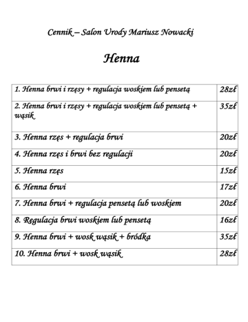 Cennik – Salon Urody Mariusz Nowacki Henna 1. Henna brwi i rzęsy + regulacja woskiem lub pensetą 28zł 2. Henna brwi i rzęsy + regulacja woskiem lub pensetą + wąsik 35zł 3. Henna rzęs + regulacja brwi 20zł 4. Henna rzęs i brwi bez regulacji 20zł 5. Henna rzęs 15zł 6. Henna brwi 17zł 7. Henna brwi + regulacja pensetą lub woskiem 20zł 8. Regulacja brwi woskiem lub pensetą 16zł 9. Henna brwi + wosk wąsik + bródka 35zł 10. Henna brwi + wosk wąsik 28zł Cennik – Salon Urody Mariusz Nowacki Velwet Skin – Depilacja 1. Wąsik 2. Wąsik + regulacja 3. Bródka 4. Wąsik + bródka 5.Bródka + szyja 6. Baczki + wąsik + bródka 7. Ręce 8. Pachy 9. Bikini 10. Łydki (z kolanami) 11. Całe nogi 12. Klatka piersiowa 13. Plecy 14.Brzuch 15. Okolice pępka 15zł 30zł 20zł 30zł 27zł 35zł 40zł 25zł 35-40zł 45zł 67zł 30-55zł 35-60zł 30-40zł 15zł Cennik – Salon Urody Mariusz Nowacki Manicure 1. Manicure tradycyjny 2. Manicure tradycyjny z malowaniem 1 kolorem 3. Manicure tradycyjny z malowaniem „frencz” 25zł 32zł 37zł Pedicure 1. Pedicure z użyciem frezarki 2. Pedicure z użyciem frezarki i malowanie 1 kolor 3. Pedicure z użyciem frezarki i malowanie „frencz” 65zł 70zł 75zł 4. Pedicure z użyciem frezarki i założenie masy „frencz” 100 160zł 5. Pedicure z użyciem frezarki i malowanie HYBRYDOWE 80zł Cennik – Salon Urody Mariusz Nowacki Tipsy Alessandro 1. Założenie 2. Masa Francuska 3. Uzupełnianie 4. Reperacja 1 paznokieć (założenie) 5. Reperacja 1 paznokieć (uzupełnianie) 6. Zdjęcie tipsów 7. Nabłyszczająca 8. Nabłyszczająca „frencz” 9. Nabłyszczająca (podwójna) z lakierem 130zł 18zł 82zł 15zł 13zł 24zł 27zł 37zł 42zł Masa Naturalna Alessandro 1. Założenie 2. Masa Francuska 3. Uzupełnianie 4. Reperacja 1 paznokieć (założenie) 5. Reperacja 1 paznokieć (uzupełnianie) 6. Nabłyszczająca 7. Nabłyszczająca „frencz” 115zł 18zł 82zł 15zł 12zł 27zł 37zł Cennik – Salon Urody Mariusz Nowacki Malowanie Hybrydowe 1. Manicure z malowaniem hybrydowym 2. Samo malowanie hybrydowe na ręce 3. Zdjęcie poprzedniego koloru i malowanie ponowne dłonie 4. Zdjęcie hybrydy (ręce lub stopy) 5. Malowanie hybrydowe stóp 6. Zdjęcie poprzedniego koloru i malowanie ponowne stopy 70zł 45zł 50zł 15zł 35zł 40zł Masa Naturalna Alessandro Na Stopy 1. Założenie masy na stopy z masą „frencz” lub ozdobami 2. Uzupełnianie masy z masą „frencz” 3. Nabłyszczająca na stopy 100zł 87zł 27zł Masa Nail Selection Na Stopy 1. Masa na stopy z masą „ frencz” 2. Uzupełnianie 3. Uzupełnianie z masą „frencz” 4. Masa na stopy z nabłyszczającą Alessandro 5. Nabłyszczająca z masą „frencz” Alessandro lub na odwrót 70zł 55zł 60zł 78zł 30zł Cennik – Salon Urody Mariusz Nowacki Nail Selection 1. Założenie z masą „frencz” 85zł 2. Uzupełnianie (z masą „frencz”) 65zł 3. Reperacja 1 paznokieć (założenie) 10zł 4. Reperacja 1 paznokieć (uzupełnianie) 8zł 5. Uzupełnianie z nabłyszczającą Alessandro 73zł 6. Nabłyszczająca 20zł 7. Nabłyszczająca z masą „frencz” 25zł 8. Uzupełnianie z lakierem i 2 masy Alessandro 85zł 9. Uzupełnianie z lakierem 80zł 10. Uzupełnianie z Hybrydą 80zł Cennik – Salon Urody Mariusz Nowacki Piercing 1. Język 2. Brew 3. Nos 4. Pępek 5. Warga 150zł 90zł 40zł 70zł 90zł Kolczyki 1. Uszy 2. Ucho 3. Nos 40zł 20zł 40zł Makijaż 1. Ślubny 2. Wieczorowy 3. Karnawałowy 4. Kępki do makijażu w całości 5. Same kępki 6. Makijaż oka 90zł 80zł 80zł 15zł 2zł/szt 40zł