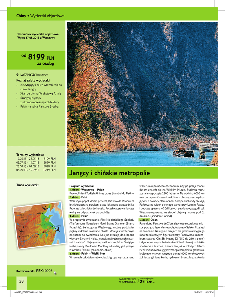 Chiny • Wycieczki objazdowe 10-dniowa wycieczka objazdowa Wylot 17.05.2013 z Warszawy od 8199 PLN za osobę LATAMY Z: Warszawy Poznaj zalety wycieczki: • • • • ekscytujący i pełen wrażeń rejs po rzece Jangcy Xi’an ze słynną Terakotową Armią Szanghaj słynący z ultranowoczesnej architektury Pekin – stolica Państwa Środka Terminy wyjazdów: 17.05.13 - 26.05.13 05.07.13 - 14.07.13 23.08.13 - 01.09.13 06.09.13 - 15.09.13 8199 PLN 8899 PLN 8899 PLN 8249 PLN Trasa wycieczki: Pekin Rejs Bus Przelot CHINY Xi’an Szanghaj Wuhan Chongqing Yichang rejs Hong Kong MORZE ŃSKIE WOCHI POŁUDNIO Kod wycieczki: Jangcy i chińskie metropolie Program wycieczki: 1. dzień: Warszawa – Pekin Przelot liniami Turkish Airlines przez Stambuł do Pekinu. 2. dzień: Pekin Wczesnym popołudniem przylecą Państwo do Pekinu i na lotnisku zostaną powitani przez lokalnego przewodnika. Przejazd z lotniska do hotelu. Po zakwaterowaniu czas wolny na odpoczynek po podróży. 3. dzień: Pekin W programie zwiedzania Plac Niebiańskiego Spokoju (Tian’anmen), Mauzoleum Mao i Brama Qianmen (Brama Przednia). Ze Wzgórza Węglowego można podziwiać piękny widok na Zakazane Miasto, które jest następnym miejscem do zwiedzania. Kolejną atrakcją dnia będzie wizyta w Świątyni Nieba, jednej z najważniejszych cesarskich świątyń. Największy pawilon kompleksu Świątyni Nieba, zwany Pawilonem Modlitwy o Urodzaj, jest jednym z symboli Pekinu. (śniadanie, obiad) 4. dzień: Pekin – Wielki Mur W ramach całodziennej wycieczki grupa wyrusza rano w kierunku północno-zachodnim, aby po przejechaniu 60 km znaleźć się na Wielkim Murze. Budowa muru została rozpoczęta 2500 lat temu. Na odcinku 6000 km miał on zapewnić cesarskim Chinom obronę przez wędrującymi z północy plemionami. Kolejne zachwyty czekają Państwa na widok pięknego parku przy Letnim Pałacu i podczas spaceru wśród licznych pawilonów, pagod i sal. Wieczorem przejazd na stację kolejową i nocna podróż do Xi’an. (śniadanie, obiad) 5. dzień: Xi’an Rano dotrą Państwo do Xi’an, dawnego cesarskiego miasta, początku legendarnego Jedwabnego Szlaku. Przejazd na śniadanie. Następnie przejazd do grobowca kryjącego 6000 terakotowych figur żołnierzy. Podziwianie mauzoleum cesarza Qin Shi Huang Di (259 do 210 r. p.n.e.) i słynnej na całym świecie Armii Terakotowej to bliskie spotkanie z historią. Cesarz ten już w młodych latach zlecił wybudowanie gigantycznego kompleksu grobowca, kryjącego w swym wnętrzu ponad 6000 terakotowych żołnierzy, gliniane konie, rydwany i broń z brązu. Armia PEK10905 58 zw0513_PEK10905.indd 58 10/25/12 10:32 PM Jangcy i chińskie metropolie Świadczenia wliczone w cenę: M przeloty liniami Turkish Airlines z Warszawy przez Stambuł do Pekinu i z Szanghaju przez Stambuł do Warszawy (klasa Economy, bezpłatny bagaż 20 kg), opłaty lotniskowe M wiza do Chin M wewnętrzne przeloty lokalnymi liniami M 1 przejazd nocnym pociągiem w wagonach I klasy M transfery, wycieczki i przejazdy po kraju autokarami M 4 noclegi w hotelach M 3 noclegi na statku w 2-osobowych kabinach zewnętrznych z prysznicem i WC M posiłki zgodnie z programem M bogaty program zwiedzania zgodnie z opisem oraz bilety wstępu Zakwaterowanie w hotelach: Terakotowa została odkryta przypadkowo, dopiero w roku 1974, podczas kopania studni przez chłopów. (śniadanie, obiad) 6. dzień: Xi’an – Chongqing – Jangcy Przed południem dotrą Państwo samolotem do Chongqing, górskiego miasta u zbiegu rzek Jangcy i Jialing Jiang. Na początek odbędzie się objazdowe zwiedzanie miasta. Następnie zaokrętowanie na statku i rozpoczęcie rejsu. (śniadanie, kolacja) 7.-8. dzień: rejs po rzece Jangcy Mająca ponad 6300 km długości Jangcy jest trzecią co do długości rzeką na świecie. Podczas rejsu będą mieli Państwo szansę zobaczyć wiele niezwykle ciekawych miejsc i widoków, m.in. wąwóz Wu otoczony skałami o niesamowitych kształtach. Jednym z ciekawszych momentów rejsu jest przełom i wąwóz Qutang. Najkrótszy, ale za to o najbardziej stromych brzegach, a zatem bardzo widowiskowy. Wyprawa lądowa zaprowadzi Państwa do miasta duchów Fengdu – według chińskich wierzeń to siedziba piekła! (śniadanie, obiad, kolacja) 9. dzień: Yichang – Wuhan – Szanghaj Dziś w Yichang Państwa rejs dobiega końca. Po zejściu na ląd autobusem udadzą się Państwo do Wuhan. Przelot krajowy do Szanghaju. Najbardziej nowoczesne z miast chińskich z pewnością Was zafascynuje! Po przylocie transfer do hotelu i czas wolny. (śniadanie, obiad) 10. dzień: Szanghaj – Warszawa Po śniadaniu wybierzecie się Państwo na przejazd przez starą część Szanghaju ze słynnym ogrodem Yu. Następnie zwiedzanie Muzeum Urbanistyki. Przejazd na lotnisko. Nocny przelot liniami Turkish Airlines przez Stambuł do Warszawy. (śniadanie, obiad) Minimalna liczba uczestników: 10 osób Uwaga: zastrzegamy sobie możliwość zmiany rozkładu lotów, hoteli oraz kolejności programu zwiedzania. Podczas zwiedzania uczestnicy wycieczki są pod opieką polskojęzycznego przewodnika (lub lokalnego przewodnika i tłumacza), który nie towarzyszy grupie podczas przelotu międzynarodowego. Sprawdź wycieczkę wpisując jej kod na www.tui.pl i dowiedz się więcej zw0513_PEK10905.indd 59 2 noce – Pekin Holiday Inn Changan West 1111 1 noc – nocny pociąg I klasa 1 noc – Xian Sunda Gentlemen 1111 3 noce – na statku kabina 2-osobowa 1 noc – Szanghaj Golden Riverview 1111 Opłaty na miejscu: m napiwki dla przewodników i kierowców 59 12-10-25 19:57