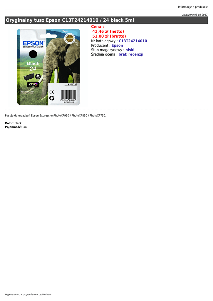Informacje o produkcie Utworzono 03-03-2017 Oryginalny tusz Epson C13T24214010 / 24 black 5ml Cena : 41,46 zł (netto) 51,00 zł (brutto) Nr katalogowy : C13T24214010 Producent : Epson Stan magazynowy : niski Średnia ocena : brak recenzji Pasuje do urządzeń Epson ExpressionPhotoXP950 / PhotoXP850 / PhotoXP750. Kolor: black Pojemność: 5ml Wygenerowano w programie www.oscGold.com