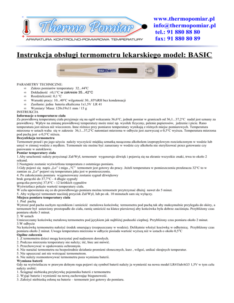 www.thermopomiar.pl [email protected] tel.: 91 880 88 80 fax: 91 880 80 89 Instrukcja obsługi termometru lekarskiego model: BASIC PARAMETRY TECHNICZNE: • Zakres pomiarów temperatury 32...440C • Dokładność ±0,1°C w zakresie 35...42°C • Rozdzielczość: 0,1 0C • Warunki pracy: 10...40°C wilgotność 30...85%RH bez kondensacji • Zasilanie: jedna bateria alkaliczna 1x1,5V LR 41 • Wymiary/ Masa: 128x19x11 mm / 15 g INSTRUKCJA Informacje o temperaturze ciała Za prawidłową temperaturę ciała przyjmuje się na ogół wskazania 36,6°C, jednak pomiar w granicach od 36,1...37,2°C nadal jest uznany za prawidłowy. Wpływ na zmianę prawidłowej temperatury może mieć np. wysiłek fizyczny, palenie papierosów, jedzenie i picie. Rano temperatura jest niższa niż wieczorem. Inne różnice przy pomiarze temperatury wynikają z różnych miejsc pomiarowych. Temperatura mierzona w ustach waha się w zakresie 36,1...37,2°C natomiast mierzona w odbycie jest zazwyczaj o 0,5°C wyższa. Temperatura mierzona pod pachą jest o 0,5°C niższa. Dezynfekcja termometru Termometr przed i po jego użyciu należy wyczyścić miękką szmatką nasączona alkoholem izopropylowym rozcieńczonym w wodzie lub umyć w zimnej wodzie z mydłem. Termometr nie możne być zanurzany w wodzie czy alkoholu nie sterylizować przez gotowanie czy parowanie w autoklawie. Pomiar temperatury ciała 1.Aby uruchomić należy przycisnąć Zał/Wył, termometr wygeneruje dźwięk i pojawią się na ekranie wszystkie znaki, trwa to około 2 sekund. 2.Następnie zostanie wyświetlona temperatura z ostatniego pomiaru. 3.Gdy pojawi się napis „Lo” i miga „°C” termometr jest gotowy do pracy. Jeżeli temperatura w pomieszczeniu przekracza 32°C to w zamian za „Lo” pojawi się temperatura jaka jest w pomieszczeniu. 4. Po zakończeniu pomiaru wygenerowany zostanie sygnał dźwiękowy brak gorączki do 37,7°C - 4 długie sygnały gorączka powyżej 37,8°C - 12 krótkich sygnałów Wyświetlacz pokaże wartość temperatury ciała. W celu upewnienia się co do prawidłowego pomiaru można termometr przytrzymać dłużej nawet do 5 minut. 5. Aby wyłączyć termometr naciśnij przycisk Zał/Wył, lub po ok. 10 minutach sam się wyłączy. Miejsca pomiaru temperatury ciała 1. Pod pachą Wytrzeć pod pacha suchym ręcznikiem i umieścić metalowa końcówkę termometru pod pachą tak aby maksymalnie przylegała do skóry, a termometr był ustawiony prostopadle do ciała, ramię umieścić na klatce piersiowej aby końcówka była dobrze zaciśnięta. Przybliżony czas pomiaru około 3 minut. 2. W ustach Umieszczamy końcówkę metalową termometru pod językiem jak najbliżej poduszki cieplnej. Przybliżony czas pomiaru około 2 minut. 3.W odbycie Na końcówkę termometru nałożyć środek smarujący (rozpuszczany w wodzie). Delikatnie włożyć kocówkę w odbytnicę. Przybliżony czas pomiaru około 2 minut. Uwaga temperatura mierzona w odbycie posiada wartość wyższą niż w ustach o około 0,5°C Ogólne zalecenia 1. Z termometru dzieci mogą korzystać pod nadzorem dorosłych. 2. Podczas mierzenia temperatury nie należy; iść, biec ani mówić. 3. Przechowywać w opakowaniu ochronnym. 4. Nie narażać termometru na bezpośrednie działanie promieni słonecznych, kurz , wilgoć, unikać skrajnych temperatur. 5. Nie upuszczać ani nie wstrząsać termometrem. 6. Nie należy rozmontowywać termometru poza wymiana baterii. Wymiana baterii Gdy na wyświetlaczu w prawym dolnym rogu pojawi się symbol baterii należy ja wymienić na nowa model LR41lubAG3 1,5V w tym celu należy zrobić: 1. Ściągnąć niebieską przykrywkę pojemnika baterii z termometru 2. Wyjąć baterie i wymienić na nową zachowując biegunowość. 3. Założyć niebieską osłonę na baterie – termometr jest gotowy do pomiaru.