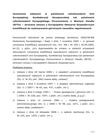 Uznawanie nabytych Europejskiej, w państwach Konfederacji członkowskich Szwajcarskiej lub Unii państwach członkowskich Europejskiego Porozumienia o Wolnym Handlu (EFTA) – stronach umowy o Europejskim Obszarze Gospodarczym kwalifikacji do wykonywania górniczych zawodów regulowanych Konieczność wdroŜenia do prawa polskiego dyrektywy 2005/36/WE Parlamenty Europejskiego i Rady z dnia 7 września 2005 r. w sprawie uznawania kwalifikacji zawodowych (Dz. Urz. WE L Nr 255 z 30.09.2005, str.22, z późn. zm) doprowadziła do zmiany w polskich przepisach dotyczących uznawania kwalifikacji zawodowych nabytych w państwach członkowskich Unii Europejskiej, Konfederacji Szwajcarskiej lub państwach członkowskich Europejskiego Porozumienia o Wolnym Handlu (EFTA) – stronach umowy o Europejskim Obszarze Gospodarczym. Podstawa prawna: 1) Ustawa z dnia 18 marca 2008 r. o zasadach uznawania kwalifikacji zawodowych nabytych w państwach członkowskich Unii Europejskiej (Dz. U. Nr 63, poz. 394) zwana dalej „ustawą”; 2) Ustawa z dnia 4 września 1997 r. o działach administracji rządowej (Dz. U. z 2007 r. Nr 65, poz. 437, z późn. zm.); 3) Ustawa z dnia 4 lutego 1994 r. – Prawo geologiczne i górnicze (Dz. U. z 2005 r. Nr 228, poz. 1947, z późn. zm.) zwana dalej „p.g.g”; 4) Ustawa z dnia 14 czerwca 1960 r. – Kodeks postępowania administracyjnego (Dz. U. z 2000 r. Nr 98, poz. 1071, z późn. zm.) zwana dalej „kodeksem”; 5) Ustawa z dnia 16 listopada 2006 r. o opłacie skarbowej (Dz. U. Nr 225, poz. 1635, z późn. zm.); 1/7 6) Rozporządzenie Ministra Środowiska z dnia 8 listopada 2007 r. w sprawie upowaŜnienia do uznawania kwalifikacji do wykonywania górniczych zawodów regulowanych (Dz. U. Nr 216, poz. 1612); 7) Rozporządzenie Ministra Nauki i Szkolnictwa WyŜszego z dnia 9 października 2008 r. w sprawie określenia wzorów formularzy wniosków o wszczęcie postępowania w sprawie uznania kwalifikacji zawodowych (Dz. U. Nr 187, poz. 1151); 8) Rozporządzenie Ministra Środowiska z dnia 22 stycznia 2009 r. w sprawie staŜu postępowania w adaptacyjnego sprawie i uznania testu umiejętności kwalifikacji do w toku wykonywania górniczych zawodów regulowanych (Dz. U. Nr 22, poz. 126); 9) Rozporządzenie Ministra Gospodarki z dnia 11 czerwca 2002 r. w sprawie kwalifikacji wymaganych od osób kierownictwa i dozoru ruchu zakładów górniczych, mierniczego górniczego i geologa górniczego oraz wykazu stanowisk w ruchu zakładu górniczego, które wymagają szczególnych kwalifikacji (Dz. U. Nr 84, poz. 755, z późn. zm.); 10) Rozporządzenie Ministra Gospodarki z dnia 15 grudnia 2005 r. w sprawie i specjalistów kwalifikacji wymaganych wykonujących czynności od osób kierownictwa w zakresie ratownictwa górniczego, zatrudnionych w podmiotach zawodowo trudniących się wykonywaniem czynności w zakresie ratownictwa górniczego (Dz. U. Nr 261, poz. 2186 oraz z 2007 r. Nr 204, poz. 1475); 11) § 28 i § 29 rozporządzenia Ministra Gospodarki z dnia 12 czerwca 2002 r. w sprawie ratownictwa górniczego (Dz. U. Nr 94 poz. 838, z późn. zm.) 12) Rozporządzenie Ministra Finansów z dnia 28 września 2007 r. w sprawie zapłaty opłaty skarbowej (Dz. U. Nr 187, poz. 1330). 2/7 Prezes WyŜszego Urzędu Górniczego (zwany dalej „organem właściwym”) uznaje nabyte w państwach członkowskich Unii Europejskiej, Konfederacji Szwajcarskiej lub państwach członkowskich Europejskiego Porozumienia o Wolnym Handlu (EFTA) – stronach umowy o Europejskim Obszarze Gospodarczym kwalifikacje do wykonywania górniczych zawodów regulowanych. I. Do postępowania w sprawie uznania kwalifikacji do wykonywania zawodu regulowanego w Rzeczypospolitej Polskiej stosuje się, z zastrzeŜeniem przepisów ustawy, przepisy kodeksu. II. Postępowanie w sprawie uznania kwalifikacji wszczyna się na wniosek (wyjątek dotyczy zawodów regulowanych związanych ze zdrowiem lub bezpieczeństwem publicznym, których niewłaściwe wykonywanie mogłoby naraŜać osoby, wobec których świadczona jest usługa transgraniczna, powaŜnej na szkody powaŜne dla niebezpieczeństwo zdrowia. Właściwy organ lub powstanie moŜe wszcząć postępowanie w sprawie uznania kwalifikacji, jeŜeli usługodawca zamierza świadczyć daną usługę na terytorium Rzeczypospolitej Polskiej po raz pierwszy). III. Wnioskodawca składa wniosek na formularzach udostępnianych nieodpłatnie przez organ właściwy lub przez ośrodek informacji właściwy do informowania w sprawach związanych z uznawaniem kwalifikacji zawodowych (Biuro Uznawalności Wykształcenia i Wymiany Międzynarodowej, ul. Ogrodowa 28/30, 00-896 Warszawa, tel.: 00 48 22 826 74 34, www.buwiwm.edu.pl). IV. Wnioskodawca zostaje powiadomiony o otrzymaniu przez organ właściwy wniosku w terminie miesiąca od jego otrzymania. W przypadku stwierdzenia braków formalnych, wnioskodawca zostaje wezwany do uzupełnienia wniosku pod rygorem pozostawienia wniosku bez rozpoznania. 3/7 V. Wniosek w sprawie uznania kwalifikacji składa się w języku polskim. Pisma i dokumenty w toku tego postępowania składa się w języku polskim lub wraz z tłumaczeniem na język polski dokonanym przez tłumacza przysięgłego. Tłumaczenie na język polski nie jest wymagane w przypadku dokumentów potwierdzających takie dane jak: 1. imię, nazwisko, datę i miejsce urodzenia wnioskodawcy, 2. obywatelstwo oraz nazwę państwa wnioskodawcy. VI. Wniosek o wszczęcie postępowania w sprawie uznania kwalifikacji do wykonywania zawodu regulowanego zawiera w szczególności: 1. imię, nazwisko, datę i miejsce urodzenia wnioskodawcy, 2. obywatelstwo oraz nazwę państwa wnioskodawcy, 3. określenie zawodu regulowanego, 4. informację o posiadanych kwalifikacjach i uprawnieniach, 5. informacje o odbytym kształceniu regulowanym, 6. wykaz dokumentów dołączanych do wniosku. VII. Z chwilą złoŜenia wniosku o wszczęcie postępowania w sprawie uznania kwalifikacji do wykonywania zawodu regul