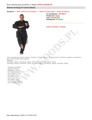 Karta informacyjna produktu w sklepie WWW.GOODS.PL Kimono do Kung Fu Czarne Deluxe Kategoria: » Broń i akcesoria treningowe » Ubiory do sztuk walki » Stroje do Kung Fu Nr katalogowy: 102-001/A Producent: Cimac Cena: 121,00 PLN Dostępność: Dostępny O D S. PL Zobacz produkt w sklepie W .G O Czarna mandarynowa góra, kołnierz, mankiety, chińskie zapięcie. Nogawki proste. Spodnie na gumkę z wiązaniem w pasie. 60% bawełna, 40% polyester. Rozmiary: 102-001/A: 120cm, 102-001/B: 130cm, 102-001/C: 140cm, 102-001/D: 150cm 102-005/A: 160cm, 102-005/B: 170cm, 102-005/C: 180cm, 102-005/D: 190cm, 102-005/E: 200cm W W Parametry produktu: • Rozmiar: 00/120 • Rozpiętość: 109 cm • Dł. rękawa(ramię): 47 cm • Szer. rękawa: 13 cm • Dł. rękawa: 31 cm • Dł. bluzy: 54 cm • Szer. pasa: 28 cm • Dł. spodni: 70 cm • Dł. nogawki: 46 cm • Szer. nogawki: 16 cm Data aktualizacji: 2016-11-25 09:15:01