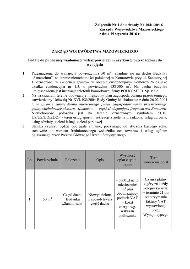 Załącznik Nr 1 do uchwały Nr 104/120/16 Zarządu Województwa Mazowieckiego z dnia 19 stycznia 2016 r. ZARZĄD WOJEWÓDZTWA MAZOWIECKIEGO Podaje do publicznej wiadomości wykaz powierzchni użytkowej przeznaczonej do wynajęcia Przeznaczona do wynajęcia powierzchnia 50 m2, znajduje się na dachu Budynku „Sanatorium”, na terenie nieruchomości położonej w Komorowie przy ul. Sanatoryjnej 1, oznaczonej w ewidencji gruntów w obrębie ewidencyjnym Komorów Wieś jako działka ewidencyjna nr 1/3, o powierzchni 138 500 m2. Na dachu budynku umiejscowiona jest instalacja telefonii komórkowej firmy POLKOMTEL Sp. z o.o. Na wskazanym terenie obowiązuje miejscowy plan zagospodarowania przestrzennego, zatwierdzony Uchwałą Nr XVI/108/2004 Rady Gminy Michałowice z dnia 26.02.2004 r. w sprawie zatwierdzenia miejscowego planu zagospodarowania przestrzennego gminy Michałowice obszaru „Komorów” – część II obejmująca fragment wsi Komorów. Nieruchomość położona jest na terenie oznaczonym symbolem d1.10. US/UZ/UO/ZL/ZP - teren usług sportu i rekreacji z zielenią urządzoną, usług zdrowia, usług oświaty, zieleni leśnej, zieleni parkowej. Stawka czynszu będzie podlegała zmianie, poczynając od stycznia każdego roku, stosownie do wzrostu średniorocznego wskaźnika cen towarów i usług ogółem ogłaszanego przez Prezesa Głównego Urzędu Statystycznego 1. 2. 3. Lp. 1. Powierzchnia 50 m2 Położenie Część dachu Budynku „Sanatorium” Opis Wysokość opłat z tytułu najmu Termin wnoszenia opłat Czynsz płatny - 5000 zł netto z góry za każdy miesięcznie/ 2 kolejny kwartał, m plus w terminie 21 dni Niewydzielona obowiązujący od otrzymania w sposób trwały podatek VAT faktury VAT + koszt część dachu wystawionej energii wg. przez wskazań Wynajmującego podlicznika