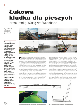 Łukowa kładka dla pieszych przez rzekę Wartę we Wronkach fot. GTI T. Galewski, Eurovia K. Kolosa Krzysztof Żółtowski, Mikołaj Binczyk Politechnika Gdańska Tymon Galewski GTI Gdańsk Od drugiej połowy XX wieku wzrasta zapotrzebowanie na infrastrukturę komunikacyjną w zakresie ciągów pieszych i rowerowych. Mosty dla pieszych cieszą się coraz większym zainteresowaniem. W Polsce dotychczas budowano przede wszystkim obiekty nad drogami i liniami kolejowymi w zurbanizowanych obszarach. Jednak ostatnio coraz częściej realizowane są kładki przez największe polskie rzeki [1], [2], [3]. 54 Fot. 1. Montaż przęsła nurtowego P rzykładem nowoczesnego podejścia do budowy ciągów pieszo-rowerowych jest kładka przez rzekę Wartę we Wronkach. Autorzy koncepcji architektonicznej i projektu budowlanego [4] postanowili zmienić wizerunek otoczenia i zaproponowali spektakularny obiekt o strukturze nawiązującej do najnowszych rozwiązań architektonicznych o przęsłach łukowych (rys. 1). Nowa kładka łączy północną część miasta z historycznym centrum. Lokalizacja kładki w wybranym miejscu poprawia komfort i bezpieczeństwo pieszych mieszkańców, którzy dotychczas korzystali jedynie z mostu drogowego w ciągu drogi wojewódzkiej. Cała przeprawa składa się z dwóch części: nurtowej i zalewowej. Na ich połączeniu zaplanowano wykonanie tarasu widokowego stanowiącego miejsce odpoczynku i obserwacji starówki miasta. Konstrukcja kładki (wg [4]) w części nurtowej składa się z trzech przęseł o rozpiętościach: 22,70 + 90,00 + 20,22 [m] (rys. 1). Główne przęsło zaprojektowano jako łukowe o jednym dźwigarze stalowym (rys. 2). Łuk z rur Ø711/16 ze stali S355J2H odchylony jest od pionu o 12° w kierunku górnej wody i oparty na masywnych żelbetowych podporach. Pomost kładki został zaprojektowany jako skrzynka stalowa o wysokości 555 mm i szerokości 3150 mm. Pomiędzy zamontowanymi poręczami wydzielono przestrzeń dla ruchu pieszego o szerokości 3 m. Skrzynka została oparta na poprzecznicach, które zamocowano przy pomocy sztywnych wieszaków do dźwigara łukowego. Projekt zawiera szereg nietypowych rozwiązań konstrukcyjnych. Niesymetryczne, mimośrodowe połączenie łuku z pomostem przez sztywne wieszaki już realizowano. Nie stosowano jednak wieszaków ukośnych. Połączenie pomostu z łukiem na podporach zaprojektowano niefortunnie, bez wykorzystania ściągu. Wątpliwości budziło także połączenie części łukowej z belkową. Tak zaprojektowana Rys. 1. Wizja architektoniczna i widok z boku na kładkę – wersja pierwotna projektu [4] Rys. 2. Przekrój poprzeczny przez przęsło łukowe – wersja pierwotna projektu mosty realizacje rz. Warta Rys. 3. Widok z boku na kładkę i model MES SOFiSTiK – wersja zmodyfikowana projektu. Źródło: KBP M. Binczyk konstrukcja cechowała się niekorzystnymi własnościami dynamicznymi [5]. Mając w pamięci doświadczenia z innych mostów [6], postanowiono na zlecenie wykonawcy przeprawy (firma EUROVIA-Polska) przeprojektować konstrukcję tak, aby przy utrzymaniu pierwotnego zamysłu architektonicznego wyeliminować powstałe w trakcie analiz wątpliwości [7]. Zrealizowany projekt wykonawczy W wyniku studiów nad innymi, zrealizowanymi obiektami i analiz własnych ostatecznie wprowadzono następujące modyfikacje projektu: • skrzynka stalowa podwieszona jest do łuku za pomocą wieszaków o geometrii jak w projekcie pierwotnym oraz dodatkowych wieszaków cięgnowych (rys. 3); • ortotropowa płyta pomostu została oparta na wspornikowych poprzecznicach, które utwierdzone są w stalowej skrzynce umiejscowionej niesymetrycznie po stronie łuku (rys. 5); • zrezygnowano z łuku poziomego; • zmieniono schemat statyczny, z łuku rozporowego na swobodnie podparty ze ściągiem w postaci skrzynki stalowej; Rys. 4. Model 3D konstrukcji stalowej. Źródło: GTI T. Galewski, A. Wojciechowski – Projekt Warsztatowy Rys. 5. Przekrój poprzeczny przez przęsło łukowe – wersja zmodyfikowana projektu Źródło: GTI T. Galewski, T. Janowski – Projekt Wyposażenia Otwory do zabetonowania zastrzałów rurowych Element montażowy Krawędzie zeszlifować Rys. 6. Węzły połączenia wieszaków do łuku i węzeł podporowy. Źródło: GTI T. Galewski, A. Wojciechowski – Projekt Warsztatowy 55 Inwestor: Miasto Wronki. Wykonawca: Eurovia Polska SA. Projektant projektu budowlanego: Pracownia Most-Arch, Pracownia Projektowa MOST. Zrealizowany projekt wykonawczy: GTI Tymon Galewski, KBP Żółtowski. fot. Eurovia K. Kolosa Fot. 2. Kładka w okresie procedur odbiorowych Fot. 3. Kładka w okresie procedur odbiorowych 5. Żółtowski K., Binczyk M.: Łukowa kładka dla pieszych przez Wartę we Wronkach. Zmiana konstrukcji w wyniku analiz dynamicznych. „Inżynieria Morska i Geotechnika”, nr 5/2014. 6. Żółtowski K.: Pieszy na kładkach: obciążenia i odpowiedź konstrukcji. Wydawnictwo Politechniki Gdańskiej, Gdańsk 2007. 7. Żółtowski K., Kłosin Ł.: Projekt wykonawczy konstrukcji kładki przez Rzekę Wartę we Wronkach. Wykonawca: GTI i KBP. Zlecający: Eurovia Polska SA. 2014. 56 fot. KBP K. Żółtowski Uczestnicy procesu budowlanego: fot. Eurovia K. Kolosa Piśmiennictwo 1. Biliszczuk J., Machelski Cz., Onysyk J., Węgrzyniak M., Prabuski P.: Kładki dla pieszych jako punkty orientacyjne na autostradzie. „Inżynieria i Budownictwo”, nr 11/2001. 2. Biliszczuk J., Hawryszków P., Węgrzyniak M., Maury A., Sułkowski M.: Podwieszona kładka dla pieszych z drewna klejonego w Sromowcach Niżnych. „Inżynieria i Budownictwo”, nr 1-2/2008. 3. Żółtowski K., Romaszkiewicz T.: Kładka przez Wisłę w Krakowie. Cechy dynamiczne i ich wpływ na ostateczną formę konstrukcyjną obiektu, „Zeszyty Naukowe Politechniki Rzeszowskiej”, Rzeszów 2011. 4. Projekt budowlany i wykonawczy Kładki dla pieszych przez rzekę Wartę w ramach inwestycji: „Budowa wielofunkcyjnego ośrodka rekreacyjn