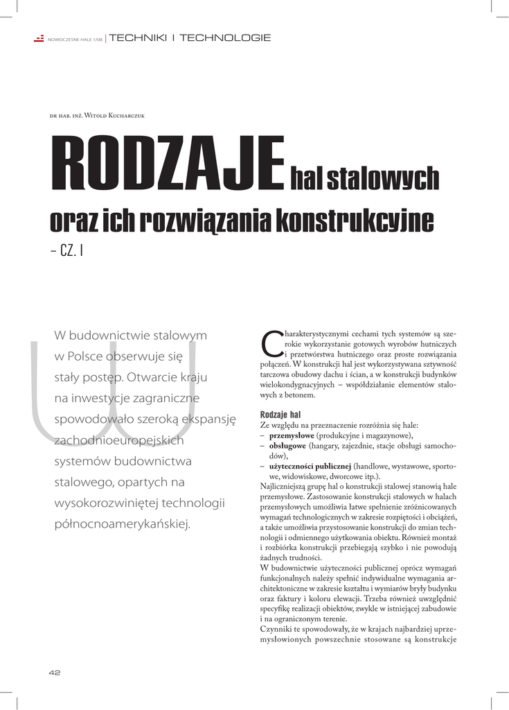 NOWOCZESNE HALE 1/08 | TECHNIKI I TECHNOLOGIE dr hab. in. Witold Kucharczuk RODZAJE hal stalowych oraz ich rozwiązania konstrukcyjne – CZ. I w W budownictwie stalowym w Polsce obserwuje się stały postęp. Otwarcie kraju na inwestycje zagraniczne spowodowało szeroką ekspansję zachodnioeuropejskich systemów budownictwa stalowego, opartych na wysokorozwiniętej technologii północnoamerykańskiej. 42 C harakterystycznymi cechami tych systemów są szerokie wykorzystanie gotowych wyrobów hutniczych i przetwórstwa hutniczego oraz proste rozwiązania połączeń. W konstrukcji hal jest wykorzystywana sztywność tarczowa obudowy dachu i ścian, a w konstrukcji budynków wielokondygnacyjnych – współdziałanie elementów stalowych z betonem. Rodzaje hal Ze względu na przeznaczenie rozróżnia się hale: – przemysłowe (produkcyjne i magazynowe), – obsługowe (hangary, zajezdnie, stacje obsługi samochodów), – użyteczności publicznej (handlowe, wystawowe, sportowe, widowiskowe, dworcowe itp.). Najliczniejszą grupę hal o konstrukcji stalowej stanowią hale przemysłowe. Zastosowanie konstrukcji stalowych w halach przemysłowych umożliwia łatwe spełnienie zróżnicowanych wymagań technologicznych w zakresie rozpiętości i obciążeń, a także umożliwia przystosowanie konstrukcji do zmian technologii i odmiennego użytkowania obiektu. Również montaż i rozbiórka konstrukcji przebiegają szybko i nie powodują żadnych trudności. W budownictwie użyteczności publicznej oprócz wymagań funkcjonalnych należy spełnić indywidualne wymagania architektoniczne w zakresie kształtu i wymiarów bryły budynku oraz faktury i koloru elewacji. Trzeba również uwzględnić specyfikę realizacji obiektów, zwykle w istniejącej zabudowie i na ograniczonym terenie. Czynniki te spowodowały, że w krajach najbardziej uprzemysłowionych powszechnie stosowane są konstrukcje TECHNIKI I TECHNOLOGIE | NOWOCZESNE HALE 1/08 szkieletowe, a przede wszystkim lekkie konstrukcje stalowe. Ze względów ekonomicznych inwestycje powinny być realizowane szybko. Aby to umożliwić, elementy konstrukcji i obudowy budynków należy wytwarzać metodami przemysłowymi, a ich montaż winien być łatwy i szybki. W warunkach gospodarki zarządzanej centralnie wymagania te najlepiej spełniały konstrukcje systemowe. Najczęściej stosowanymi w Polsce systemami konstrukcyjno-technologicznymi były: – w budownictwie przemysłowym – Zintegrowany System Lekkich Stalowych Hal Ocieplonych „Mostostal”, – w budownictwie ogólnym – Zintegrowany System Lekkiego Szkieletu Stalowego – ZLS. Systemy zawierały zbiory elementów konstrukcyjnych o zunifikowanych połączeniach oraz zestawy projektów typowych i powtarzalnych (kodowych). Posługiwanie się skończonym zestawem elementów było dogodne ze względów wykonawczych, lecz ograniczało możliwości racjonalnego projektowania. Obecnie, w warunkach dużej konkurencji na rynku budowlanym konstrukcję obiektu należy projektować w dostosowaniu do indywidualnych wymagań architektonicznych i użytkowych. Wiele rozwiązań systemowych zachowało aktualność i mogą być nadal stosowane w indywidualnych projektach obiektów o prostej architekturze, takich jak hale produkcyjne, handlowe i magazynowe, o rozpiętościach do 36 m. Rozwiązania konstrukcyjne hal o większych rozpiętościach (hale sportowe, widowiskowe itp.) oraz o specjalnym przeznaczeniu (np. hangary lotnicze) powinny być opracowywane indywidualnie, odpowiednio do funkcji obiektu i jego formy architektonicznej. Wybrane przykłady takich typów hal zostaną omówione w innym artykule. Moduł konstrukcyjny, określający położenie osi elementów konstrukcyjnych w planie, przyjęto jako wielokrotność modułu funkcjonalnego. W obiektach o konstrukcji i obudowie projektowanych indywidualnie stosowanie wymiarów modułowych jest zalecane, lecz nieobowiązujące. W obliczeniach statycznych hal przyjmuje się następujące obciążenia: – obciążenia stałe wg PN-82/B – 02001; – obciążenie śniegiem wg PN-80/B – 02010/Az1: 2006; stosunku do PN-80/B – 02010 wprowadzono nową mapę podziału Polski na strefy obciążenia śniegiem gruntu, nowe wartości charakterystyczne obciążenia śniegiem i nowy (zwiększony) współczynnik obciążenia; – obciążenie wiatrem wg PN-77/B – 02011; – obciążenia suwnicami wg PN-86/B – 02005; – obciążenia instalacjami, które należy ustalać indywidualnie w zależności od przewidywanego wyposażenia instalacyjnego hali. W szczególnych przypadkach konieczne może być uwzględnienie dodatkowych obciążeń związanych z technologią produkcji, np. obciążenie pyłem. Zasady ustalania wartości obciążeń są podane w PN82/B-02000. W obliczeniach należy uwzględnić obciążenia występujące w stadiach eksploatacji i montażu, a w szczególnych przypadkach także w stadiach wykonania, transportu, magazynowania i naprawy elementów konstrukcji. Obliczenia należy wykonywać z uwzględnieniem najbardziej niekorzystnych kombinacji obciążeń. Kombinacje obciążeń ustala się w zależności od rozpatrywanego stanu granicznego wg PN76/B – 03001. Konstrukcje hal w budownictwie ogólnym i przemysłowym są wykonane głównie ze stali niestopowych konstrukcyjnych wg PN-EN10025-2: 2005/U/. Ogólne zasady projektowania konstrukcji hal Rozstawy słupów oraz wysokość hal systemowych przyjmowano według zasad koordynacji modularnej [1]. W systemach hal przemysłowych przyjęto moduł poziomy konstrukcji równy 3 m i jego parzystą wielokrotność oraz moduł pionowy równy 1,2 m. Zasady usytuowania elementów konstrukcji względem osi modularnych w Zintegrowanym Systemie Hal „Mostostal” przedstawiono na rys. 1. Słupy ścian podłużnych i szczytowych usytuowano w tym systemie stycznie do osi siatki modularnej, a wysokość modularną hali przyjęto jako równą wysokości ścian. Umożliwiło to maksymalną unifika