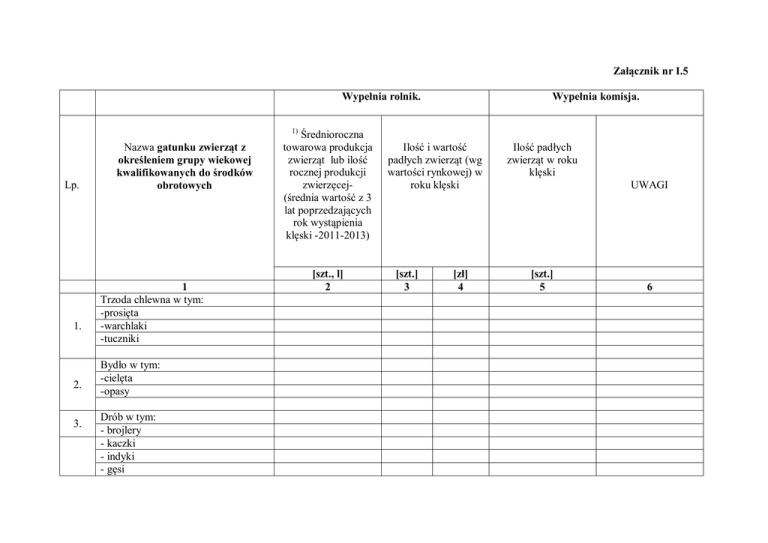 Załącznik nr I.5 Wypełnia rolnik. Wypełnia komisja. 1) Lp. 1. 2. 3. Nazwa gatunku zwierząt z określeniem grupy wiekowej kwalifikowanych do środków obrotowych 1 Trzoda chlewna w tym: -prosięta -warchlaki -tuczniki Bydło w tym: -cielęta -opasy Drób w tym: - brojlery - kaczki - indyki - gęsi Średnioroczna towarowa produkcja zwierząt lub ilość rocznej produkcji zwierzęcej(średnia wartość z 3 lat poprzedzających rok wystąpienia klęski -2011-2013) [szt., l] 2 Ilość i wartość padłych zwierząt (wg wartości rynkowej) w roku klęski [szt.] 3 [zł] 4 Ilość padłych zwierząt w roku klęski UWAGI [szt.] 5 6 4. Inna produkcja zwierzęca: np. - jaja kurze - mleko RAZEM: 1) Należy podać średnią roczną produkcję zwierząt lub średnią wartość produkcji zwierzęcej (w przypadku produkcji mleka, jaj, wełny itp.) z 3 lat poprzedzających rok wystąpienia klęski niezależnie od tego czy powstały straty w pogłowiu zwierząt w roku klęski. Data szacunku szkód:…………………………… Podpisy Członków Komisji:……………………....