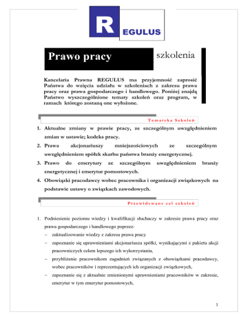 R EGULUS szkolenia Prawo pracy Kancelaria Prawna REGULUS ma przyjemność zaprosić Państwa do wzięcia udziału w szkoleniach z zakresu prawa pracy oraz prawa gospodarczego i handlowego. PoniŜej znajdą Państwo wyszczególnione tematy szkoleń oraz program, w ramach którego zostaną one wyłoŜone. Tematyka Szkoleń 1. Aktualne zmiany w prawie pracy, ze szczególnym uwzględnieniem zmian w ustawie; kodeks pracy. 2. Prawa akcjonariuszy mniejszościowych ze szczególnym uwzględnieniem spółek skarbu państwa branŜy energetycznej. 3. Prawo do emerytury ze szczególnym uwzględnieniem branŜy energetycznej i emerytur pomostowych. 4. Obowiązki pracodawcy wobec pracownika i organizacji związkowych na podstawie ustawy o związkach zawodowych. Przewidywany cel szkoleń 1. Podniesienie poziomu wiedzy i kwalifikacji słuchaczy w zakresie prawa pracy oraz prawa gospodarczego i handlowego poprzez: − zaktualizowanie wiedzy z zakresu prawa pracy − zapoznanie się uprawnieniami akcjonariusza spółki, wynikającymi z pakietu akcji pracowniczych celem lepszego ich wykorzystania, − przybliŜenie pracownikom zagadnień związanych z obowiązkami pracodawcy, wobec pracowników i reprezentujących ich organizacji związkowych, − zapoznanie się z aktualnie zmienionymi uprawnieniami pracowników w zakresie, emerytur w tym emerytur pomostowych, 1 R EGULUS − zapoznanie się ze sposobami oraz technikami negocjacyjnymi słuŜącymi uzyskaniu lepszych efektów podczas negocjowania dokumentów zakładowego prawa pracy. 2. Zwiększenie efektywności i jakości działań związków zawodowych oraz słuŜb kadrowych pracodawcy poprzez: − rozpoznanie prawnych moŜliwości współdziałania reprezentujących pracowników organizacji związkowych z pracodawcą w celu jak najlepszego realizowania prawnych obowiązków wobec pracowników, − rozpoznanie prawnych moŜliwości współdziałania związków zawodowych, współdziałających z pracodawcą na podstawie ustawy o związkach zawodowych − rozpoznanie prawnych moŜliwości współdziałania akcjonariuszy pracowniczych ze spółką na podstawie praw płynących z posiadanych przez nich akcji pracowniczych, − zaktualizowanie wiedzy na temat prawa do emerytury w tym do emerytur pomostowych. WYKŁADOWCY Magda Trębacz radca prawny, , współpracownik kancelarii prawnych Marcin Szymanek – konsultant prawny, doktorant prawa w Katedrze Prawa Pracy Polskiej Akademii Naukowej , współpracownik kancelarii prawnych. KOSZT SZKOLENIA Koszt szkolenia wynosi 170 zł brutto za osobę szkoloną. W cenę wliczone są: materiały szkoleniowe materiały pomocnicze dojazd wykładowców 2 R EGULUS POGRAM- PROPOZYCJA PoniŜej przedstawiamy program szkoleń dla wybranych tematów Plan zajęć na dzień 07.10.2009. LP 1 Zajęcia w godzinach Tematy zajęć 1. Wprowadzenie do tematów 2. Aktualne zmiany w prawie pracy z uwzględnieniem tendencji ustawodawczych 9.00-9.45 3. Aktualne zmiany w ustawie; kodeks pracy 2 Zajęcia w 1. Akcje pracownicze godzinach 2. Prawa akcjonariuszy mniejszościowych 10.00-10.45 3 4 Zajęcia w 1. Prawo do dywidendy godzinach 2. SkaŜenie uchwał 3. Obrót akcjami 11.00 – 11.45 Zajęcia w 1. Prawo do emerytury - zagadnienia ogólne godzinach 2. Prawo do emerytury ze szczególnym uwzględnieniem branŜy energetycznej 12.00-12.45 13.00-13.45 1. Emerytury pomostowe 2. Sposób wyliczania emerytur pomostowych 5 14.00 -15.00 6 Zajęcia w Obowiązki pracodawcy wobec pracownika i organizacji godzinach związkowych na podstawie ustawy o związkach zawodowych – 15.15 – 16.00 wprowadzenie. Przerwa obiadowa 3 R 7 EGULUS Zajęcia w godzinach Rozwinięcie poszczególnych uprawnień - przykłady 16.15 – 17.00 Plan zajęć na dzień 08.10.2009. 7 Zajęcia w godzinach podsumowanie szkoleń z zakresu uprawnień akcjonariatu pracowniczego – dyskusja. 9.00-9.45 Zajęcia w podsumowanie szkoleń z zakresu emerytur pomostowych – dyskusja godzinach 10.00-10.45 razie wszelkich pytań jesteśmy do Państwa dyspozycji pod numerami telefonów: (22) 6540039, 890 03 84 lub 0/692 64 68 18. Więcej informacji o kancelarii znajdziecie Państwo na stronie internetowej www.kancelaria-regulus.pl Z wyrazami szacunku, 4