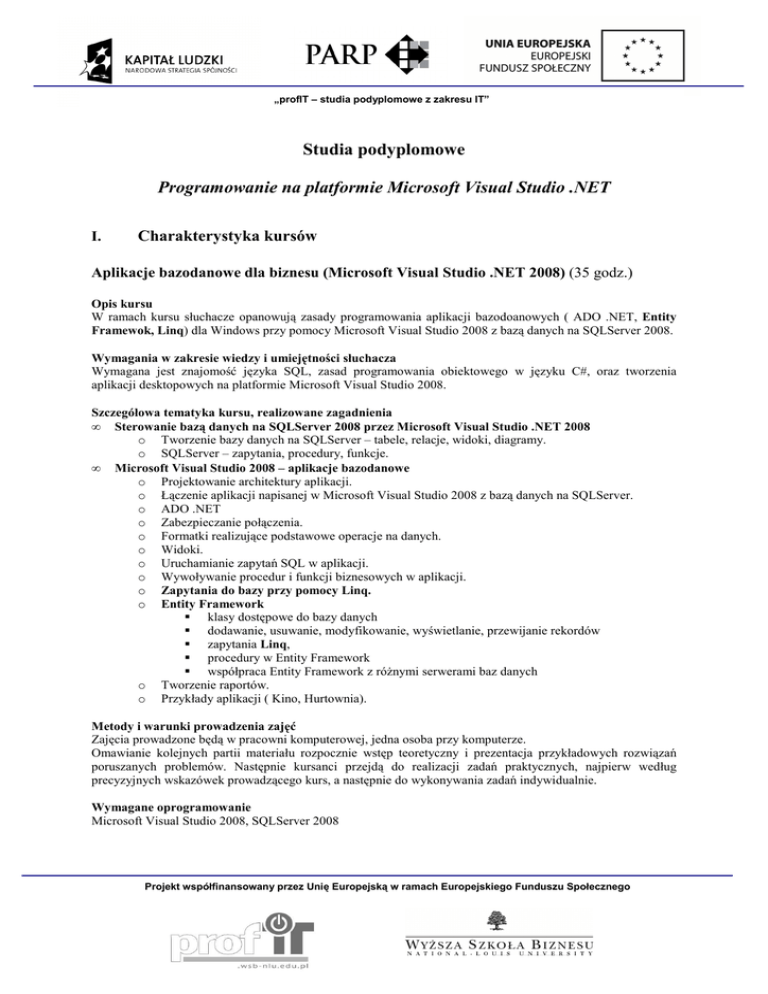 „profIT – studia podyplomowe z zakresu IT” Studia podyplomowe Programowanie na platformie Microsoft Visual Studio .NET I. Charakterystyka kursów Aplikacje bazodanowe dla biznesu (Microsoft Visual Studio .NET 2008) (35 godz.) Opis kursu W ramach kursu słuchacze opanowują zasady programowania aplikacji bazodoanowych ( ADO .NET, Entity Framewok, Linq) dla Windows przy pomocy Microsoft Visual Studio 2008 z bazą danych na SQLServer 2008. Wymagania w zakresie wiedzy i umiejętności słuchacza Wymagana jest znajomość języka SQL, zasad programowania obiektowego w języku C#, oraz tworzenia aplikacji desktopowych na platformie Microsoft Visual Studio 2008. Szczegółowa tematyka kursu, realizowane zagadnienia • Sterowanie bazą danych na SQLServer 2008 przez Microsoft Visual Studio .NET 2008 o Tworzenie bazy danych na SQLServer – tabele, relacje, widoki, diagramy. o SQLServer – zapytania, procedury, funkcje. • Microsoft Visual Studio 2008 – aplikacje bazodanowe o Projektowanie architektury aplikacji. o Łączenie aplikacji napisanej w Microsoft Visual Studio 2008 z bazą danych na SQLServer. o ADO .NET o Zabezpieczanie połączenia. o Formatki realizujące podstawowe operacje na danych. o Widoki. o Uruchamianie zapytań SQL w aplikacji. o Wywoływanie procedur i funkcji biznesowych w aplikacji. o Zapytania do bazy przy pomocy Linq. o Entity Framework klasy dostępowe do bazy danych dodawanie, usuwanie, modyfikowanie, wyświetlanie, przewijanie rekordów zapytania Linq, procedury w Entity Framework współpraca Entity Framework z róŜnymi serwerami baz danych o Tworzenie raportów. o Przykłady aplikacji ( Kino, Hurtownia). Metody i warunki prowadzenia zajęć Zajęcia prowadzone będą w pracowni komputerowej, jedna osoba przy komputerze. Omawianie kolejnych partii materiału rozpocznie wstęp teoretyczny i prezentacja przykładowych rozwiązań poruszanych problemów. Następnie kursanci przejdą do realizacji zadań praktycznych, najpierw według precyzyjnych wskazówek prowadzącego kurs, a następnie do wykonywania zadań indywidualnie. Wymagane oprogramowanie Microsoft Visual Studio 2008, SQLServer 2008 Projekt współfinansowany przez Unię Europejską w ramach Europejskiego Funduszu Społecznego „profIT – studia podyplomowe z zakresu IT” ASP - aplikacje internetowe ( Microsoft Visual Studio .NET 2008) (35 godz.) Opis kursu W ramach kursu słuchacze opanowują zasady programowania aplikacji internetowych przy pomocy ASP .NET na platformie Microsoft Visual Studio 2008. Wymagania w zakresie wiedzy i umiejętności słuchacza Wymagana jest znajomość zasad programowania obiektowego w języku C# oraz języka SQL. Szczegółowa tematyka kursu, realizowane zagadnienia • Wprowadzenie o Formatowanie treści o Grafika o Odnośniki o Formularze o CSS • Wstęp do ASP .NET o Środowisko pracy o Strony internetowe o Obsługa zdarzeń o Kontrolki HTML o Kontrolki Web • Przechwytywanie błędów na stronie i obsługa wyjątków • Strony wzorcowe ASP, mapy witryny, kontrolki nawigacyjne • Zarządzanie wyglądem witryny ( motywy, tematy) • Podstawy baz danych w ASP – podstawowe operacje na bazie danych ( GridView, DetailsView, Repeater) • Entity Framework w ASP – model dostępowy do bazy danych • Entity Framework w ASP – operacje na rekordach bazy, Linq, procedury. • Uwierzytelnianie i autoryzacja • Stan aplikacji i stan sesji • WebParts • ASP .NET AJAX • Kontrolki Toolkit Metody i warunki prowadzenia zajęć Zajęcia prowadzone będą w pracowni komputerowej, jedna osoba przy komputerze. Omawianie kolejnych partii materiału rozpocznie wstęp teoretyczny i prezentacja przykładowych rozwiązań poruszanych problemów. Następnie kursanci przejdą do realizacji zadań praktycznych, najpierw według precyzyjnych wskazówek prowadzącego kurs, a następnie do wykonywania zadań indywidualnie. Wymagane oprogramowanie Microsoft Visual Studio 2008, SQLServer 2008 Projekt współfinansowany przez Unię Europejską w ramach Europejskiego Funduszu Społecznego „profIT – studia podyplomowe z zakresu IT” Programowanie aplikacji dla Windows (20 godz.) Opis kursu W ramach kursu słuchacze opanowują zasady programowania aplikacji dla Windows przy pomocy Microsoft Visual Studio 2008. Wymagania w zakresie wiedzy i umiejętności słuchacza Wymagana jest znajomość zasad programowania obiektowego w języku C#. Szczegółowa tematyka kursu, realizowane zagadnienia • Środowisko Microsoft Visual Studio 2008 – kompilator, debugger • Windows Forms. Wykorzystanie, właściwości i zdarzenia kontrolek: o Button o TextBox o Label o CheckBox o ComboBox o MenuStrip o ContextMenuStrip o ColorDialog o FontDialog o ImageList o ListBox o MaskedTextBox o OpenFileDialog o Panel o RichTextBox o SaveFileDialog o StatusStrip o TabControl o TextBox o Timer • Dziedziczenie formatek • Zmiana kształtu formatki • Sterowanie formatką przez XML • Rysowanie na formatce • Okienka MDI • UserControl – tworzenie i dziedziczenie Metody i warunki prowadzenia zajęć Zajęcia prowadzone będą w pracowni komputerowej, jedna osoba przy komputerze. Omawianie kolejnych partii materiału rozpocznie wstęp teoretyczny i prezentacja przykładowych rozwiązań poruszanych problemów. Następnie kursanci przejdą do realizacji zadań praktycznych - najpierw według precyzyjnych wskazówek prowadzącego kurs, a następnie do wykonywania zadań indywidualnie. Wymagane oprogramowanie Microsoft Visual Studio 2008 Projekt współfinansowany przez Unię Europejską w ramach Europejskiego Funduszu Społecznego „profIT – studia podyplomowe z zakresu IT” Programowanie w języku C# (35 godz.) Opis kursu W ramach kursu słuchacze opanowują zasady programowania obiektowego na przykładzie języka C#. Wymagania w zakresie wiedzy i umiejętności słuchacza Zakładana jest znajomość systemu operacyjnego Windows, oraz elementarna znajomość programowania strukturalnego. Szcze